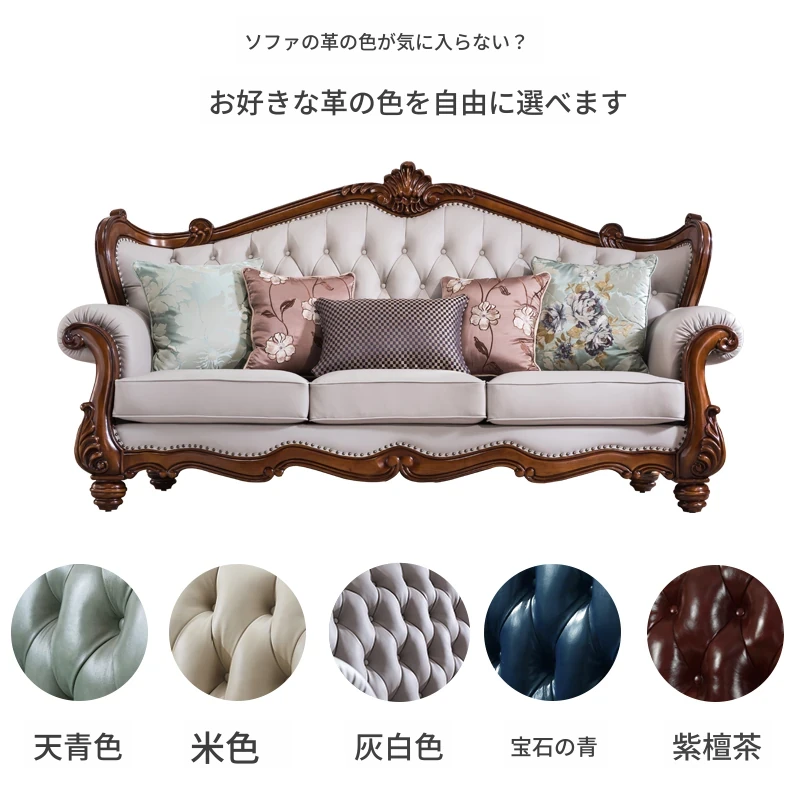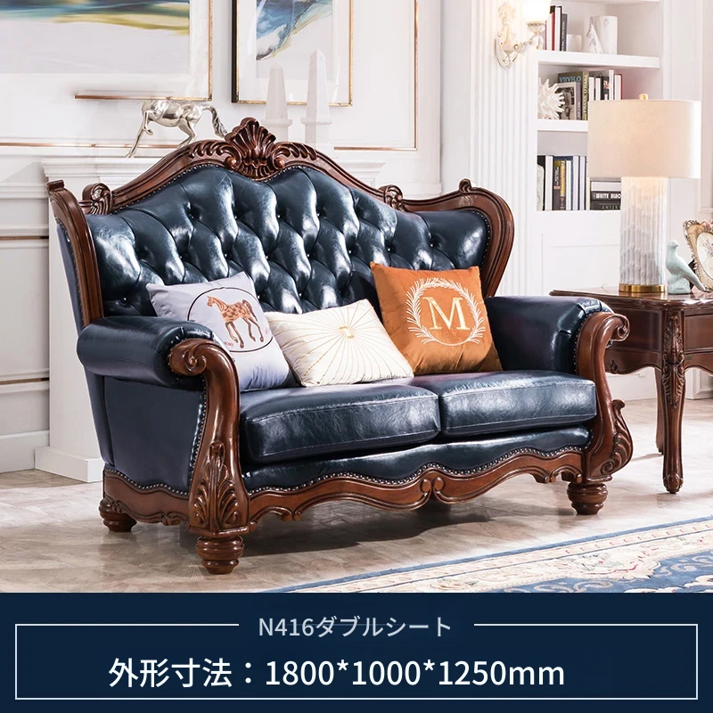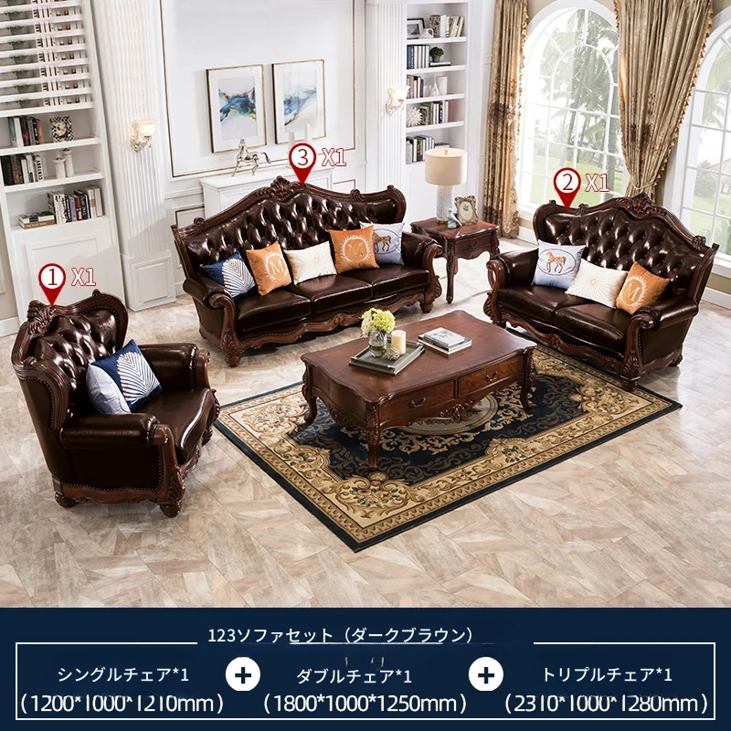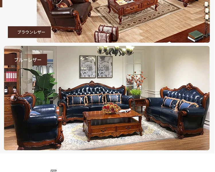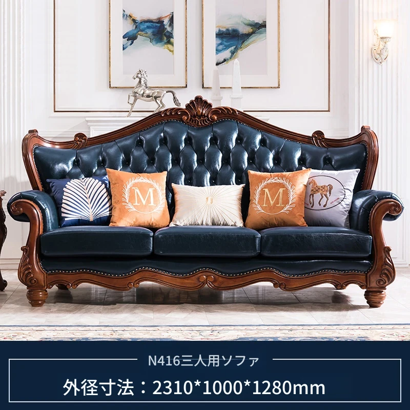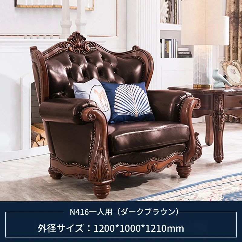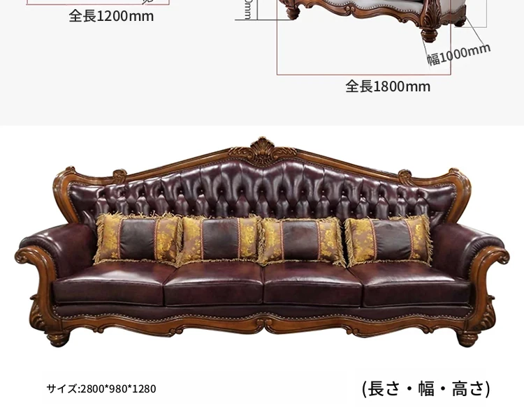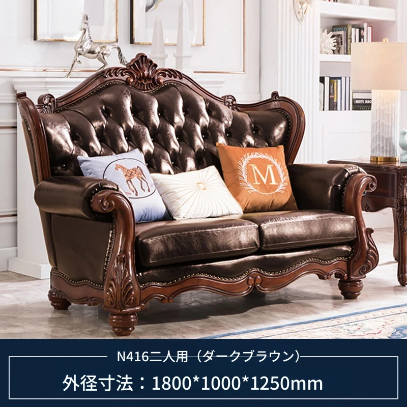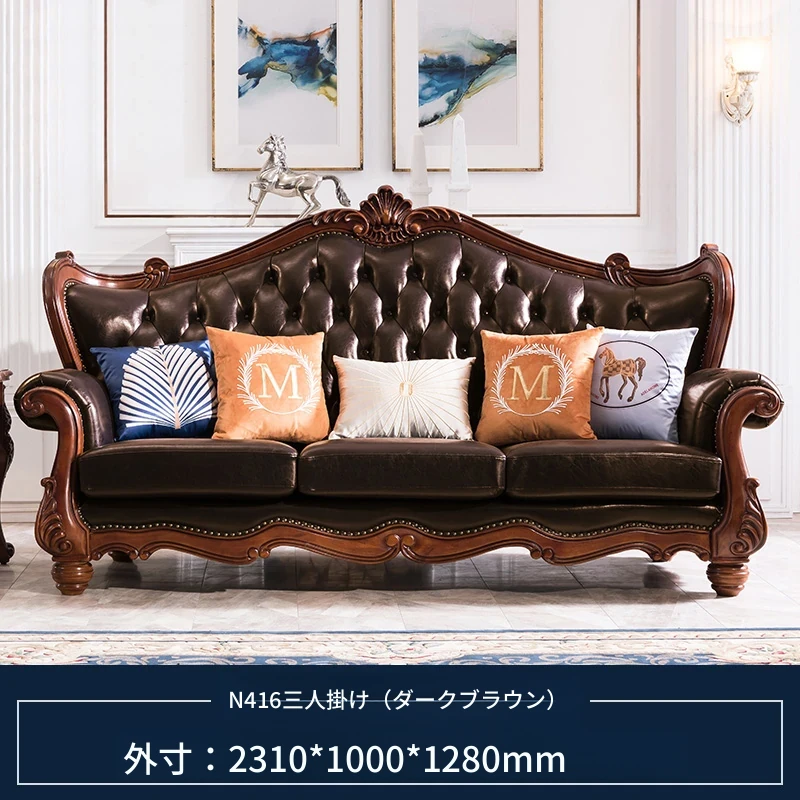 アメリカンスタイルのフルウッド&レザーソファとコーヒーテーブルのセット - ヴィンテージ感漂う欧式デザイン、大小様々な部屋にぴったりな3人掛け、精巧な彫刻が施された高級感溢れる家具。