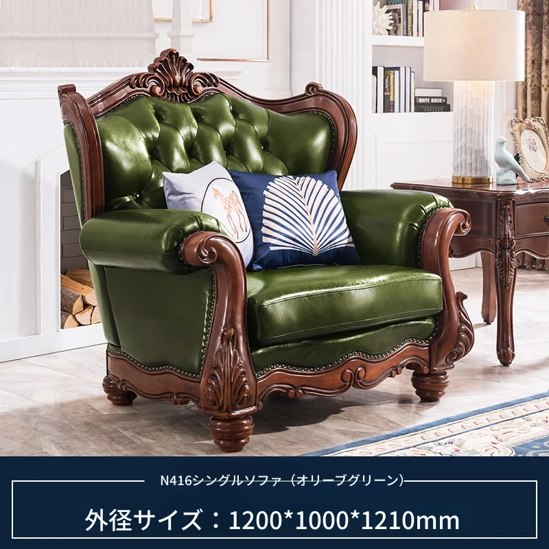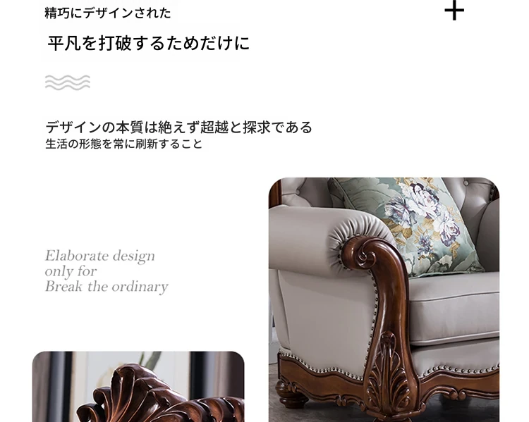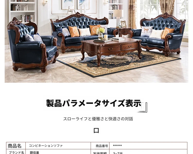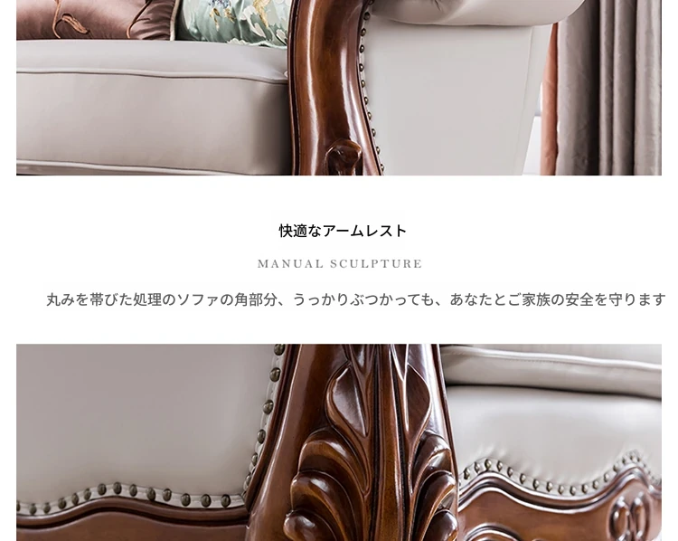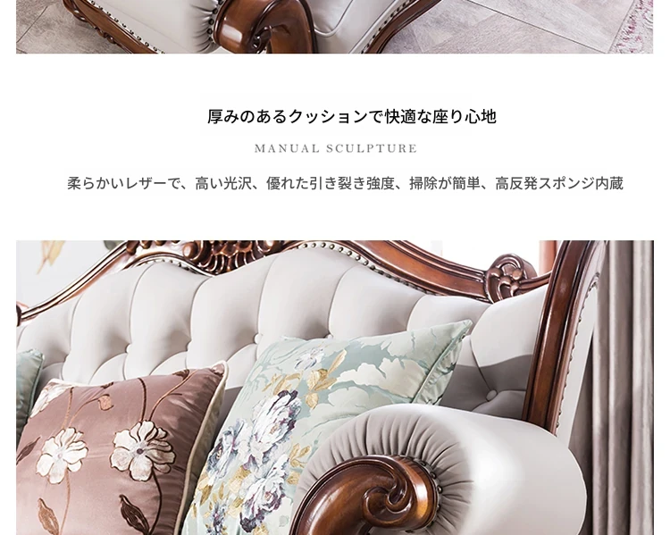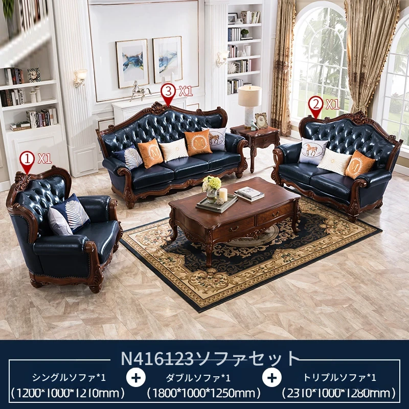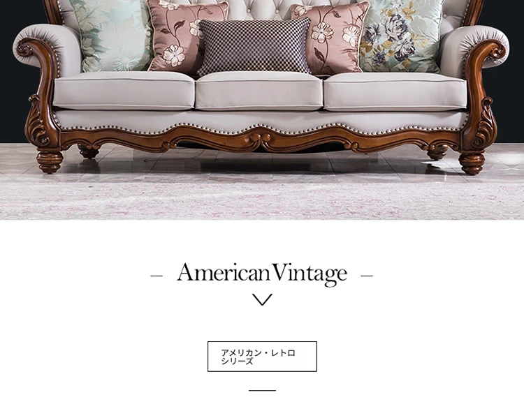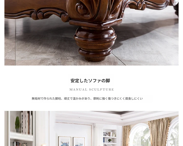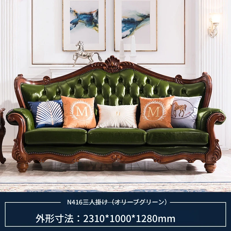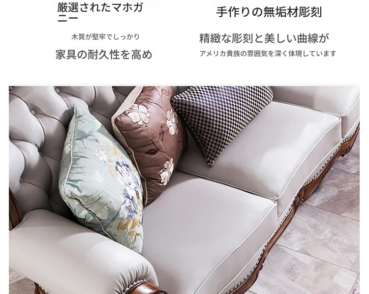 アメリカンスタイルのフルウッド&レザーソファとコーヒーテーブルのセット - ヴィンテージ感漂う欧式デザイン、大小様々な部屋にぴったりな3人掛け、精巧な彫刻が施された高級感溢れる家具。