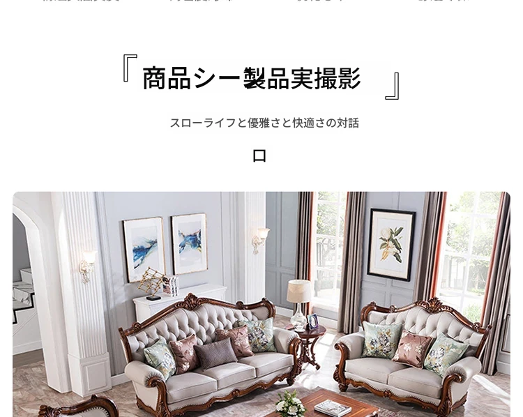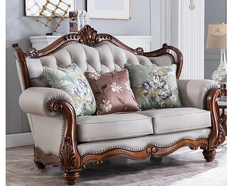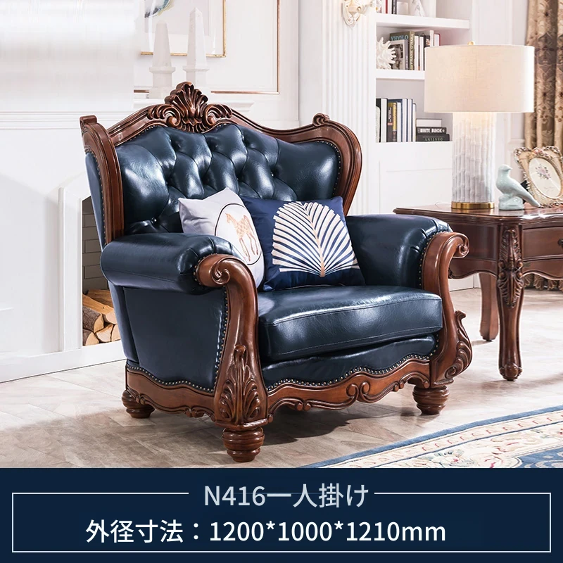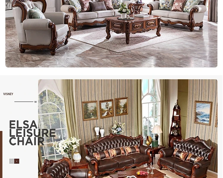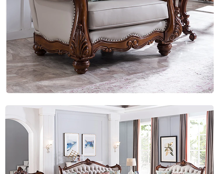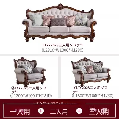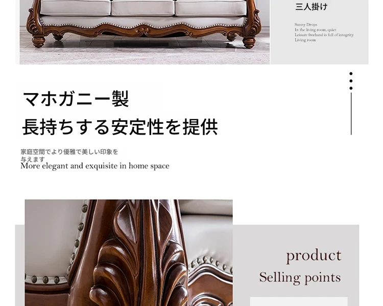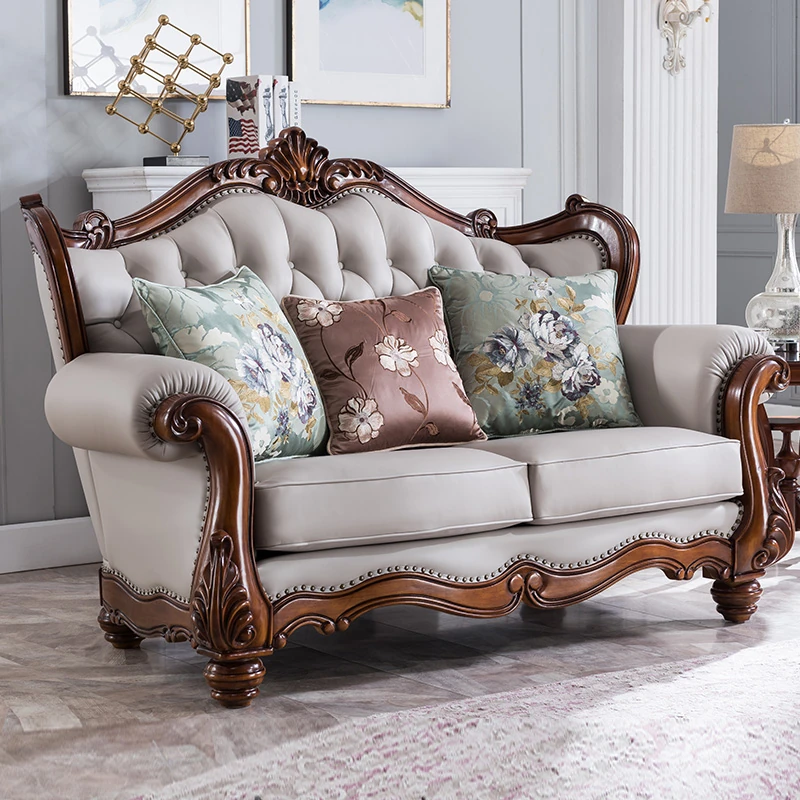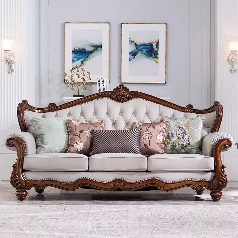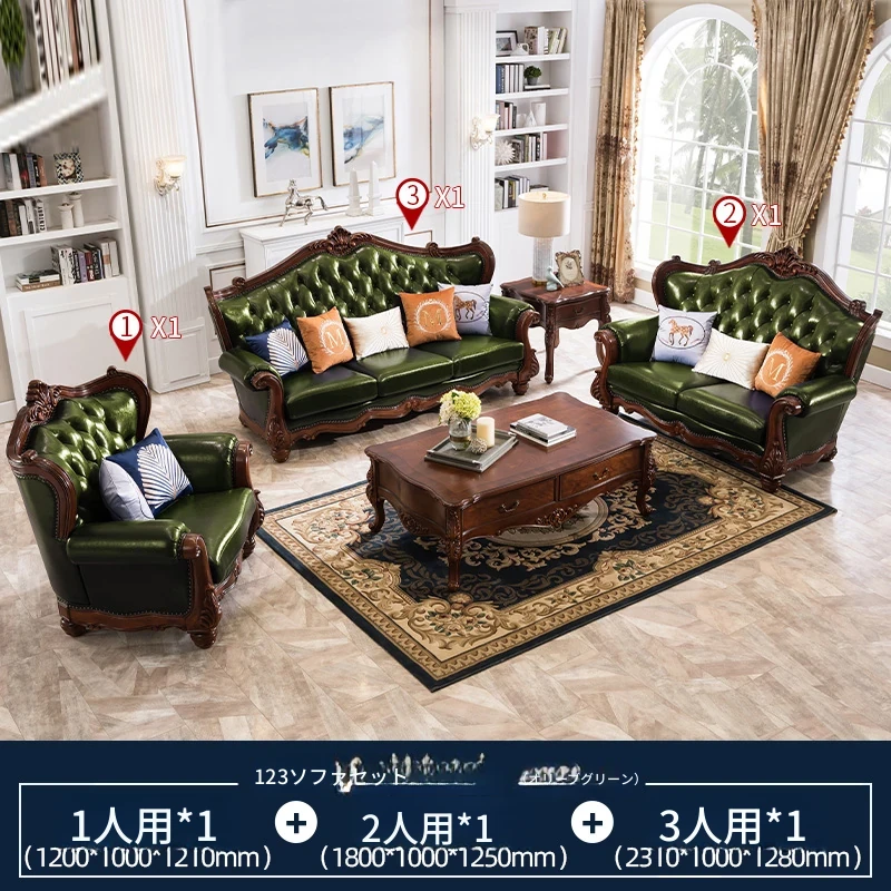 アメリカンスタイルのフルウッド&レザーソファとコーヒーテーブルのセット - ヴィンテージ感漂う欧式デザイン、大小様々な部屋にぴったりな3人掛け、精巧な彫刻が施された高級感溢れる家具。
