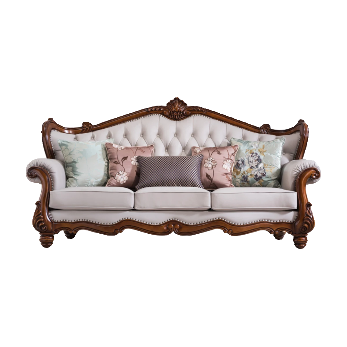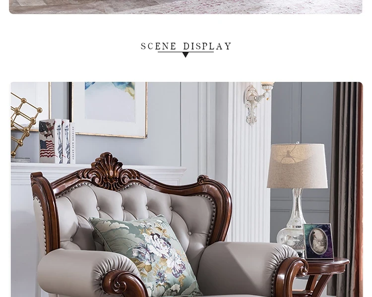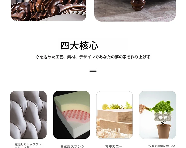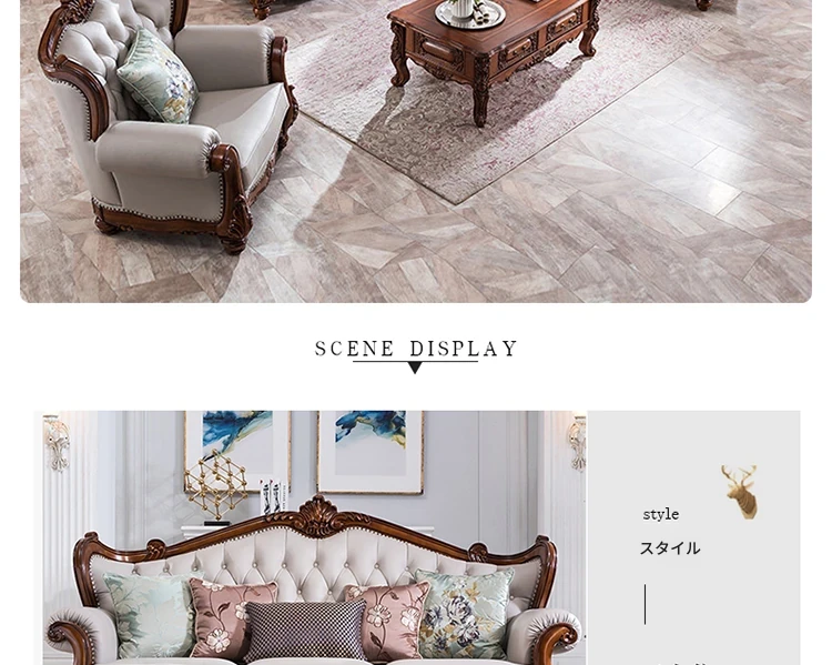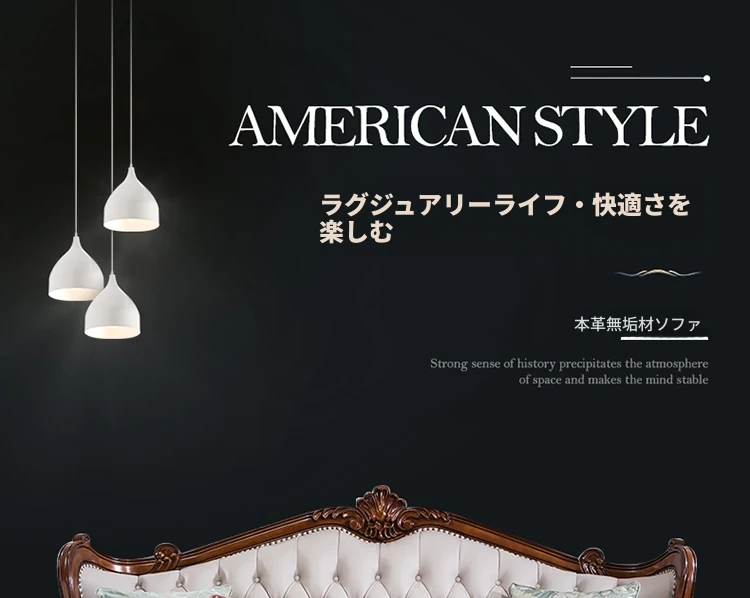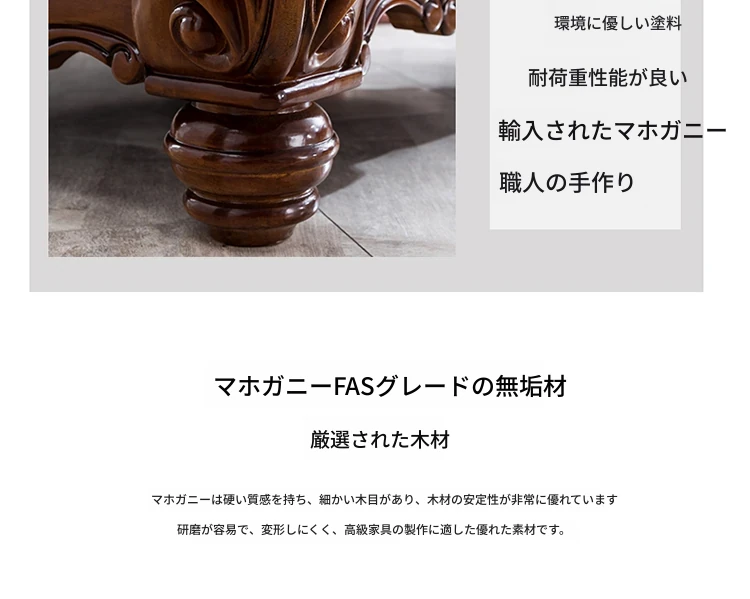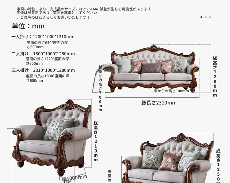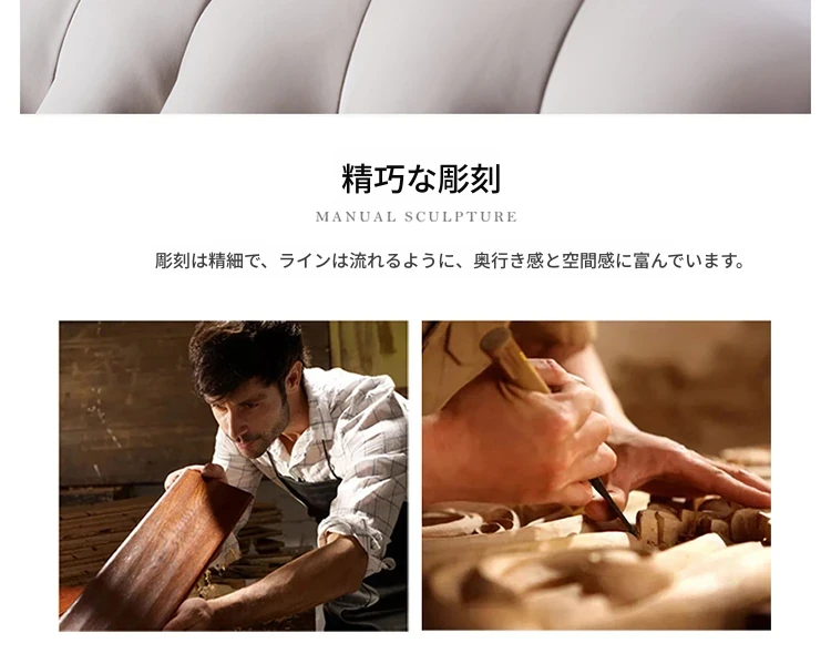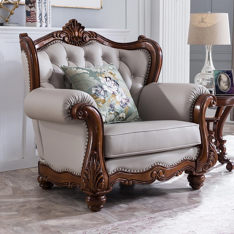 アメリカンスタイルのフルウッド&レザーソファとコーヒーテーブルのセット - ヴィンテージ感漂う欧式デザイン、大小様々な部屋にぴったりな3人掛け、精巧な彫刻が施された高級感溢れる家具。