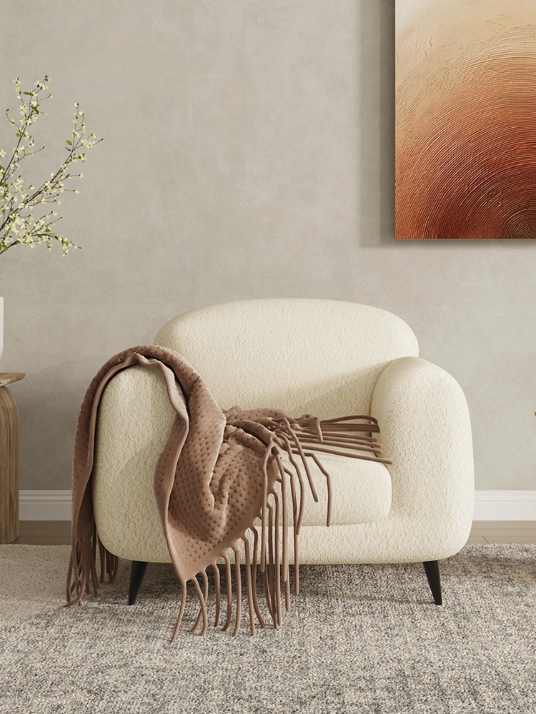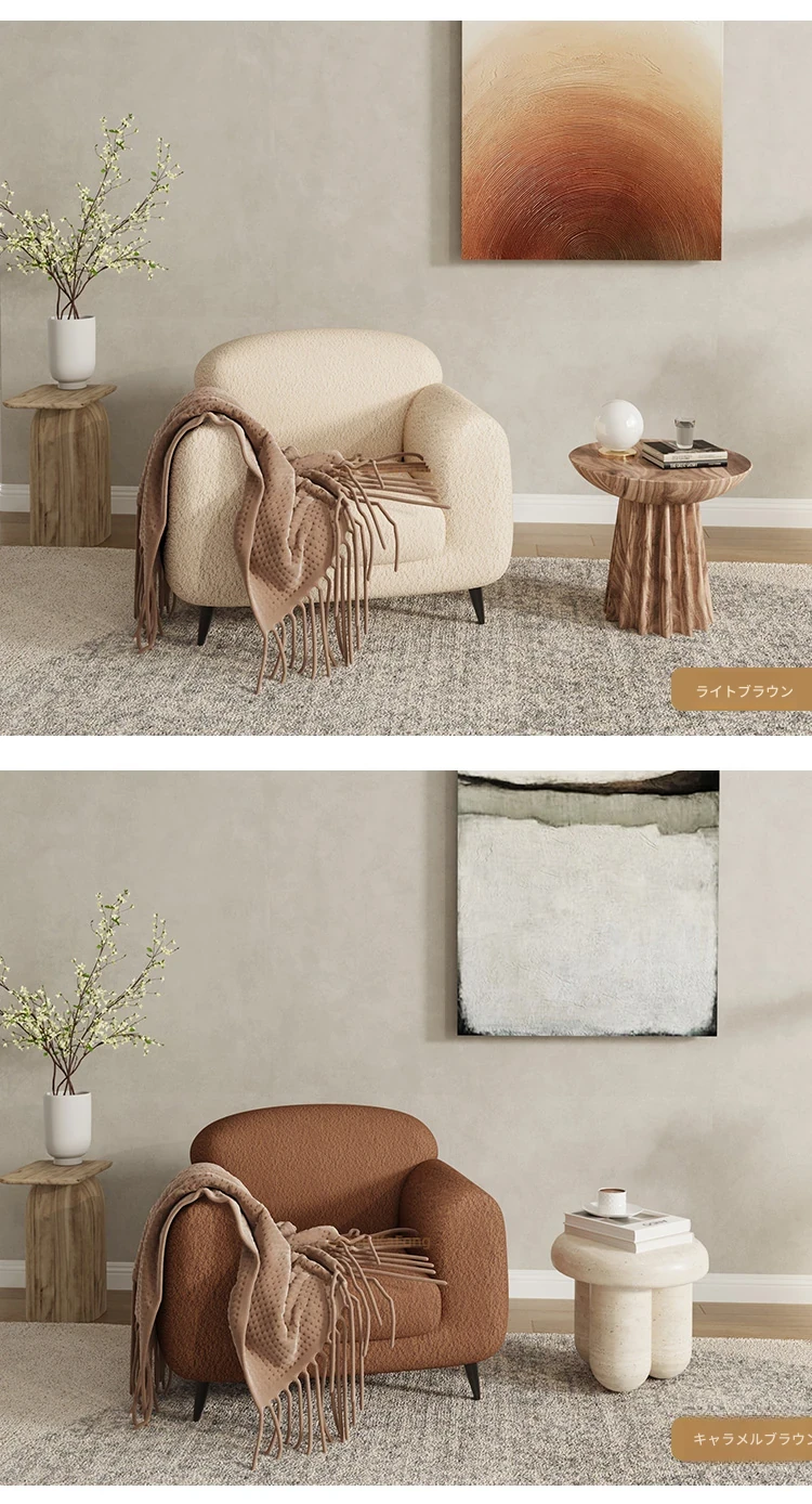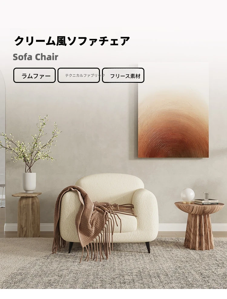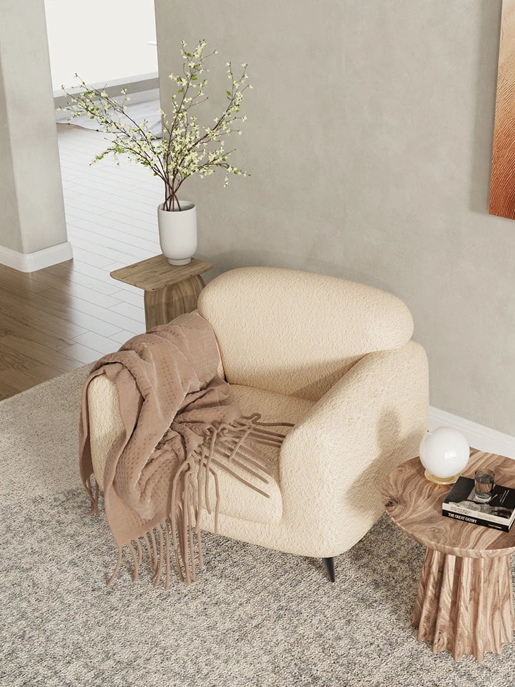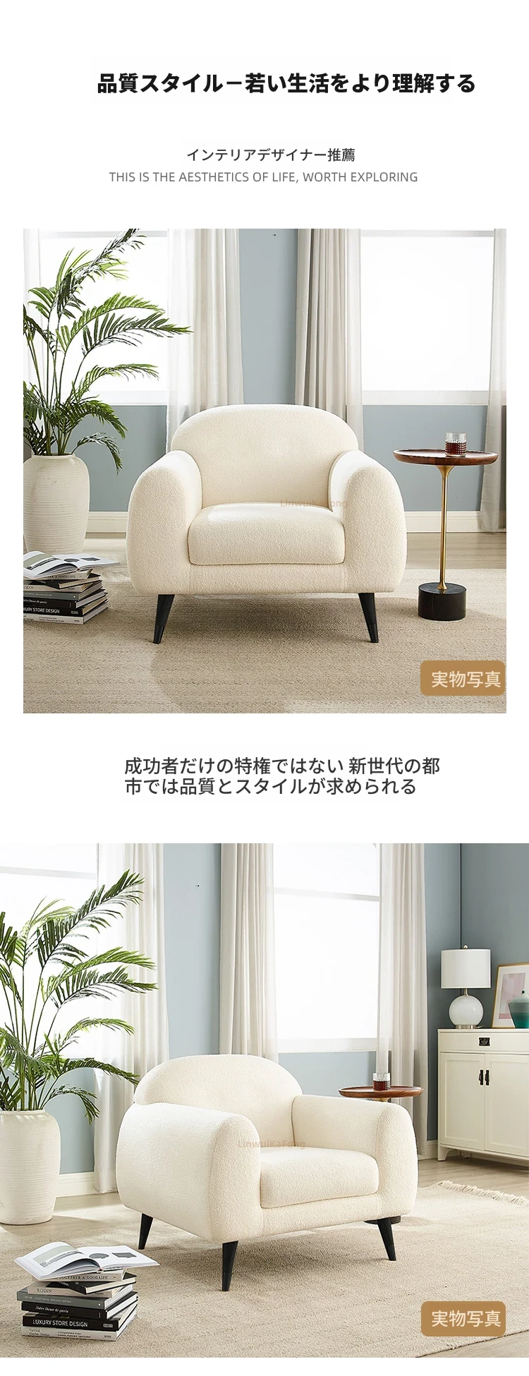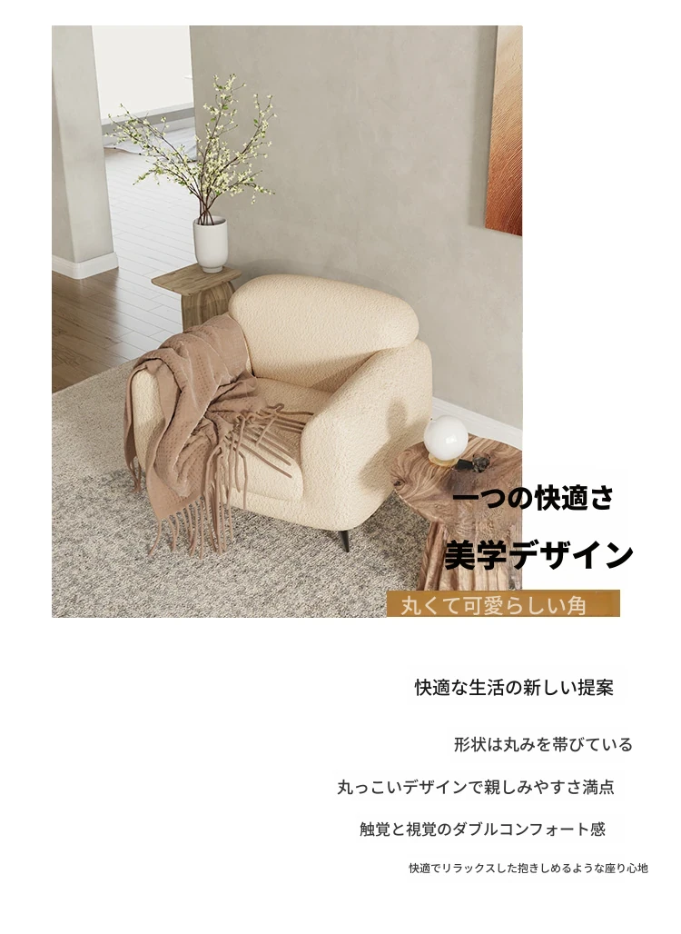 北欧風の一人用ファブリックソファ、ラグジュアリーなラムウールを使用した侘寂スタイルのリクライニングチェア。クリーミーな色合いで、小さなリビングにもぴったりのくつろぎ空間を演出します。