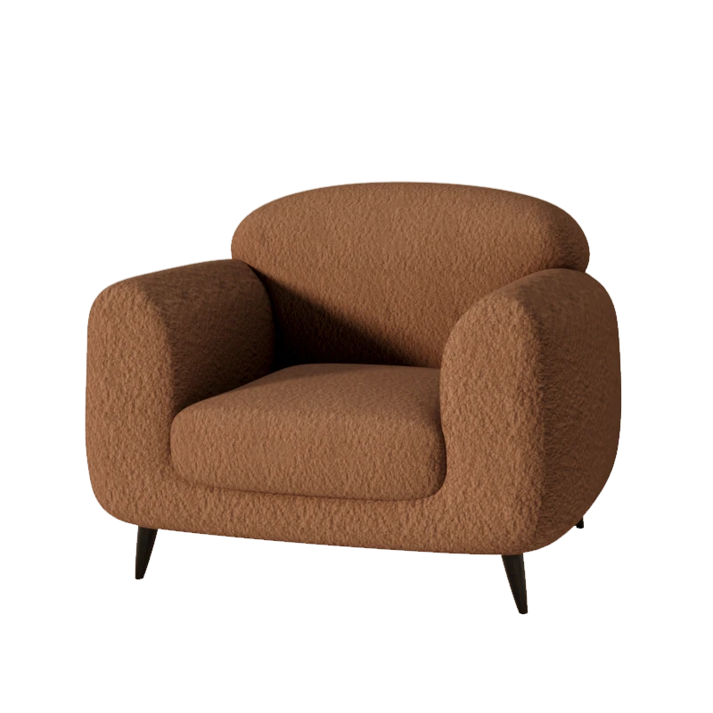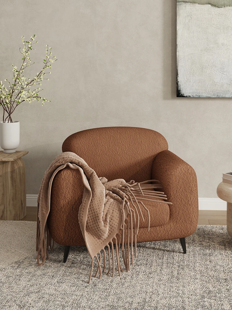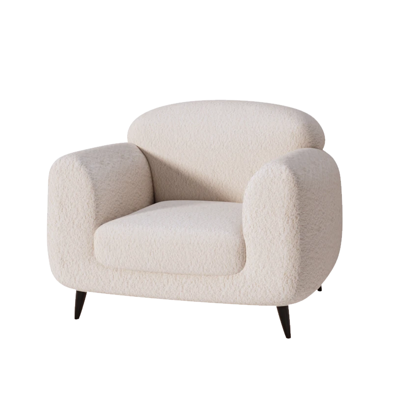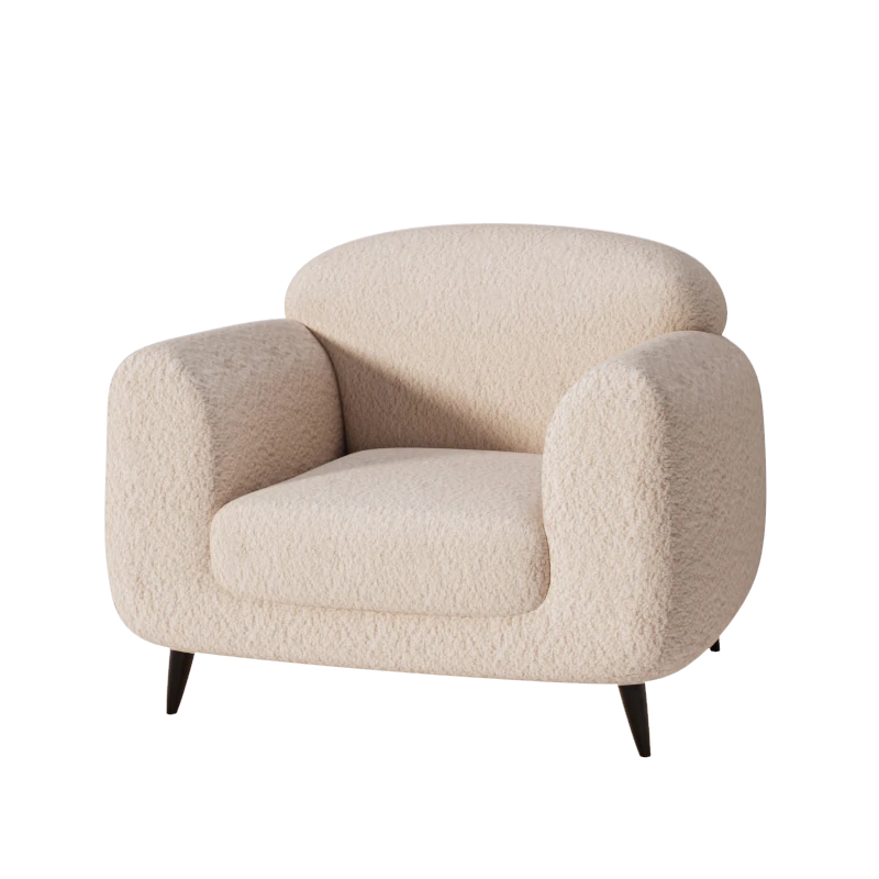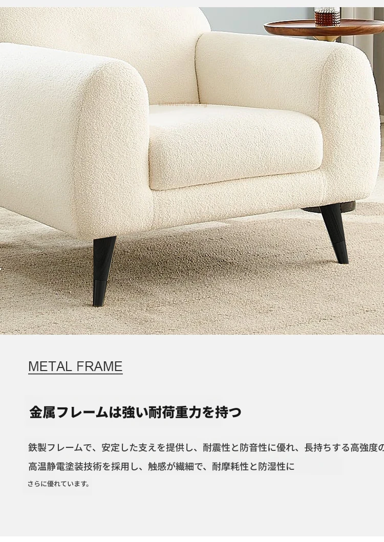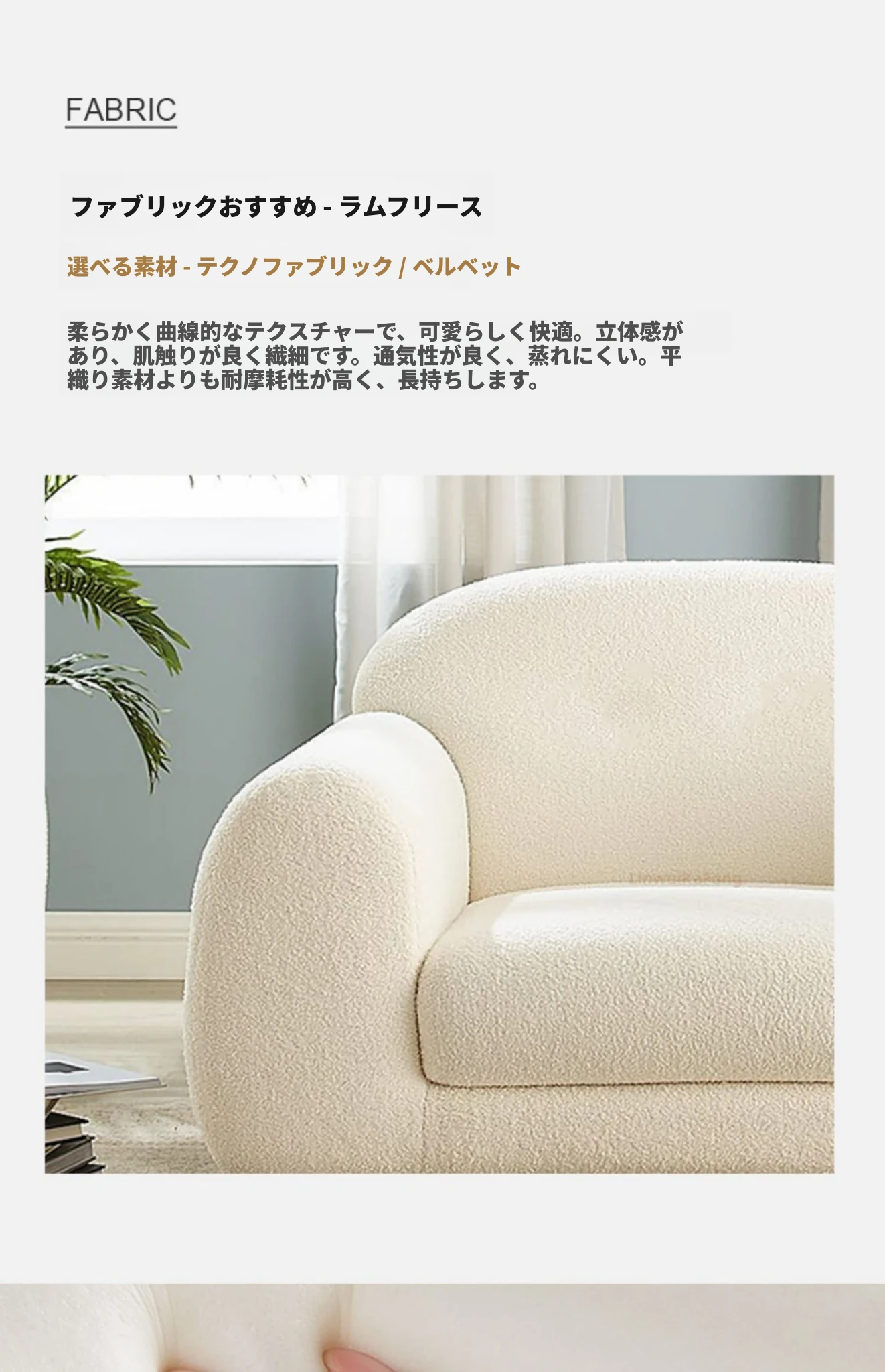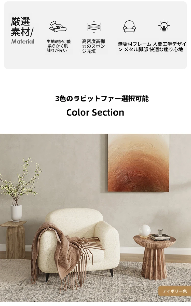 北欧風の一人用ファブリックソファ、ラグジュアリーなラムウールを使用した侘寂スタイルのリクライニングチェア。クリーミーな色合いで、小さなリビングにもぴったりのくつろぎ空間を演出します。