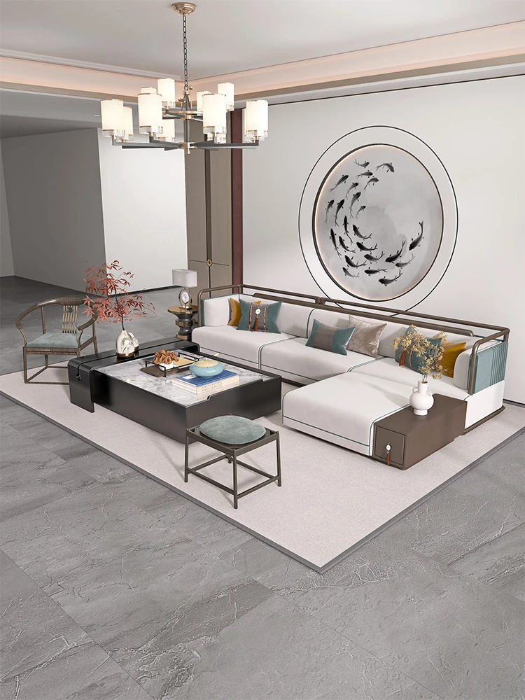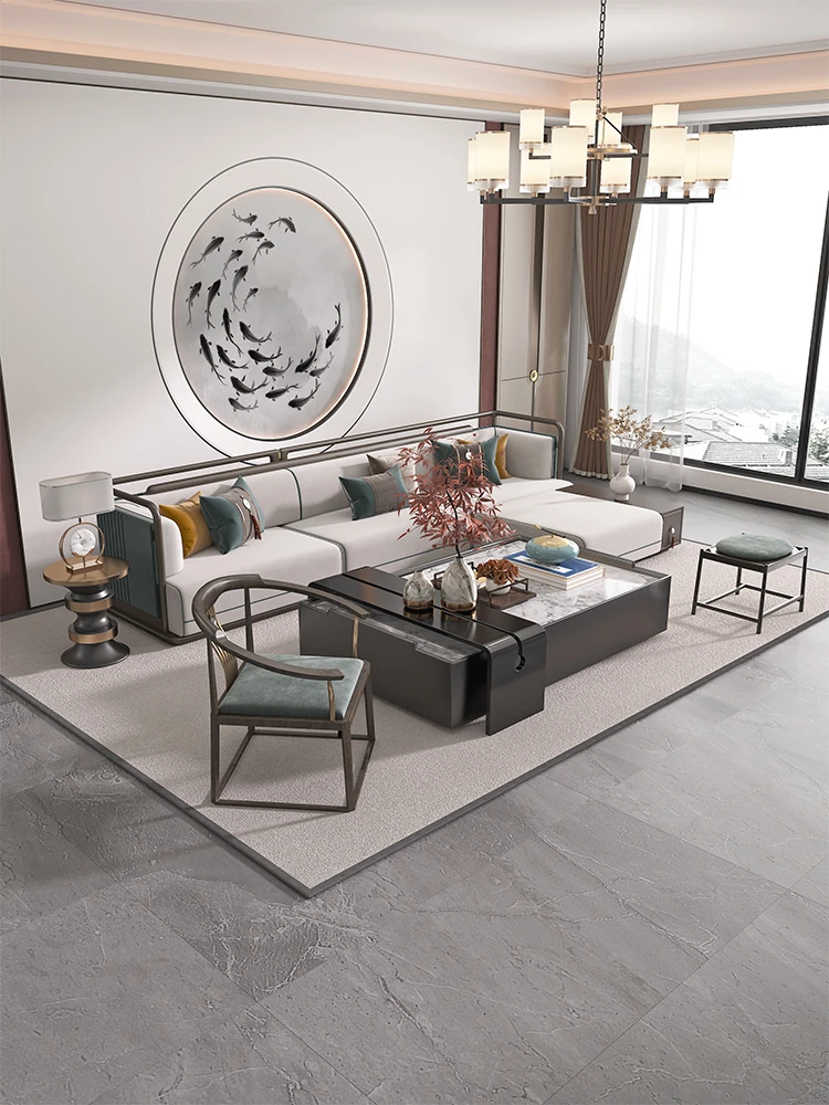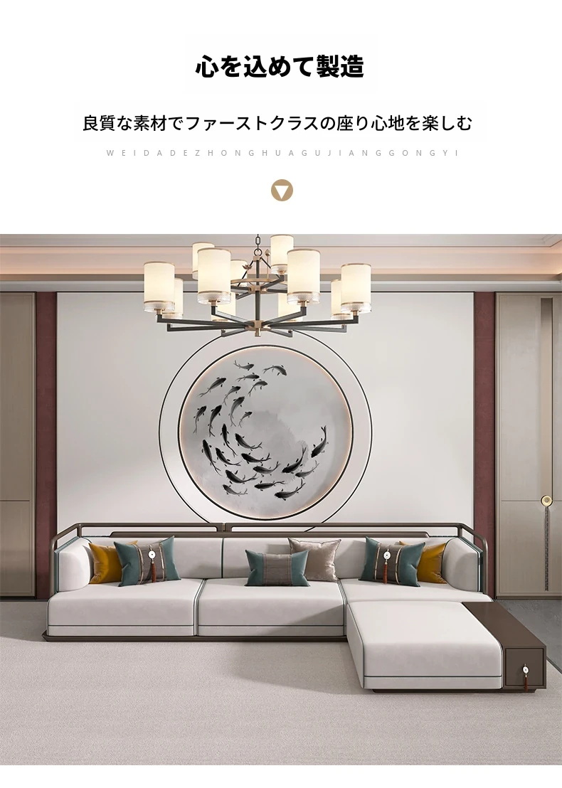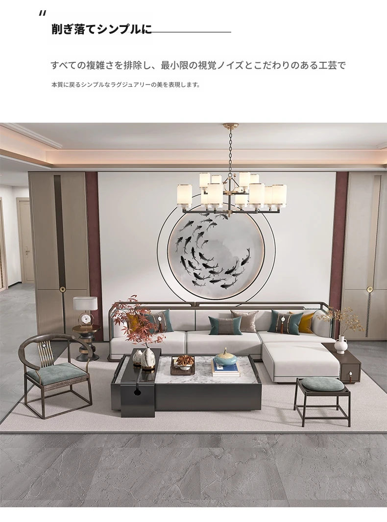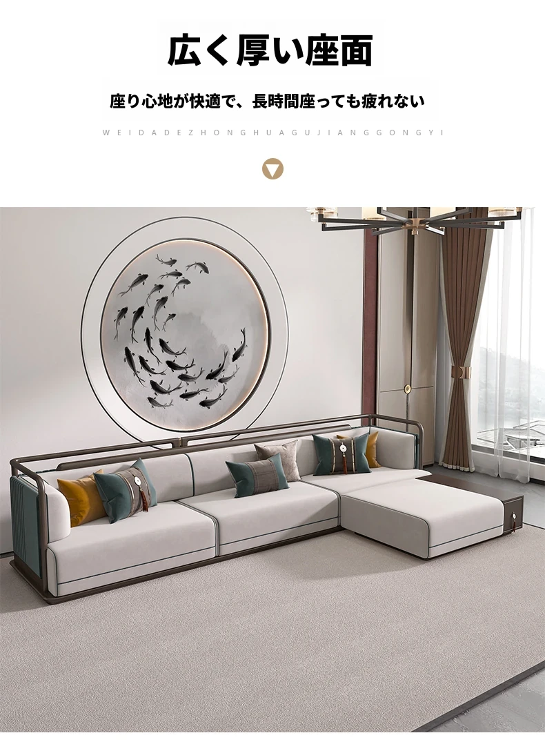 高級感あふれるリビングルームを演出!不動産販売センターやホテルロビーにも最適な、豪華な無垢材ソファとコーヒーテーブルのセット。モデルルームやヴィラ、広々としたフラットにぴったりのデザインです。