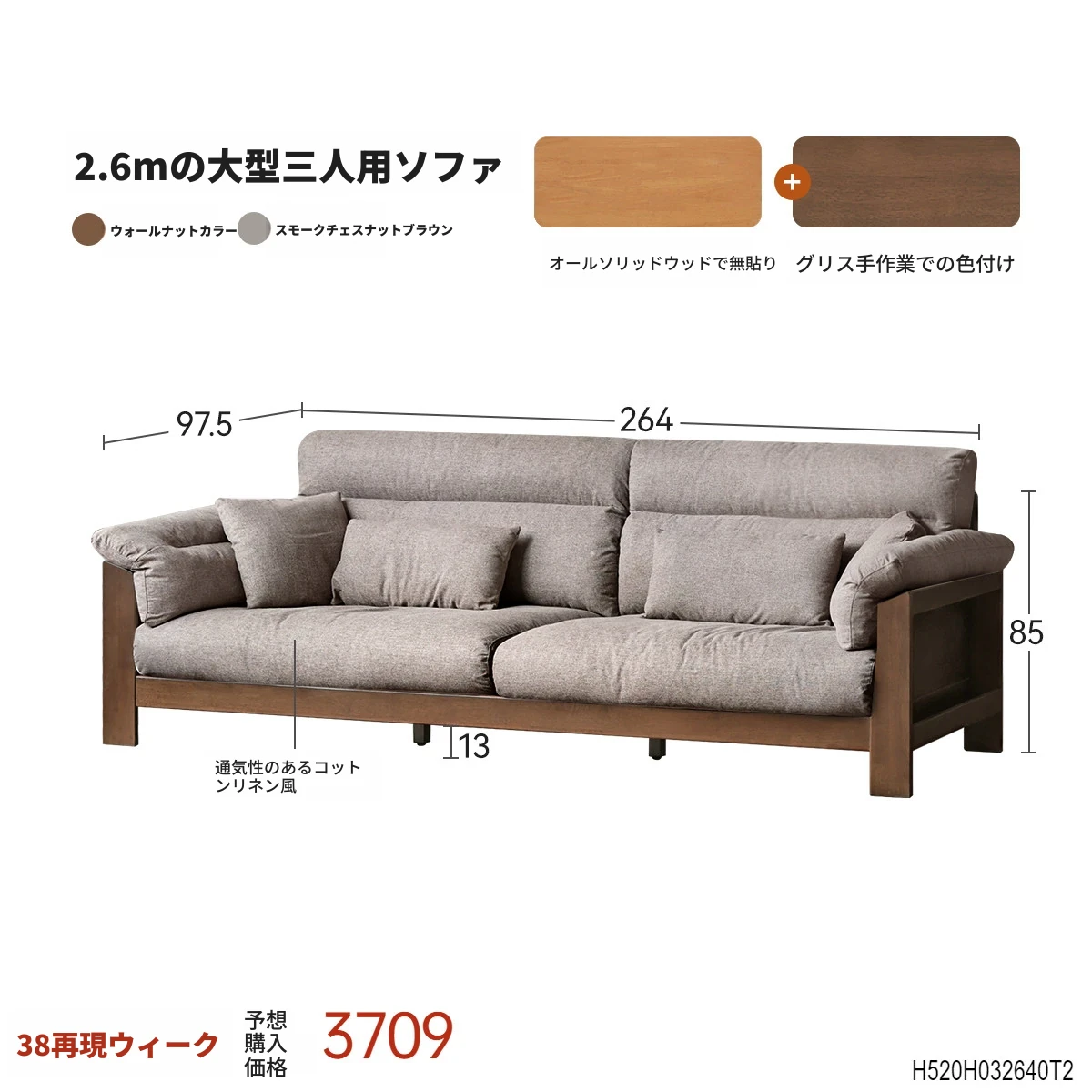 (ナチュラルカラー)2.64m大型三人掛けソファ【スモークチェスナットブラウン】(2640*975*850MM)