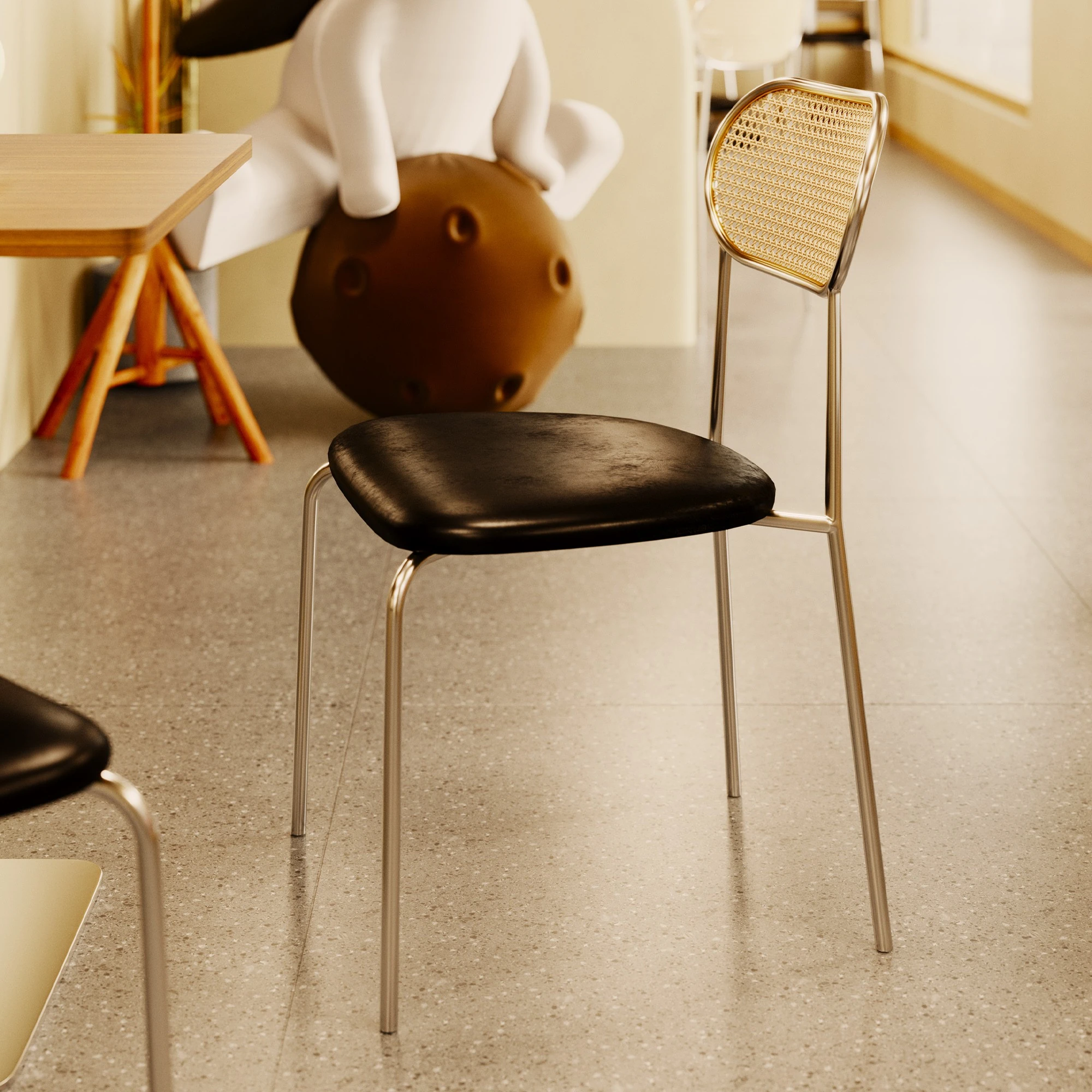 黒無垢材椅子背-黒オイルレザークッション-メッキシルバー脚