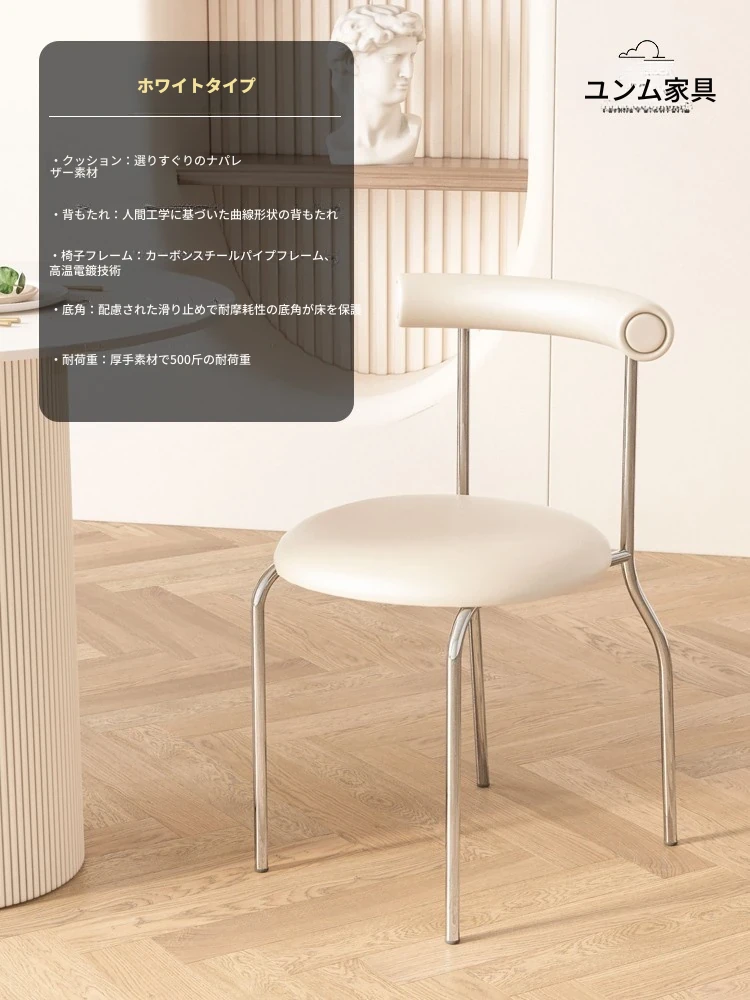 ナチュラル無垢材椅子背-白オイルレザークッション-メッキシルバー脚