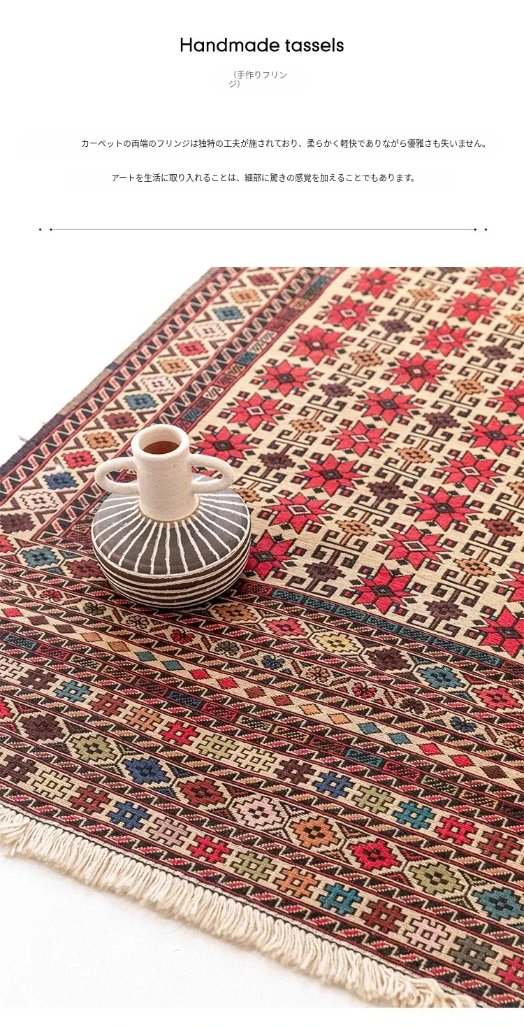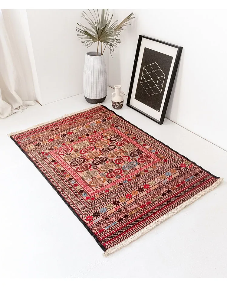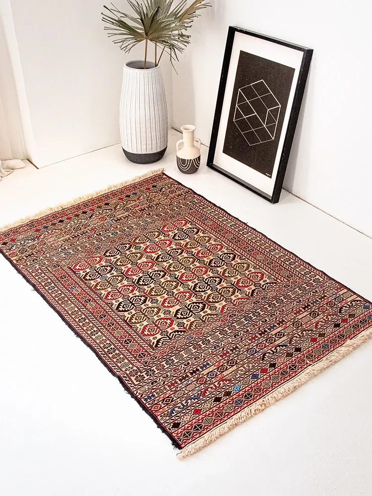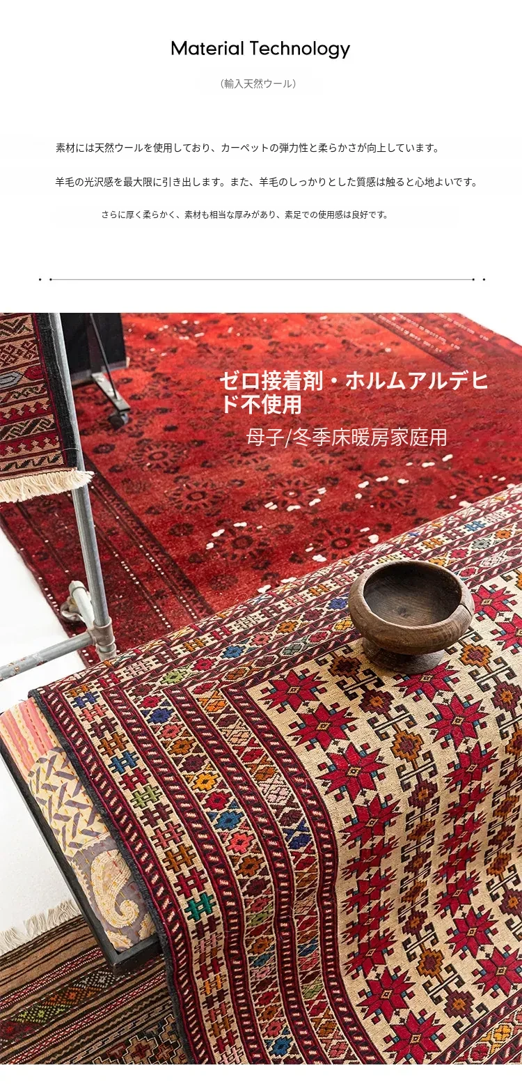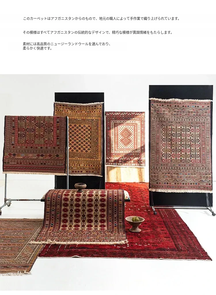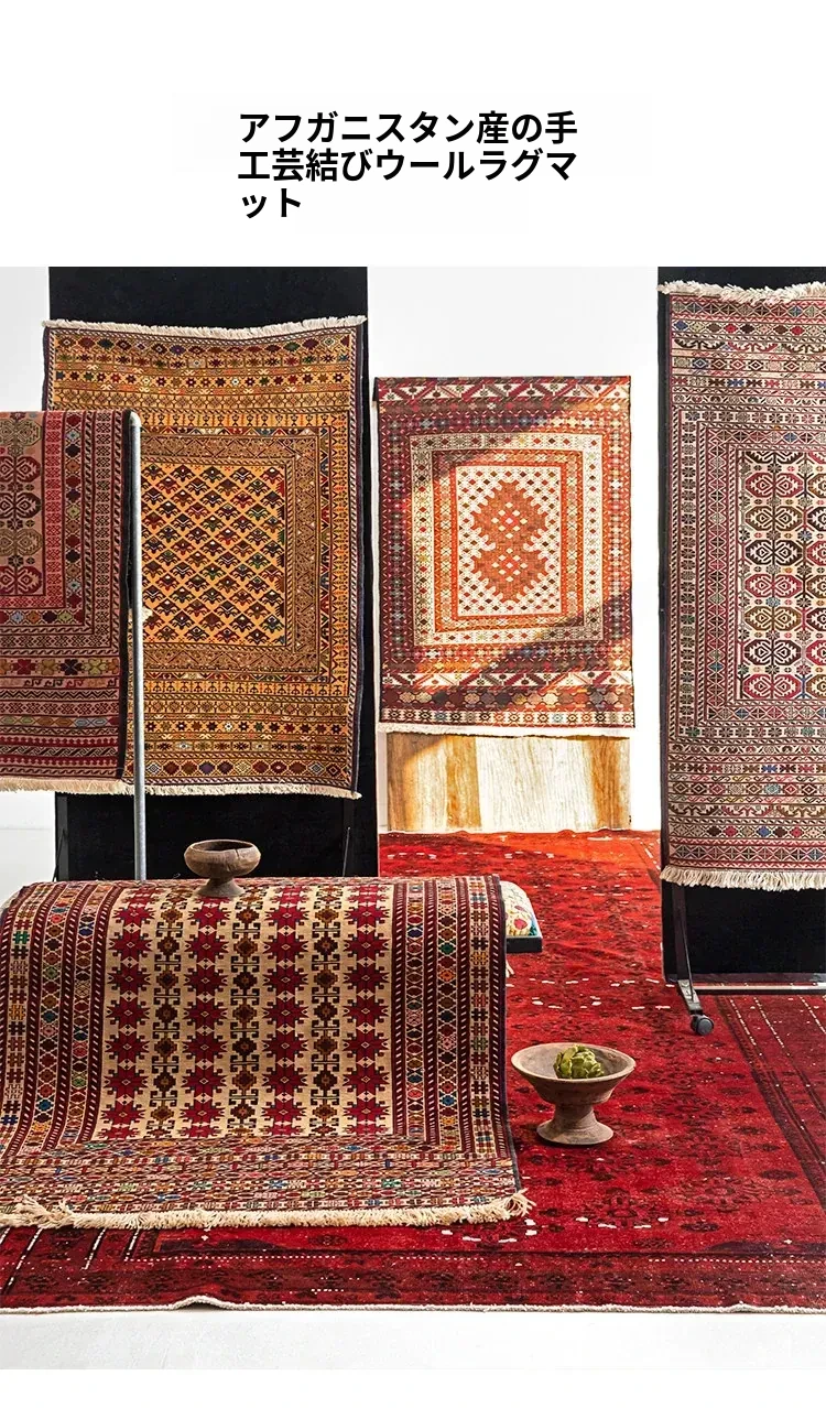 アフガニスタン直輸入 手作り結び羊毛ラグ カラフルなペルシャ風ヴィンテージデザイン リビングルーム用、玄関マット、ベッドサイドマットに最適!接着剤不使用で安心・安全な一品。