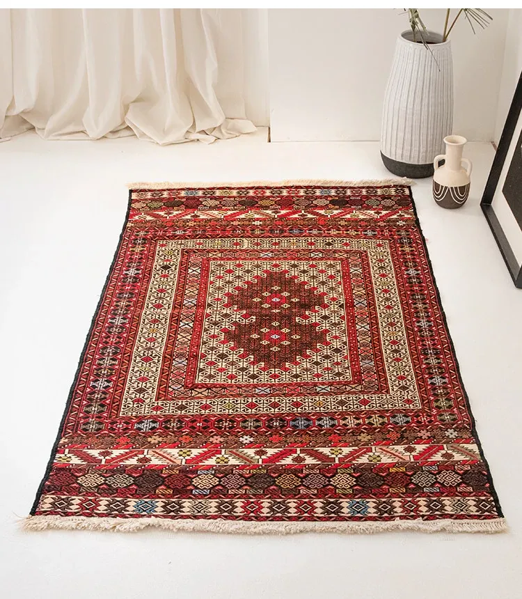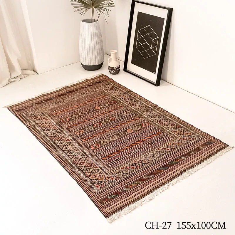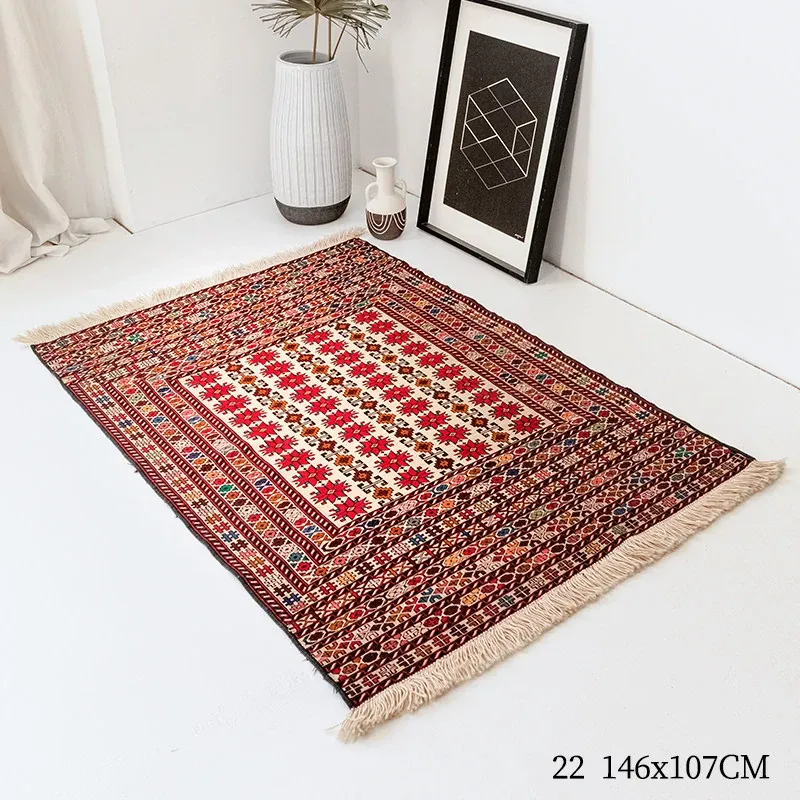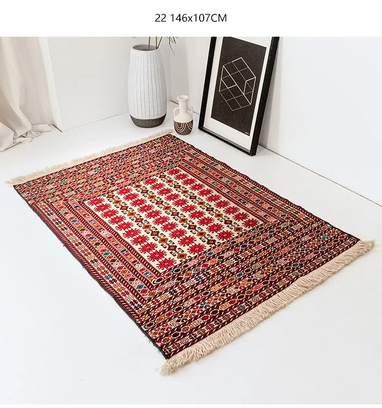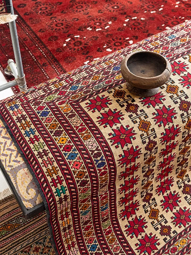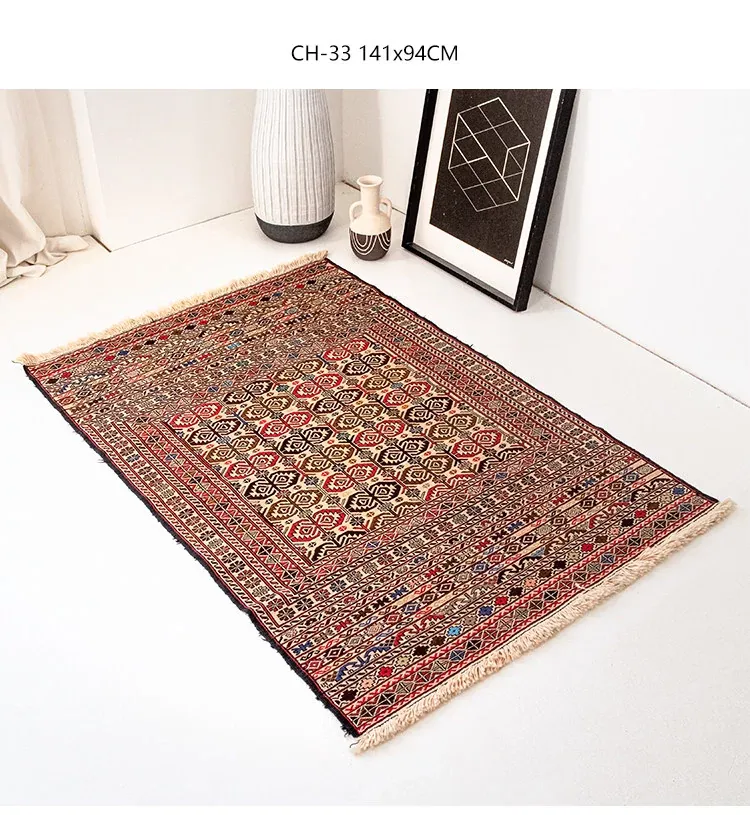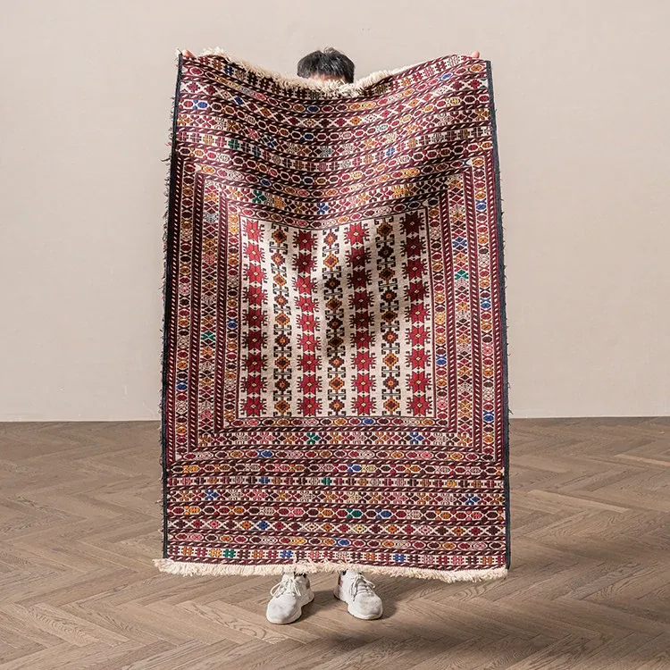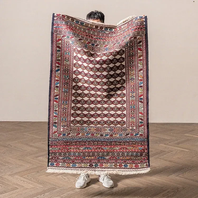 アフガニスタン直輸入 手作り結び羊毛ラグ カラフルなペルシャ風ヴィンテージデザイン リビングルーム用、玄関マット、ベッドサイドマットに最適!接着剤不使用で安心・安全な一品。