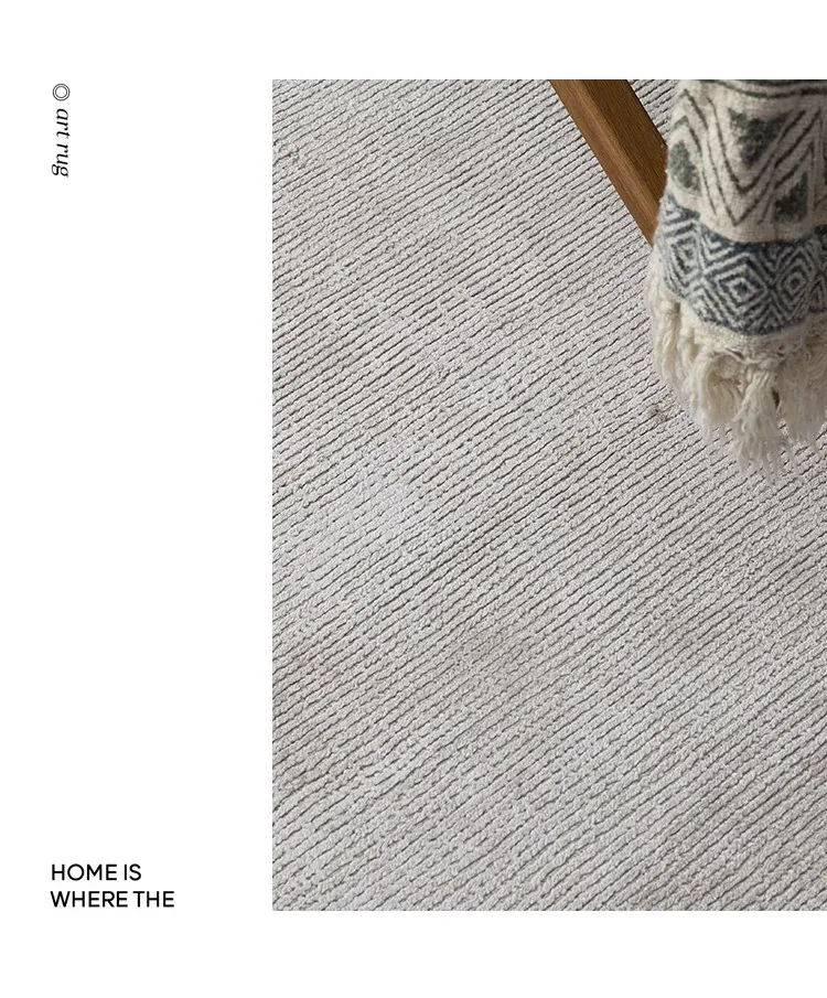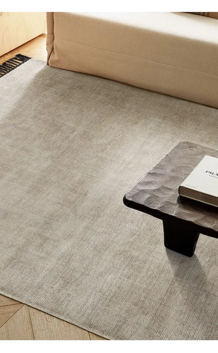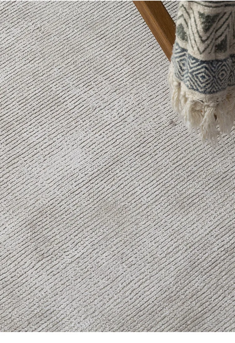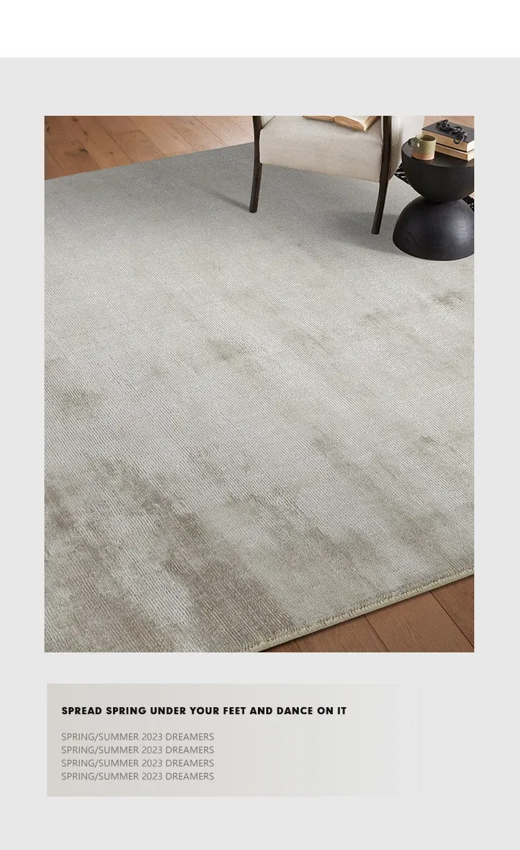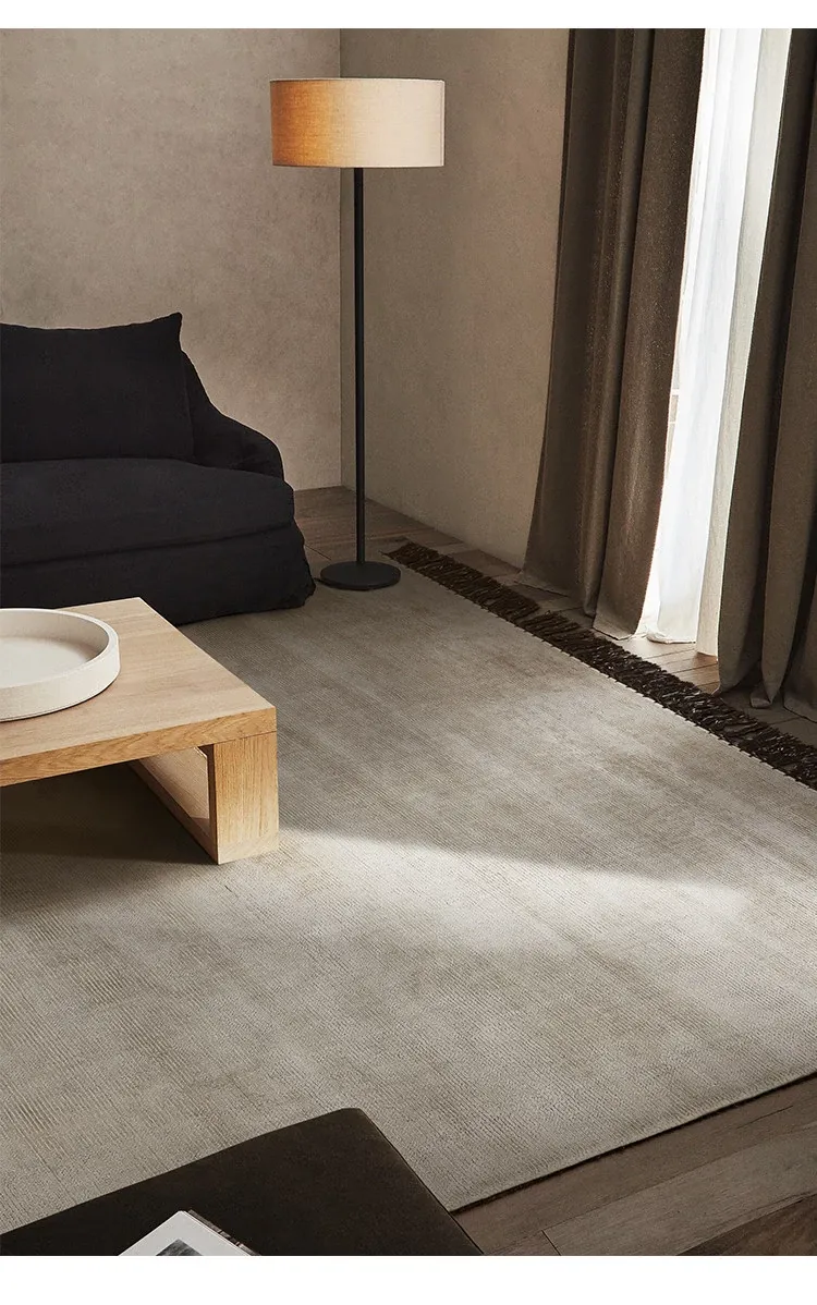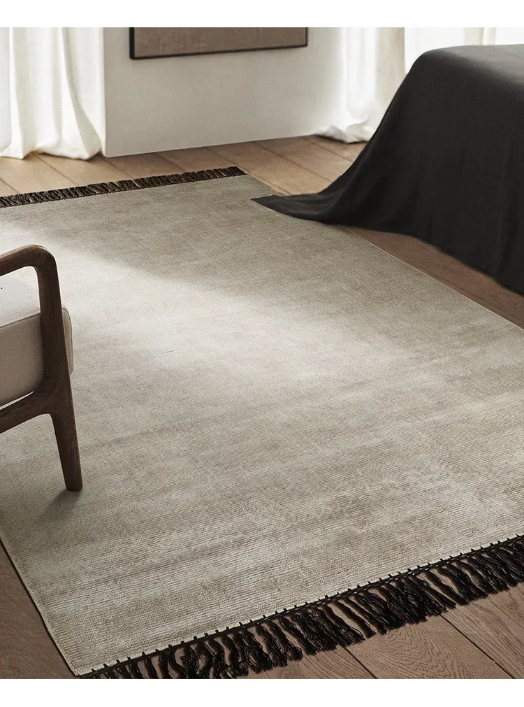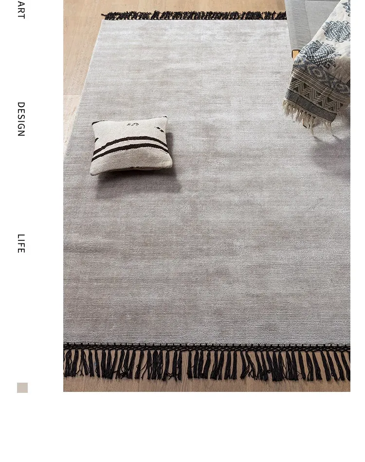 フォーマルな空間にぴったり!無ホルムアルデヒド・無接着剤の高級感漂うグレーのラグ。輸入手作り、モダンな軽奢スタイルで、竹繊維シルクの心地よさをお楽しみください。