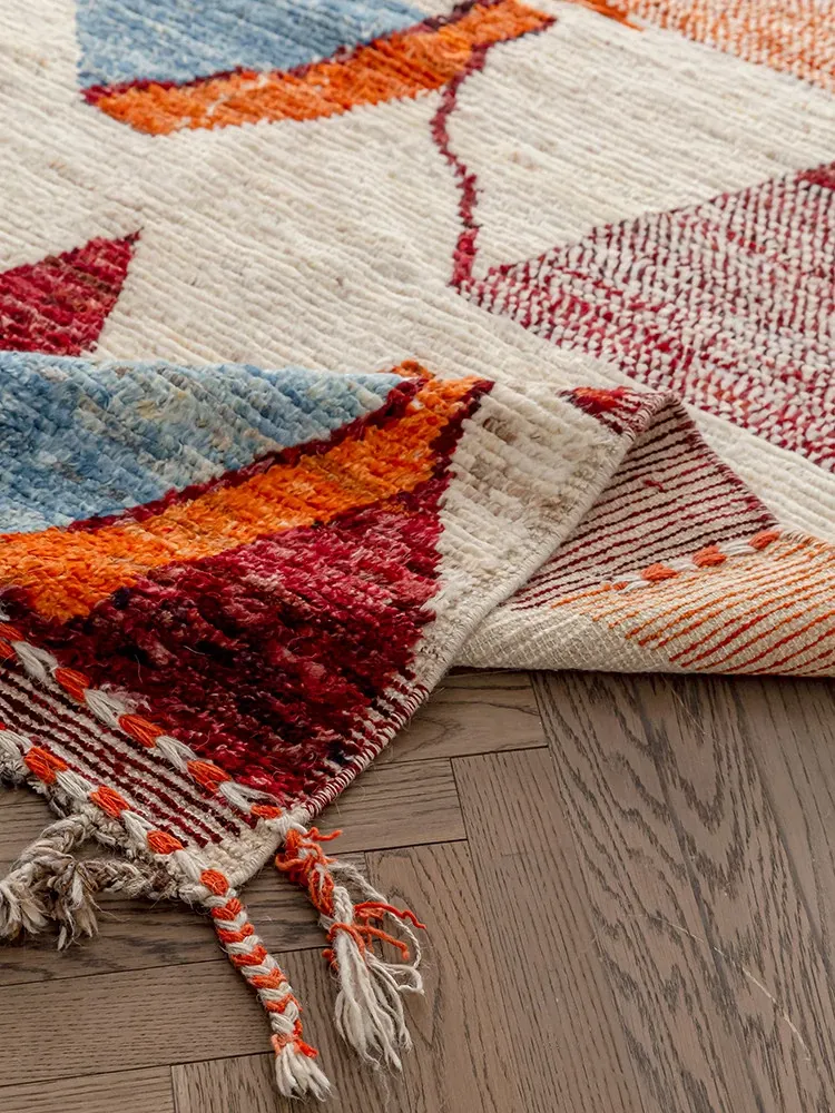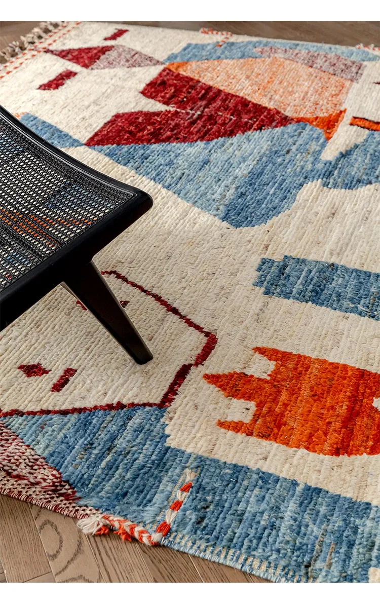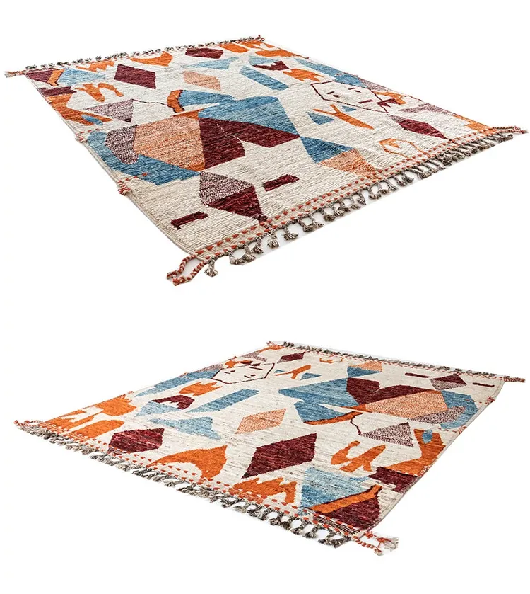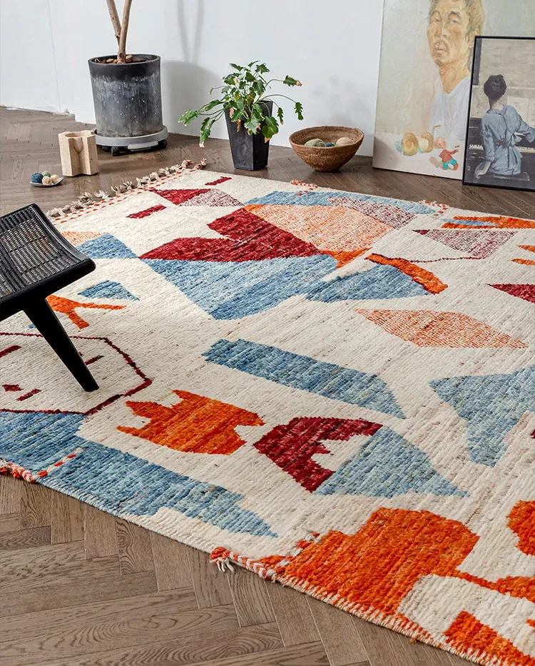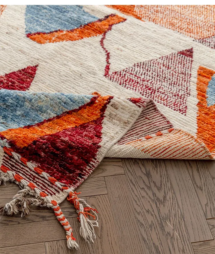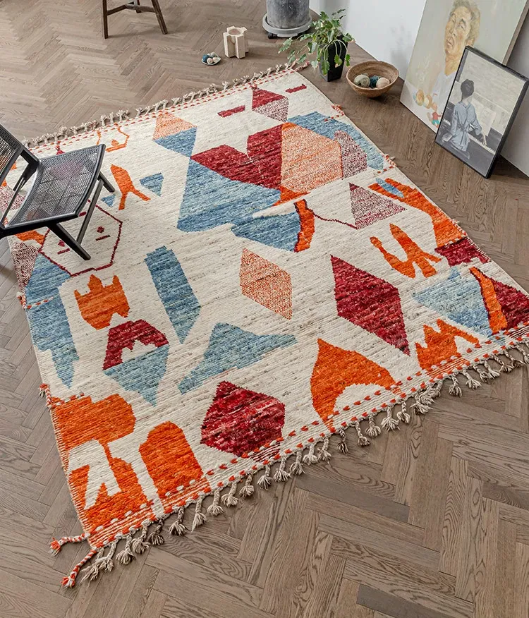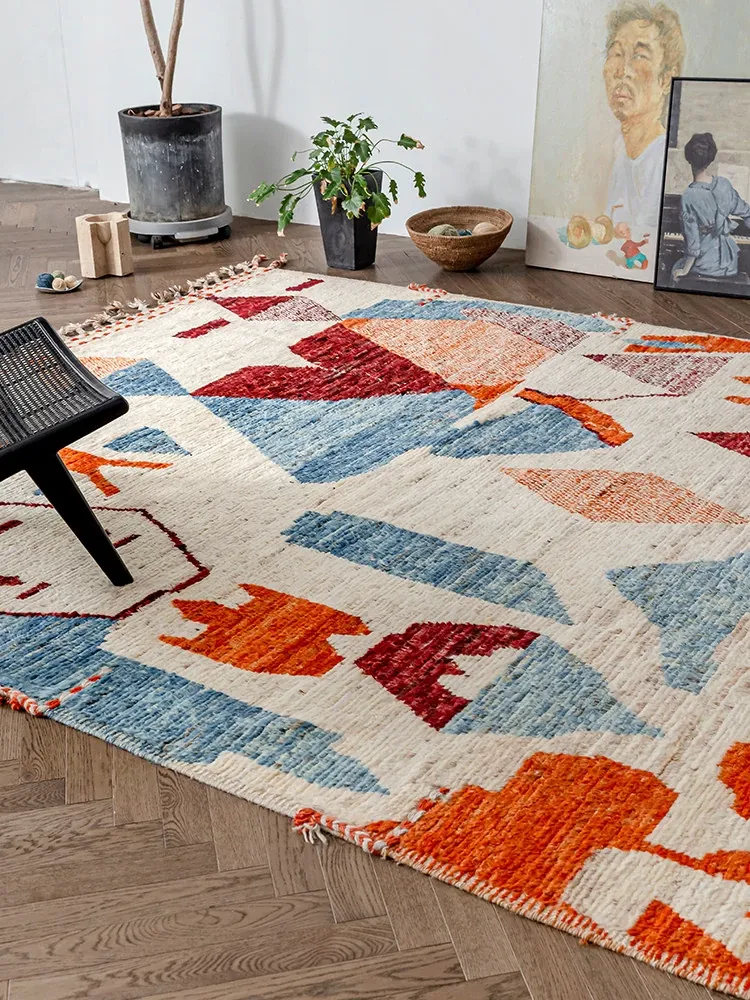 ビジュアルテイストの輸入手作りウールラグ - モダンなモロッコスタイルで、リビングにぴったり!暖かく、音を吸収し、ノン接着剤・ノンホルムアルデヒドで安心。快適な空間を演出します!