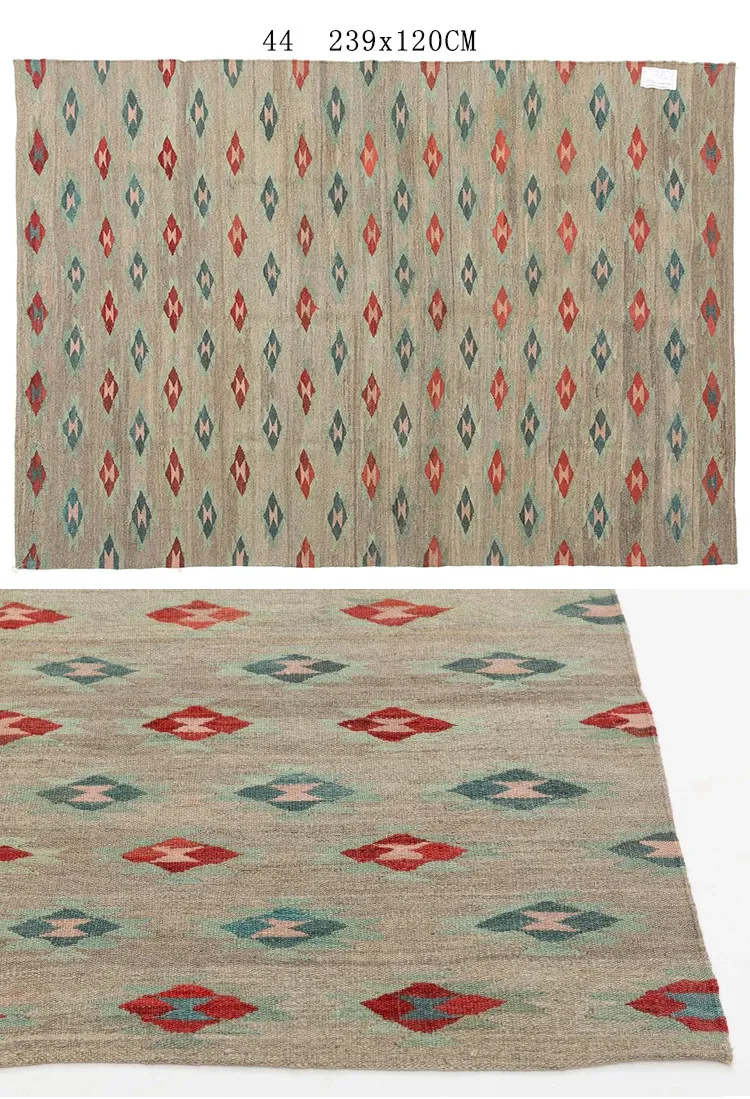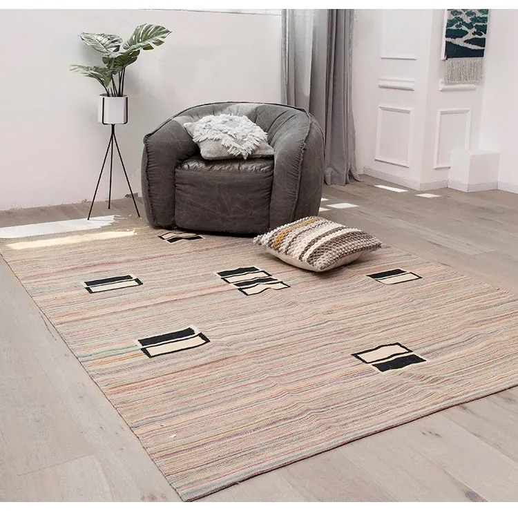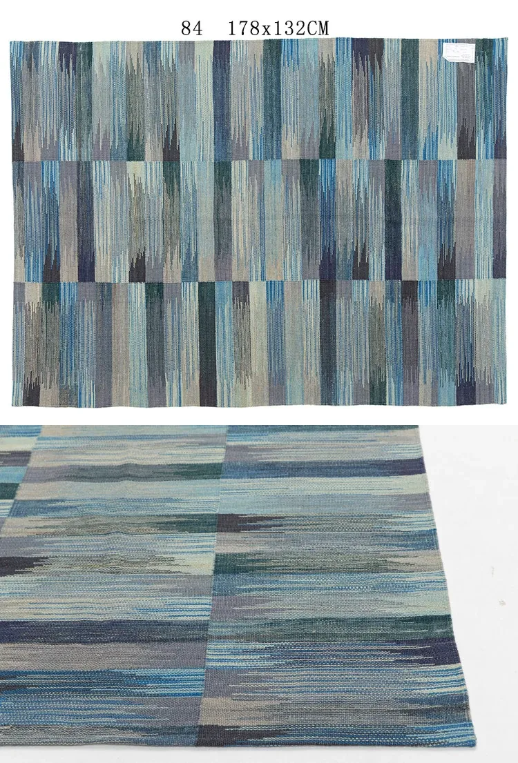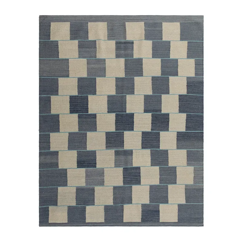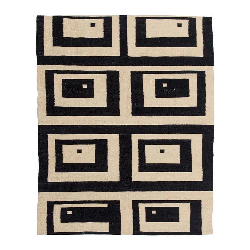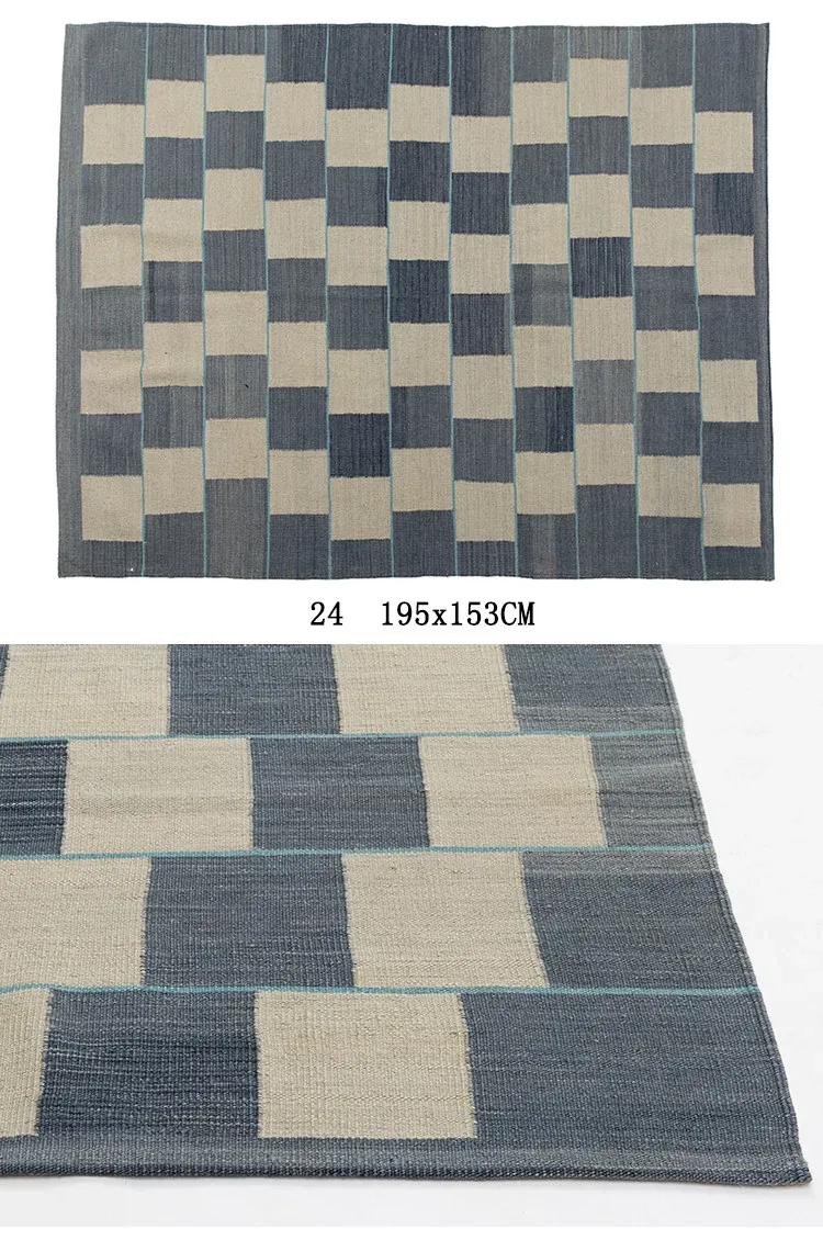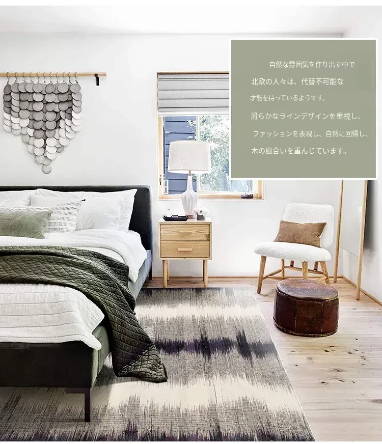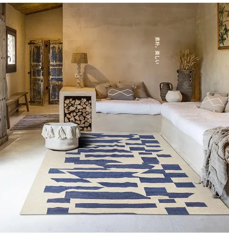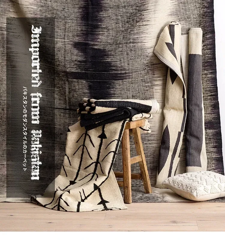 パキスタン製ハンドメイドウールラグ - 現代的な幾何学模様と北欧の侘び寂び美学を融合した、心地よい寝室やリビングにぴったりのカーペット。おしゃれな空間作りをサポートします!