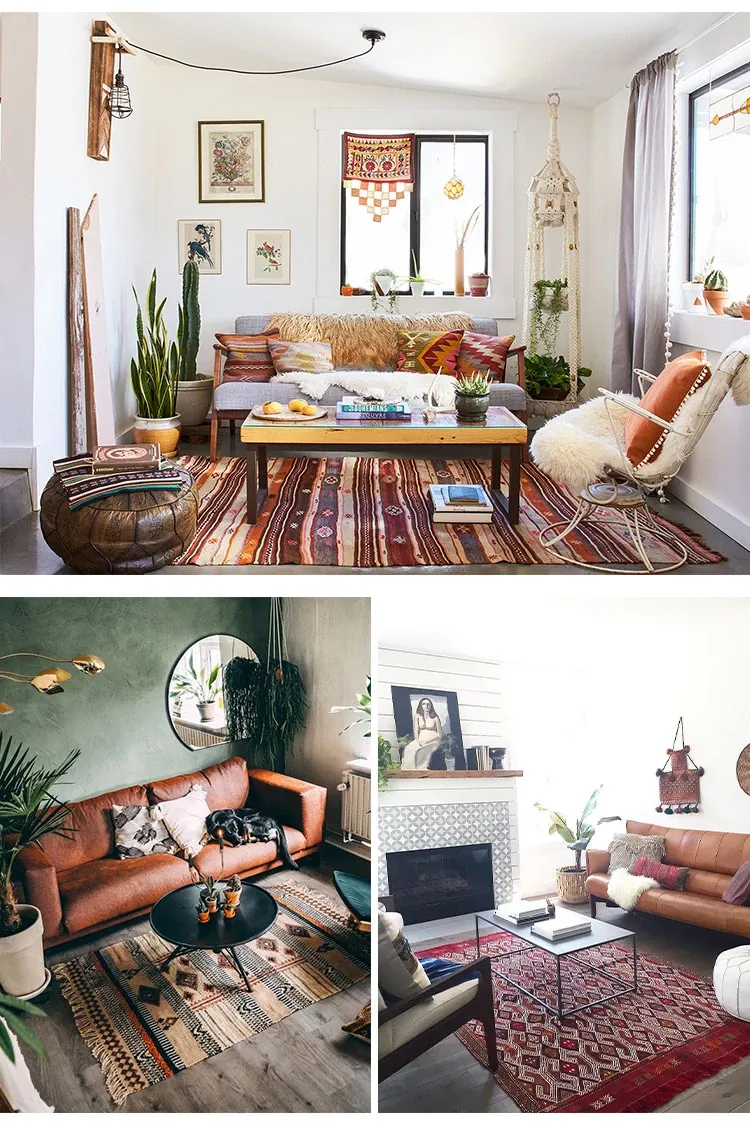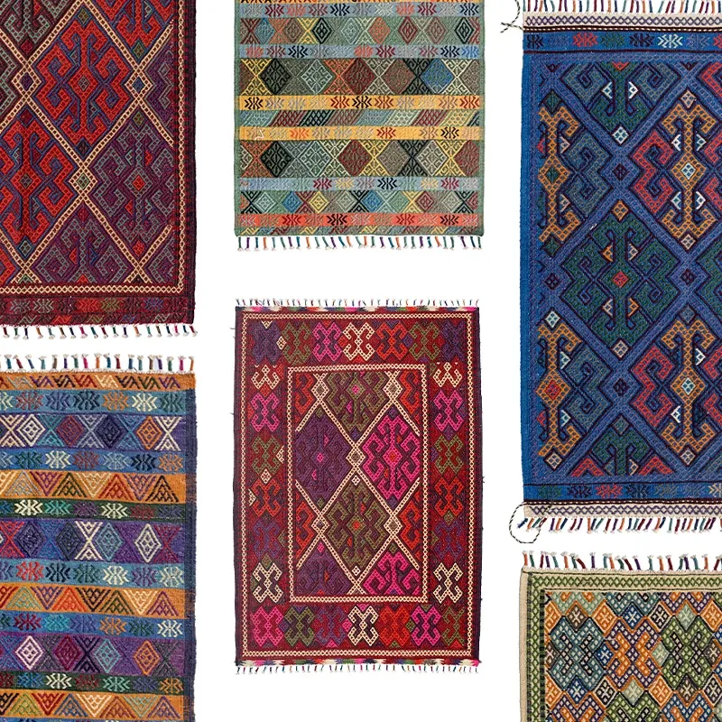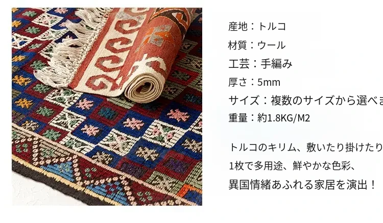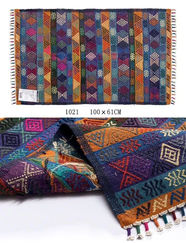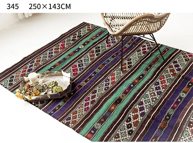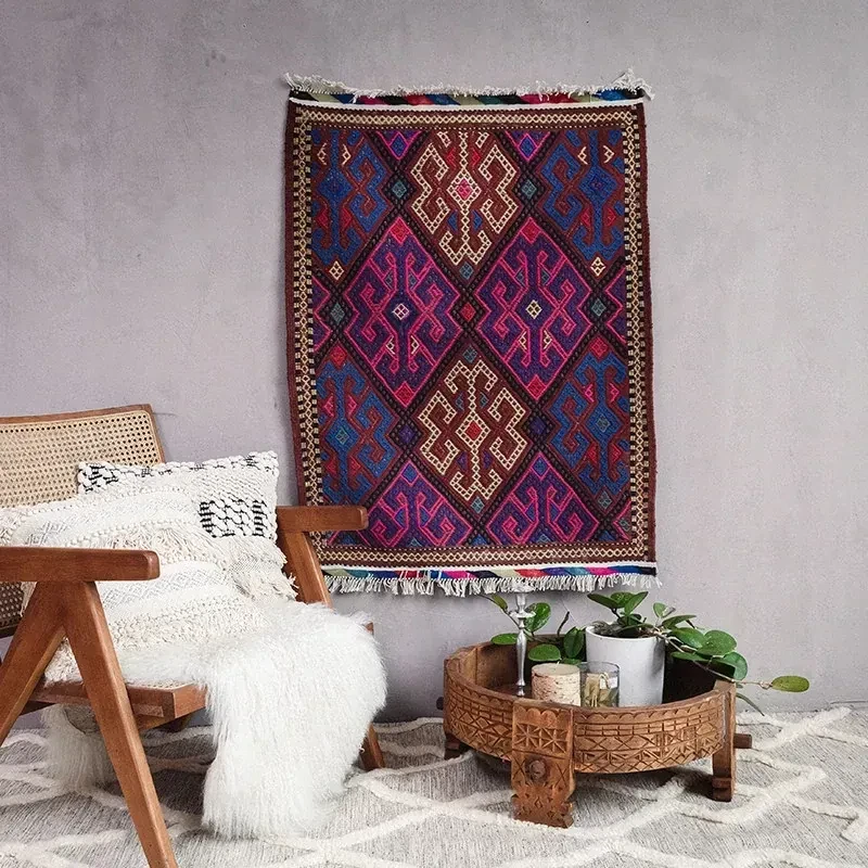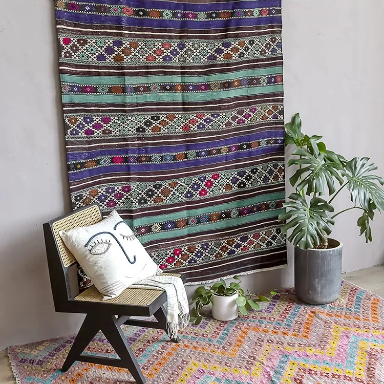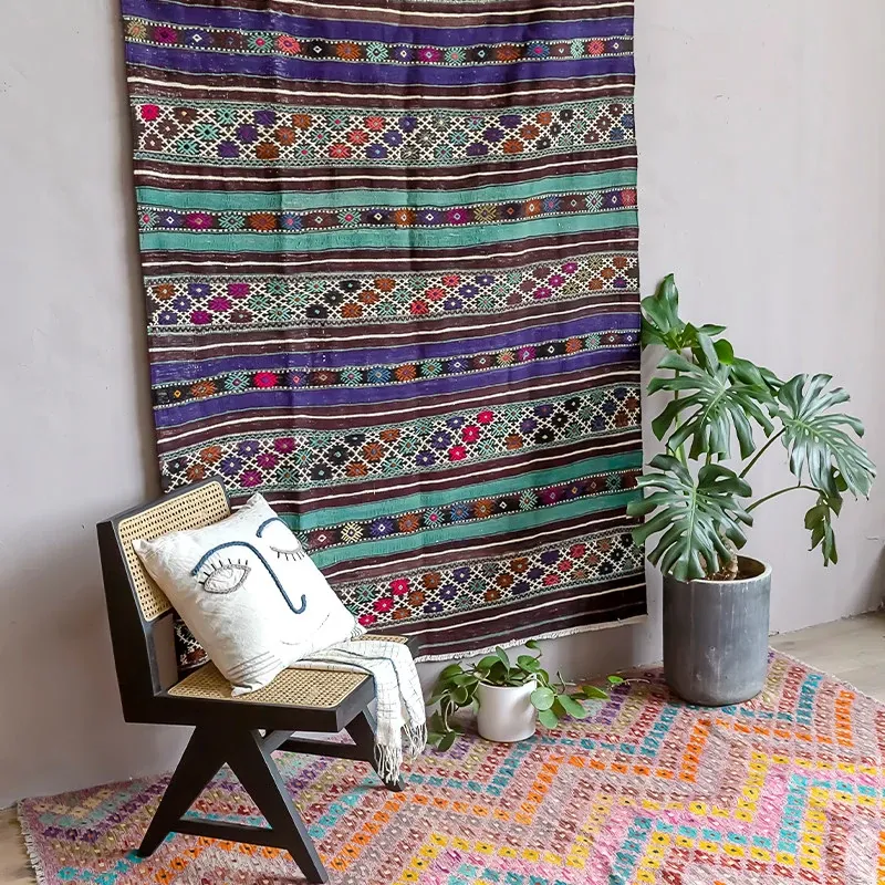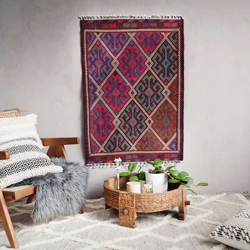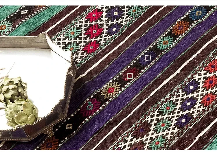 トルコ製ボヘミアンエキゾチック手織りキリムウールカーペット - 和の侘び寂びを感じるおしゃれなマットやタペストリーとして、あなたのインテリアを格上げ!