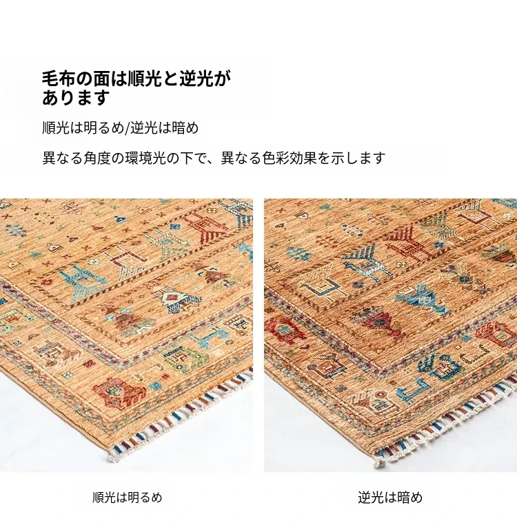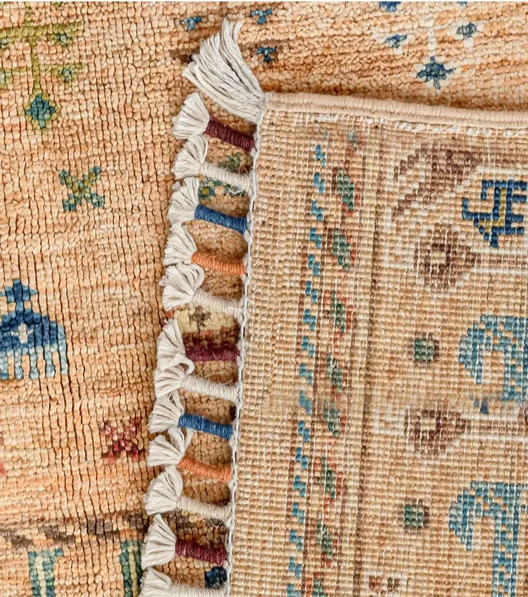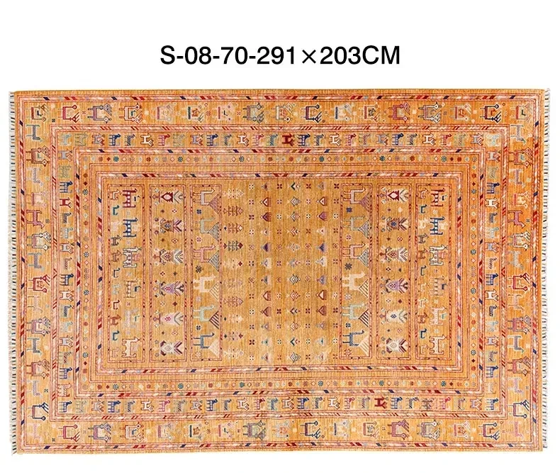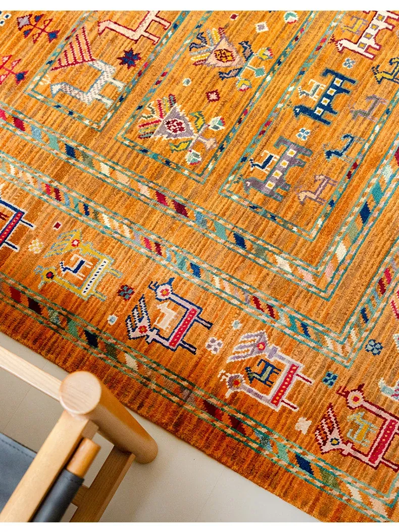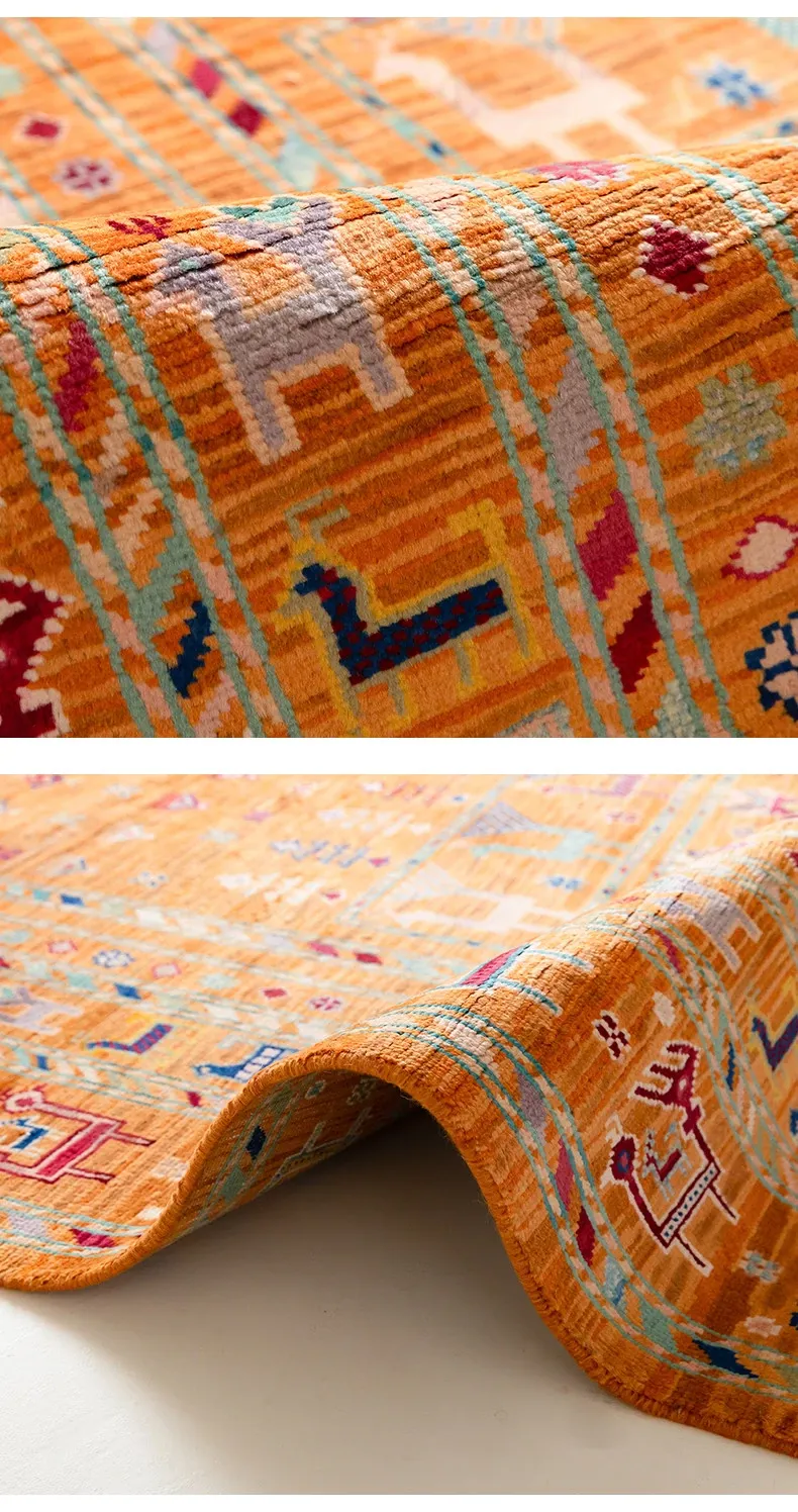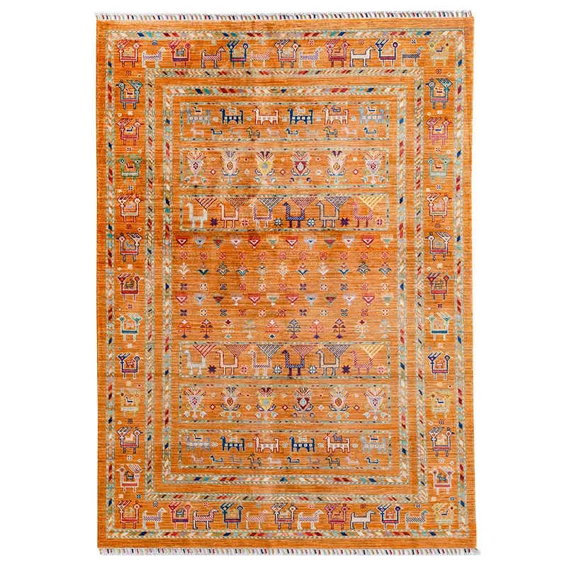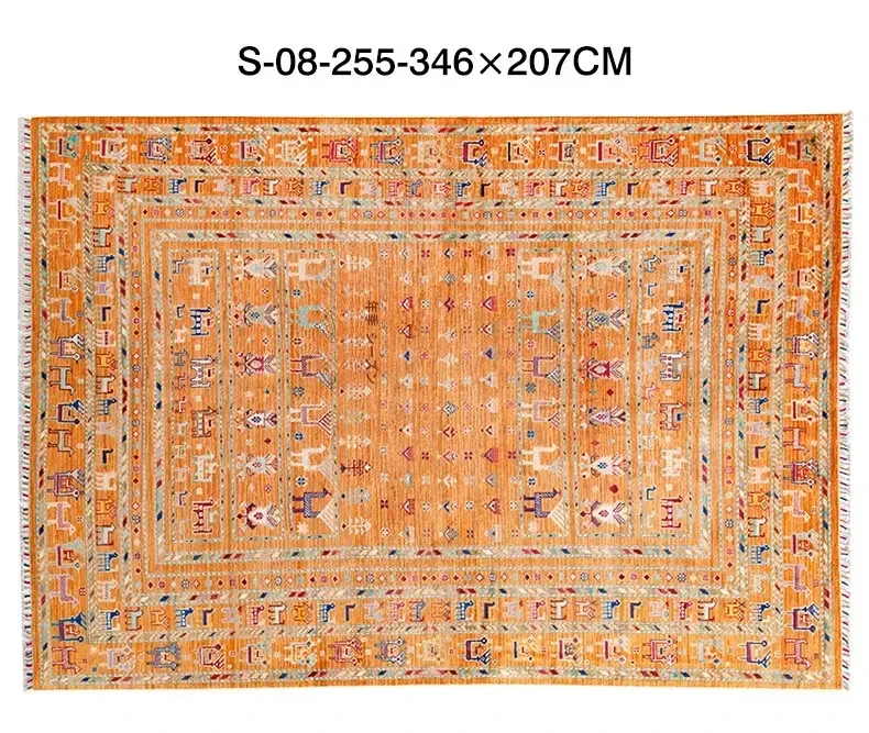 フォルム美しいアフガニスタン産、無ホルムアルデヒド・無接着剤のヴィンテージウール手織りアメリカンペルシャオレンジラグ。リビングにぴったりの高品質で安心なインテリア。
