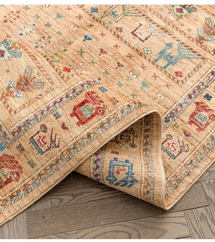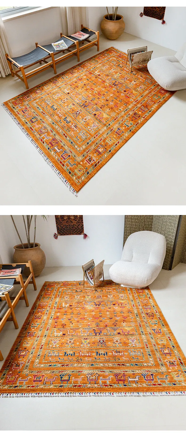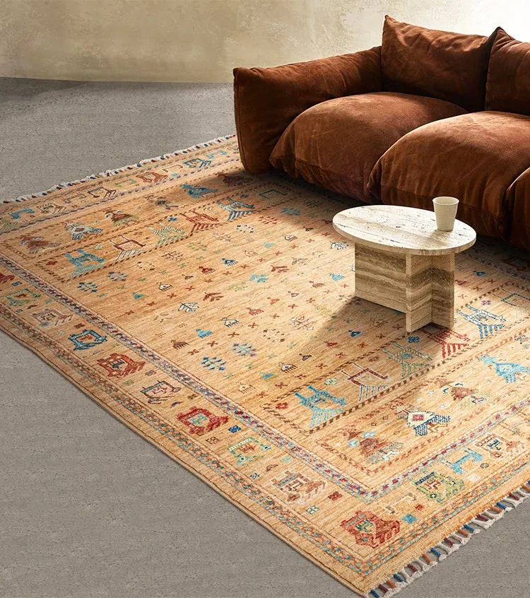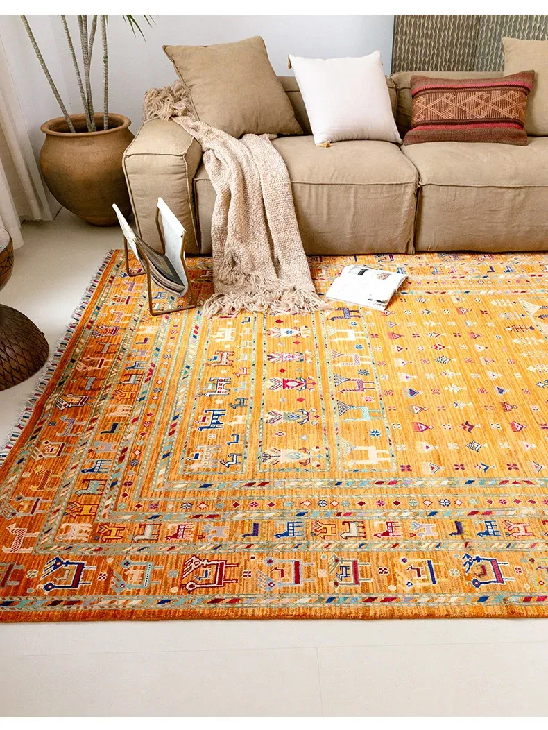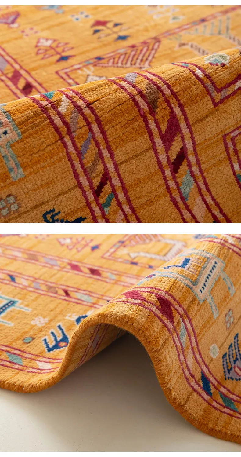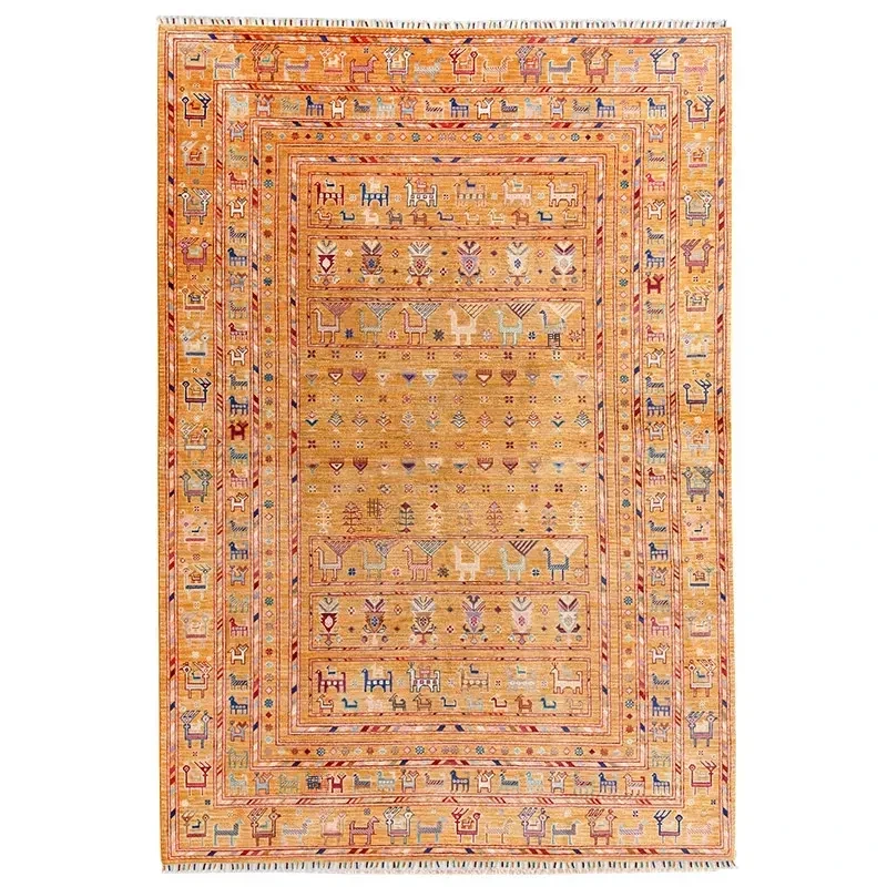 フォルム美しいアフガニスタン産、無ホルムアルデヒド・無接着剤のヴィンテージウール手織りアメリカンペルシャオレンジラグ。リビングにぴったりの高品質で安心なインテリア。
