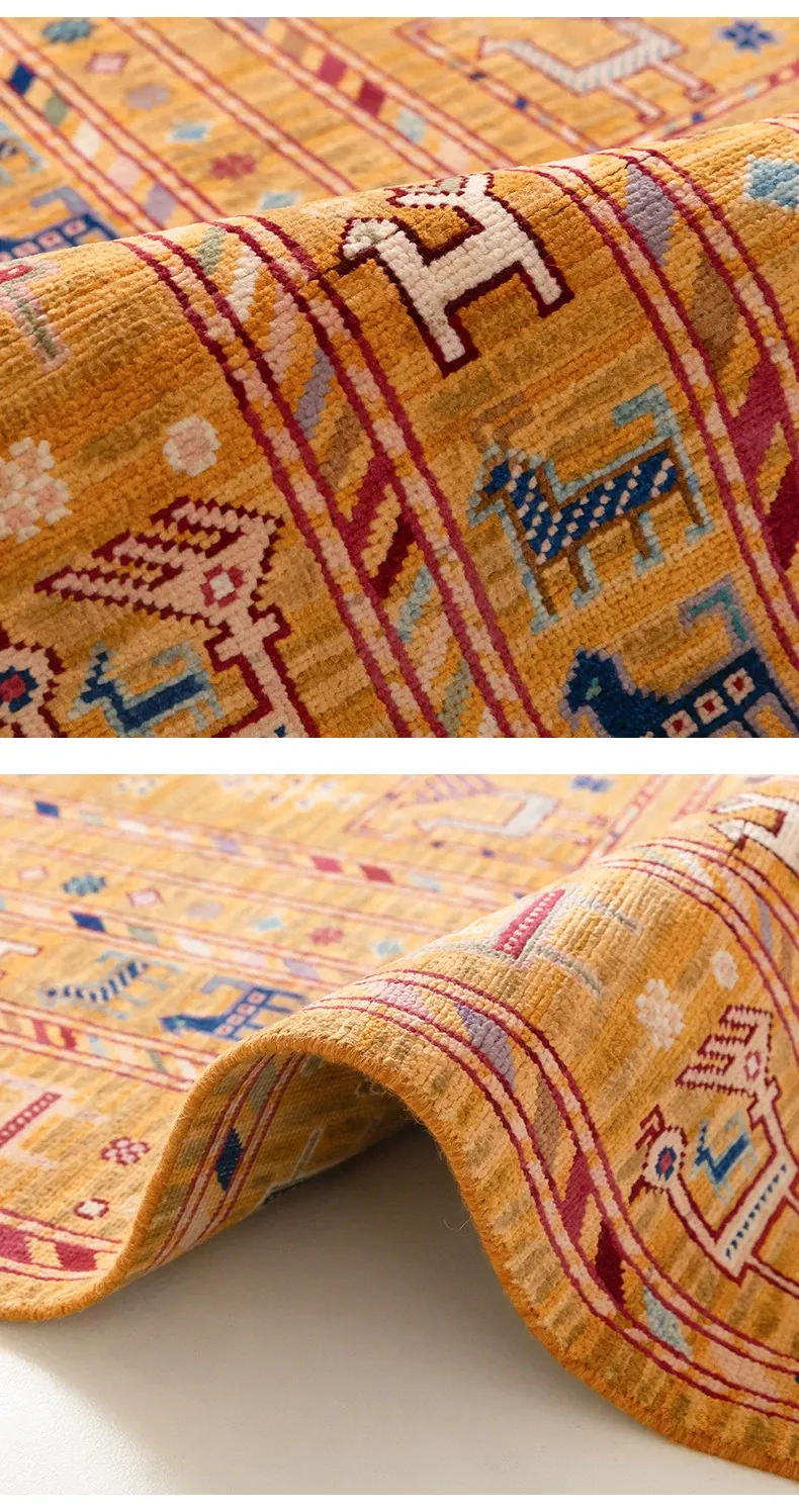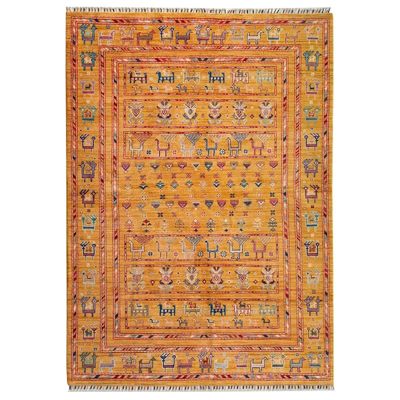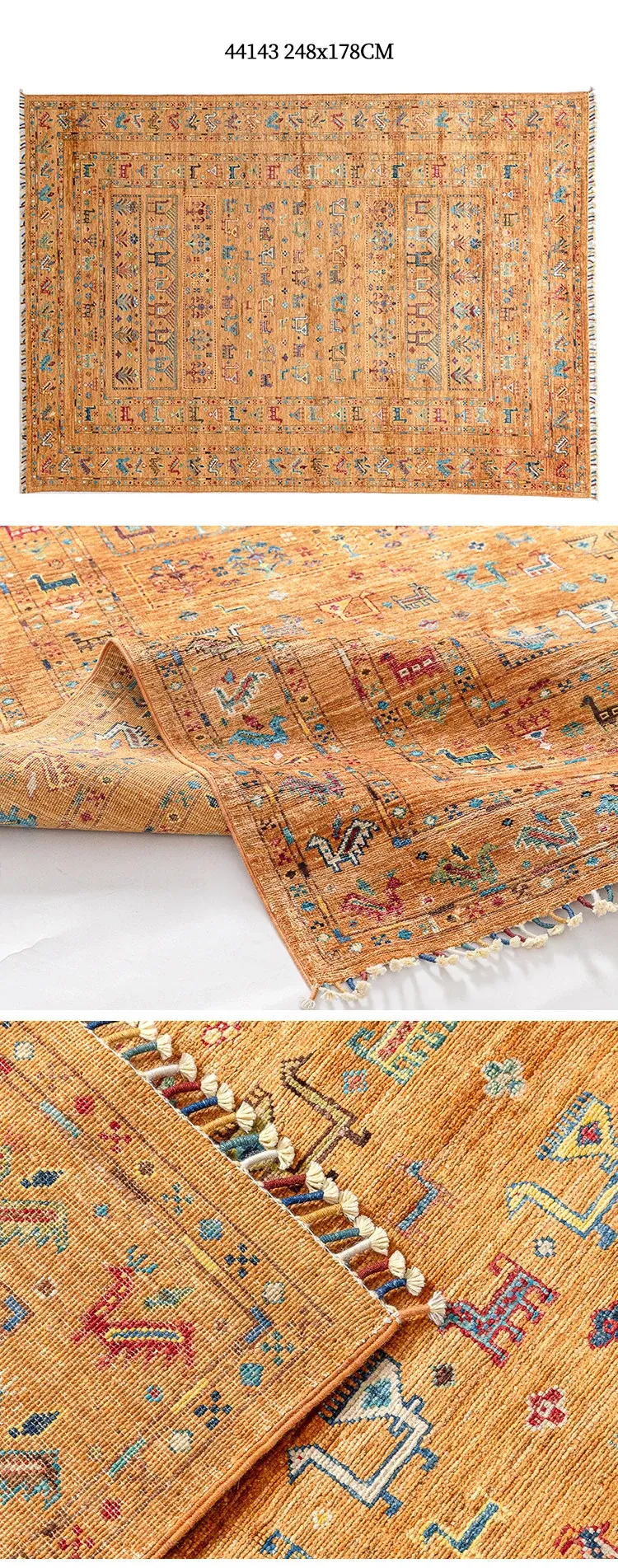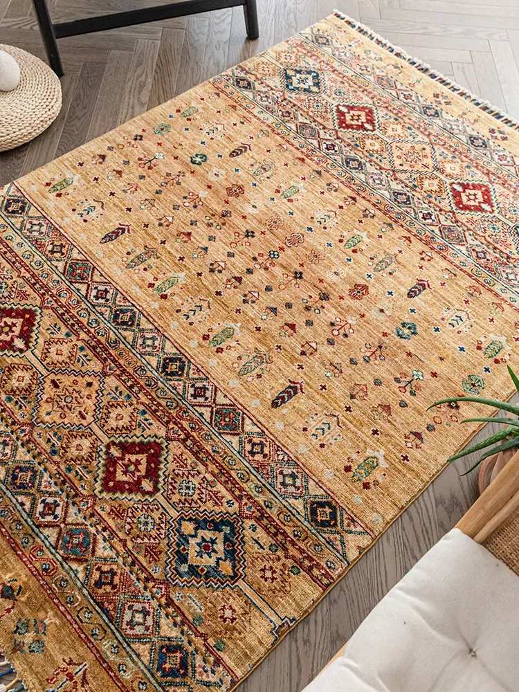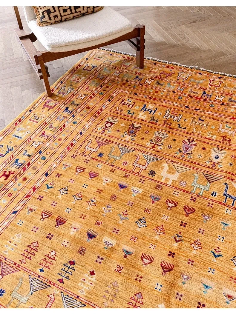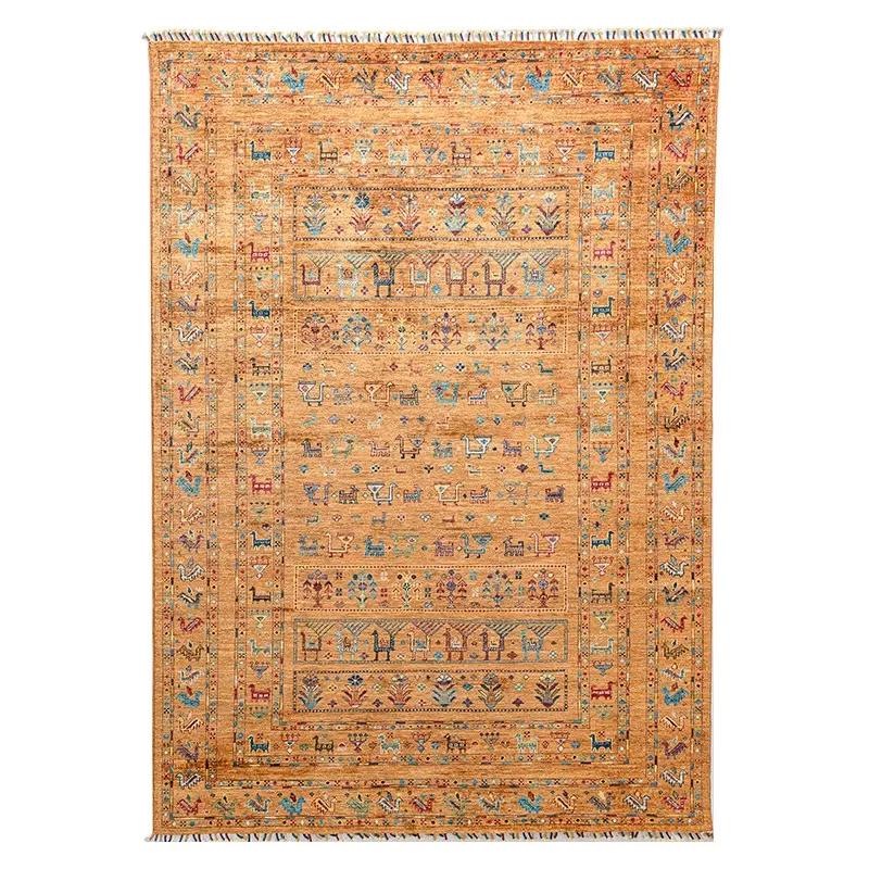 フォルム美しいアフガニスタン産、無ホルムアルデヒド・無接着剤のヴィンテージウール手織りアメリカンペルシャオレンジラグ。リビングにぴったりの高品質で安心なインテリア。