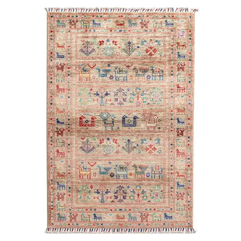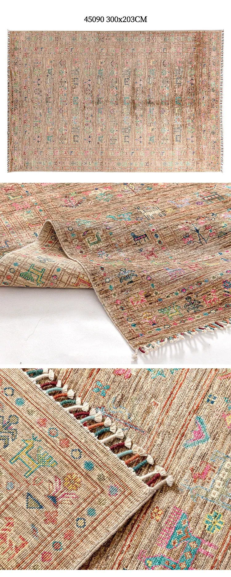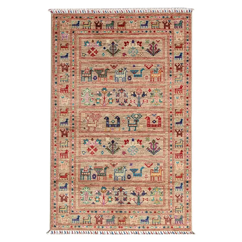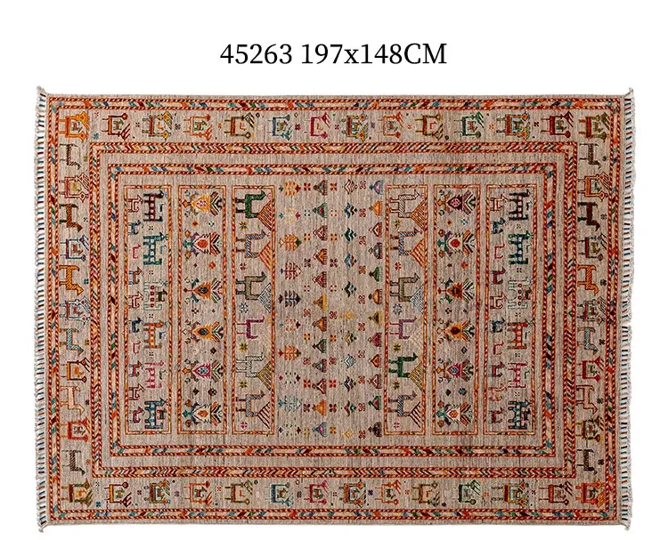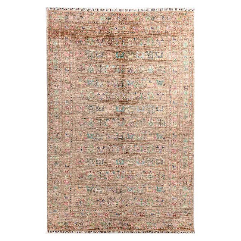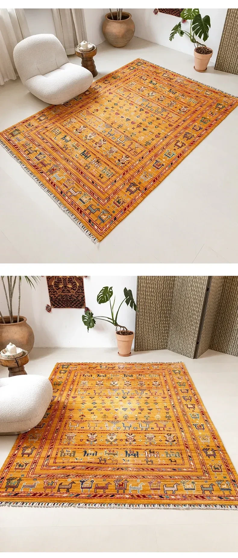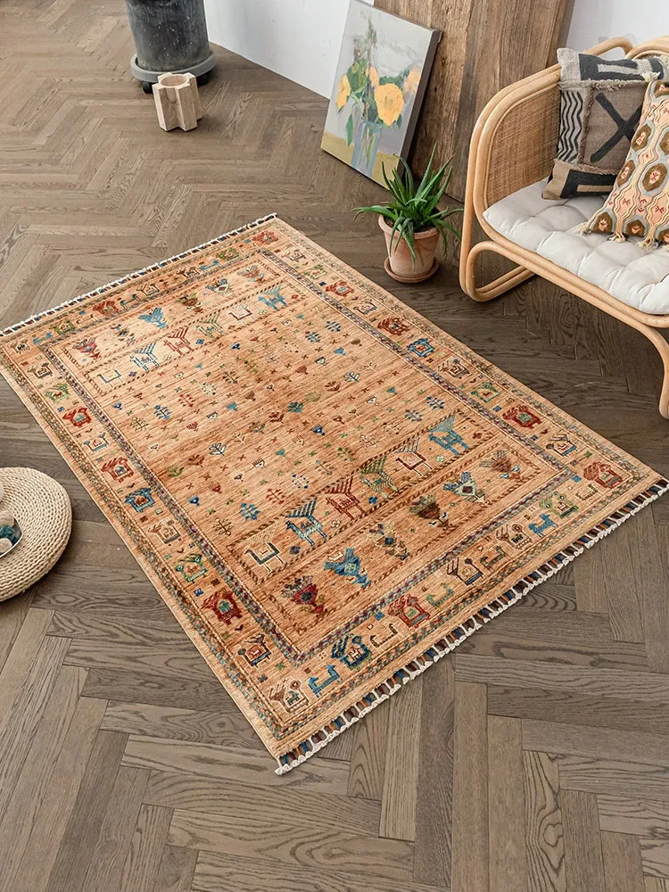 フォルム美しいアフガニスタン産、無ホルムアルデヒド・無接着剤のヴィンテージウール手織りアメリカンペルシャオレンジラグ。リビングにぴったりの高品質で安心なインテリア。