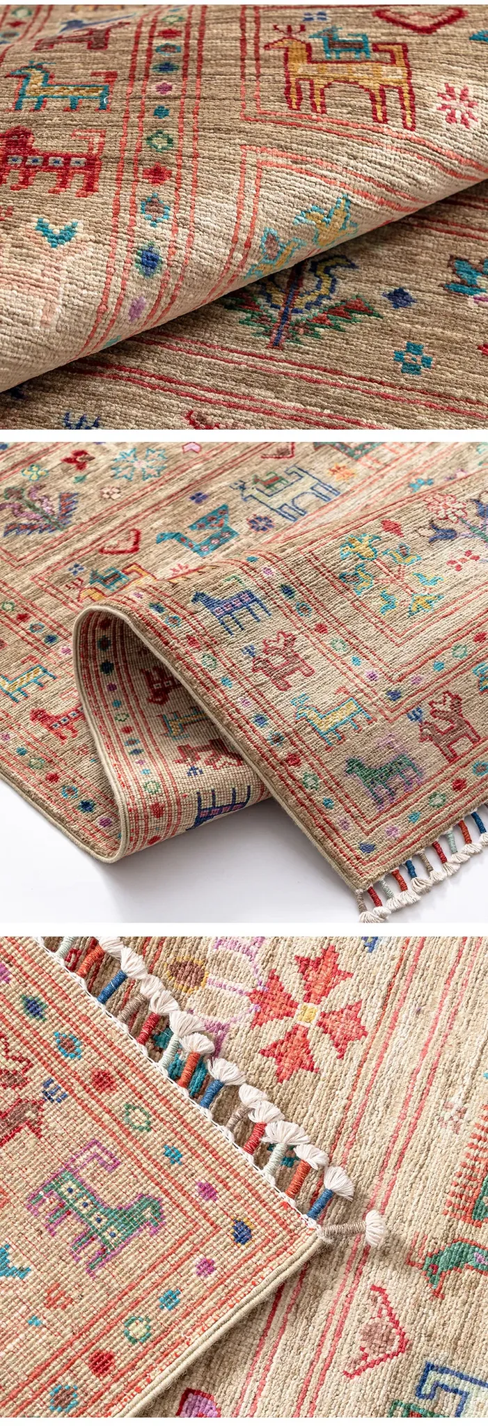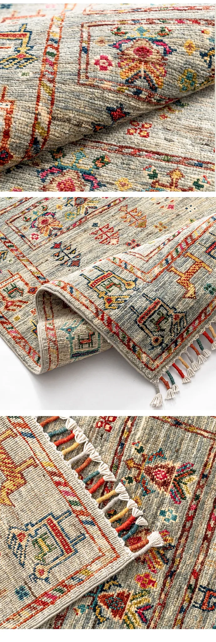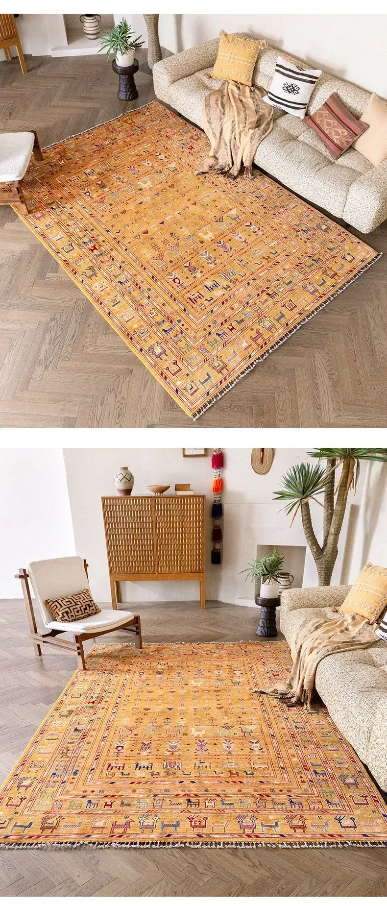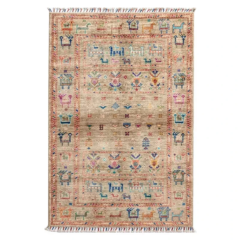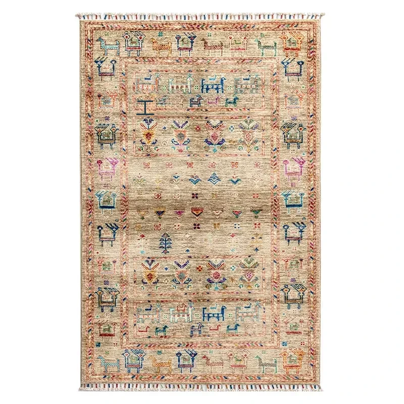 フォルム美しいアフガニスタン産、無ホルムアルデヒド・無接着剤のヴィンテージウール手織りアメリカンペルシャオレンジラグ。リビングにぴったりの高品質で安心なインテリア。
