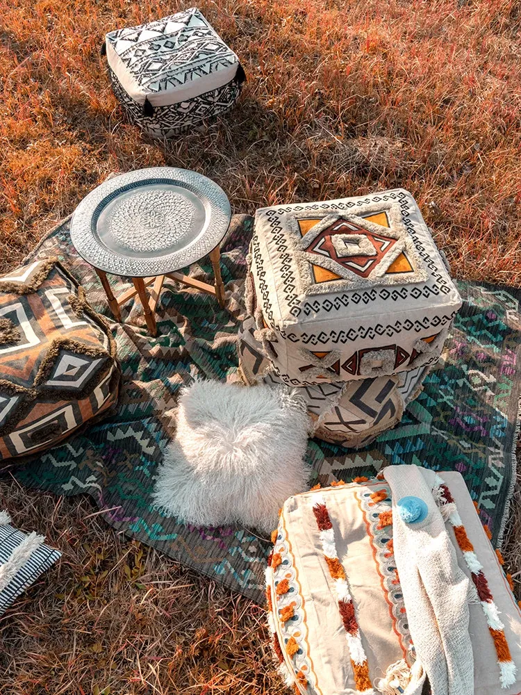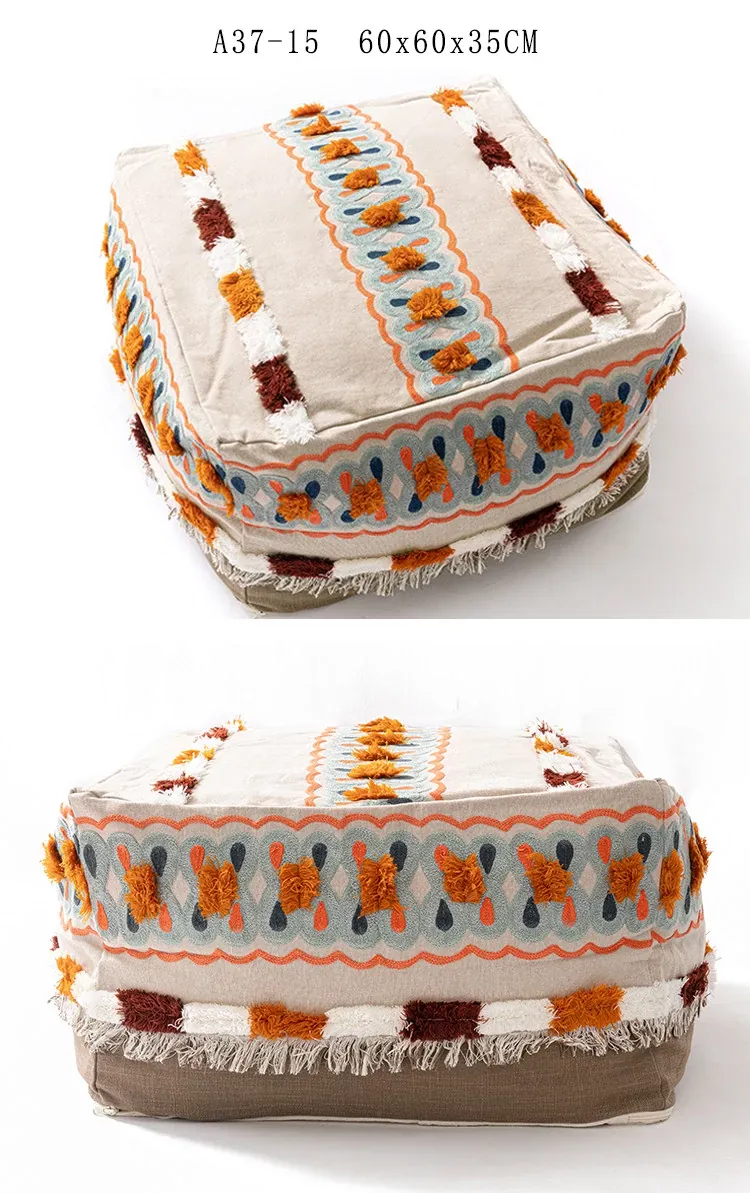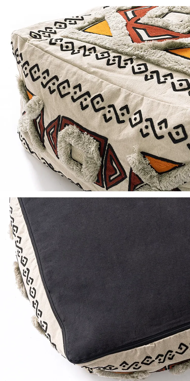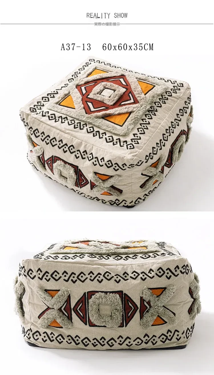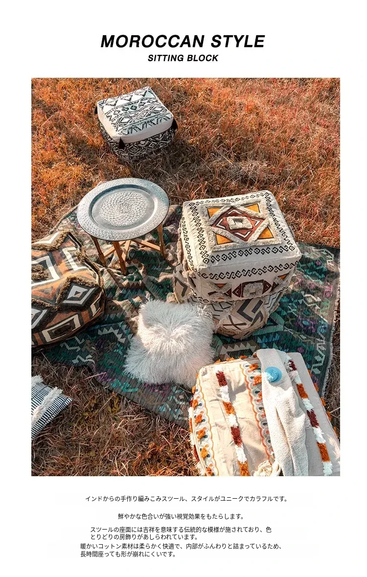 輸入手作刺繍モロッコクッションスツール|ふわふわの豆袋ラウンジソファ|リラックスできる足置きや靴を履くためのスツールにも最適!おしゃれで機能的な四角いスツールです。