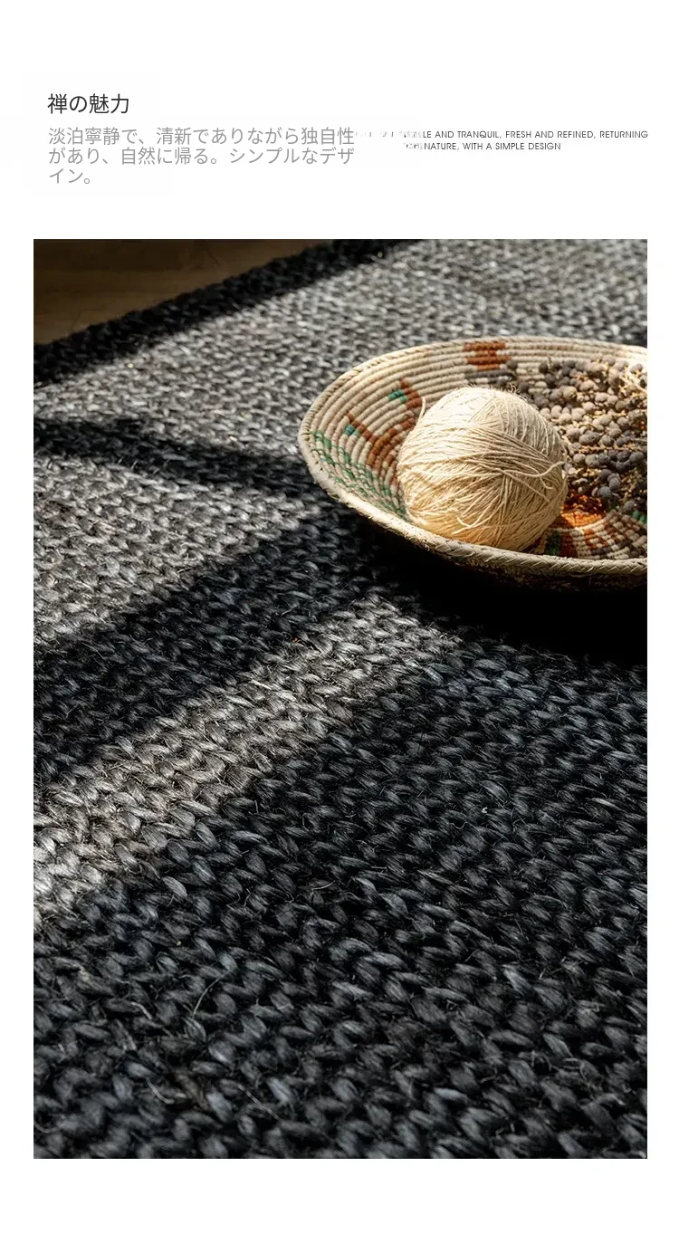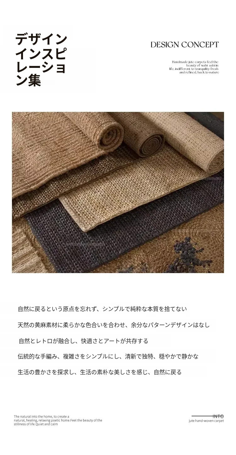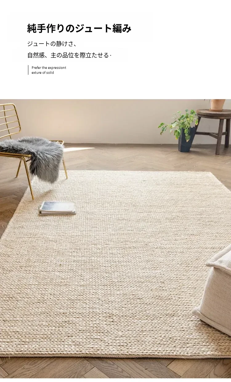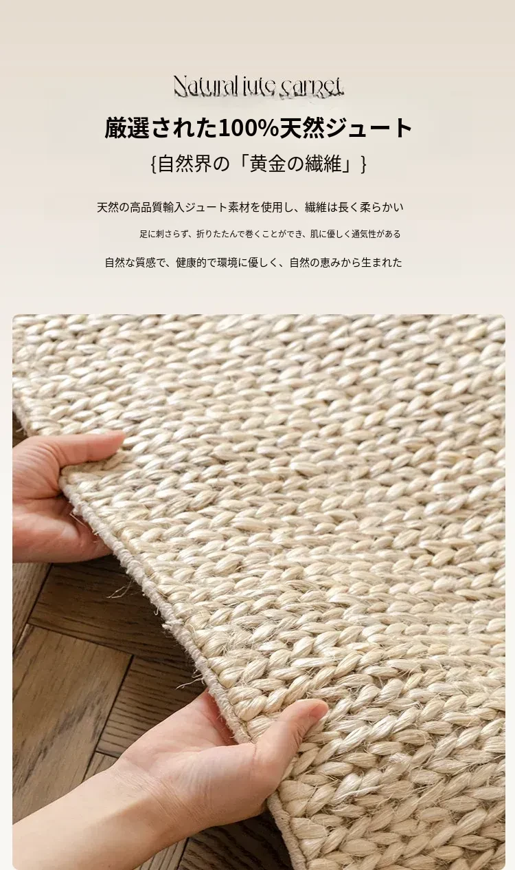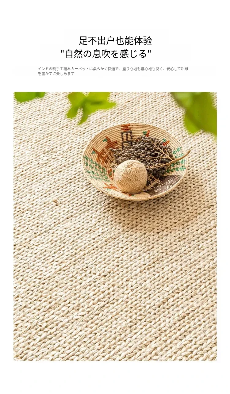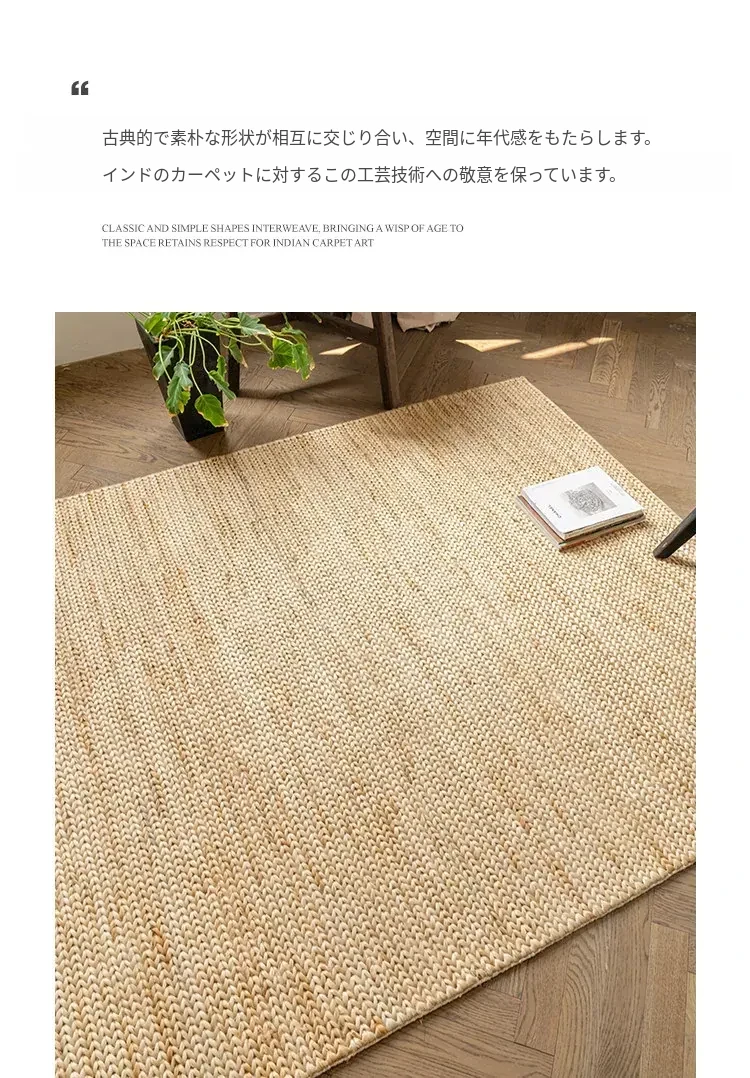 インド直輸入の北欧風シンプルモダン手作りジュートカーペット - アメリカンカントリーと中華禅の融合、リビングや寝室に最適な心地よい一品!