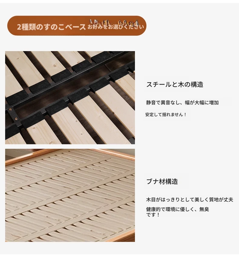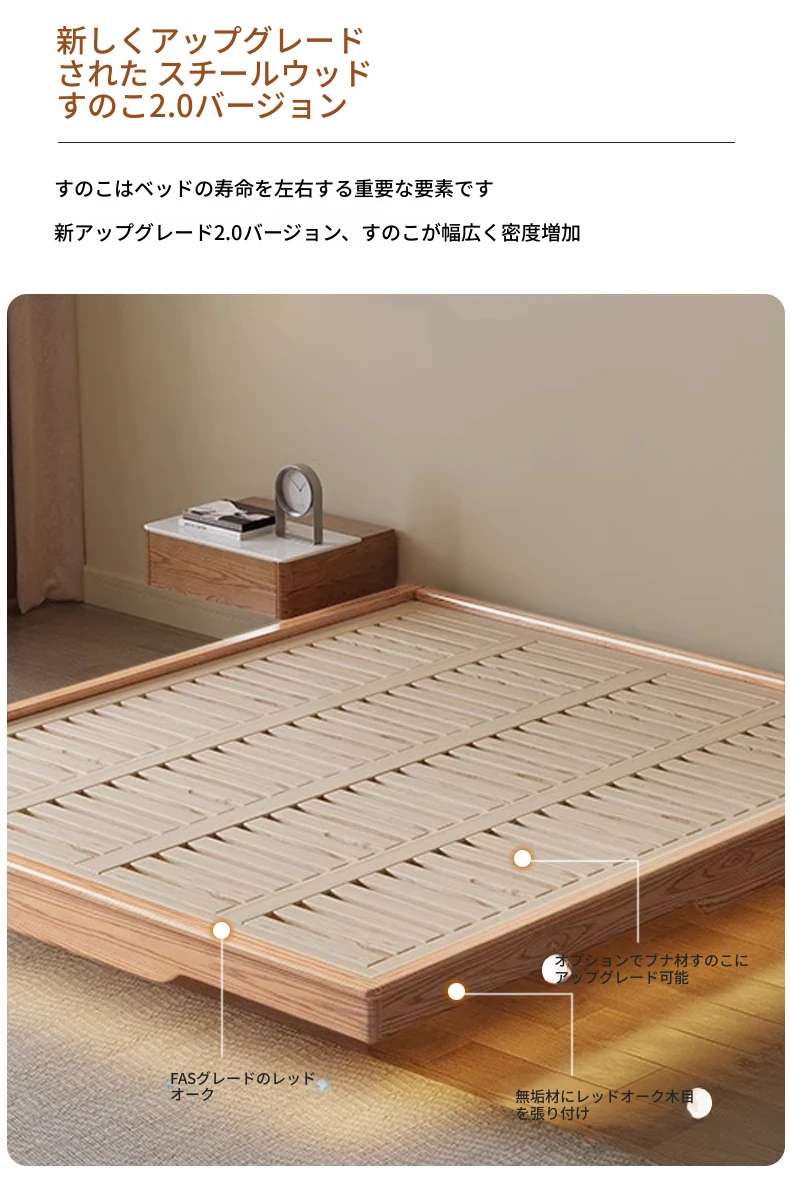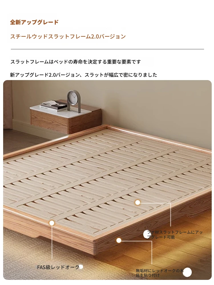 レッドオークベッドフレーム【収納可】+スチールウッド排骨架付き