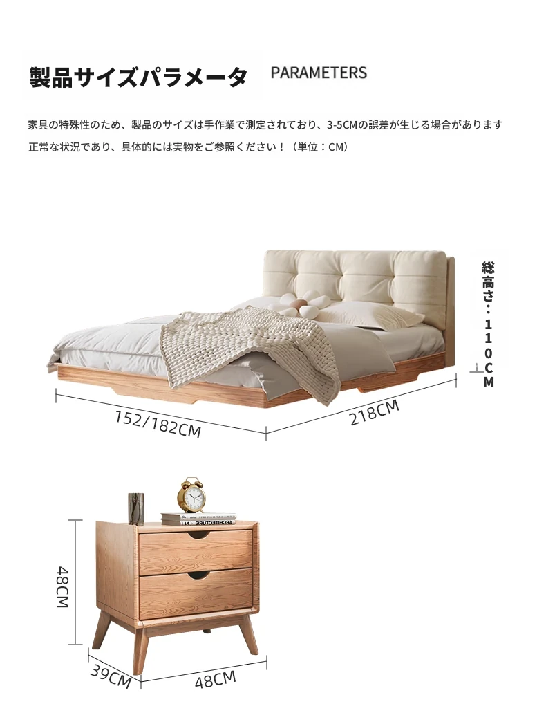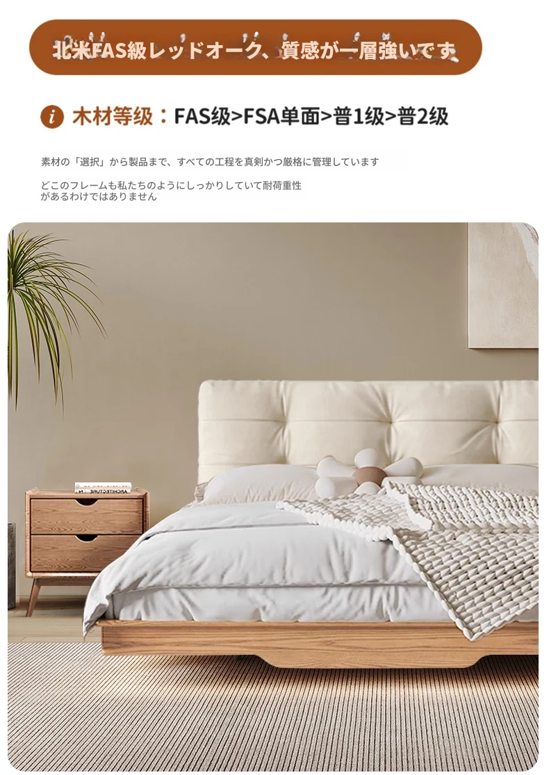 レッドオークベッドフレーム【収納可】+スチールウッド排骨架付き+ナイトテーブル2個