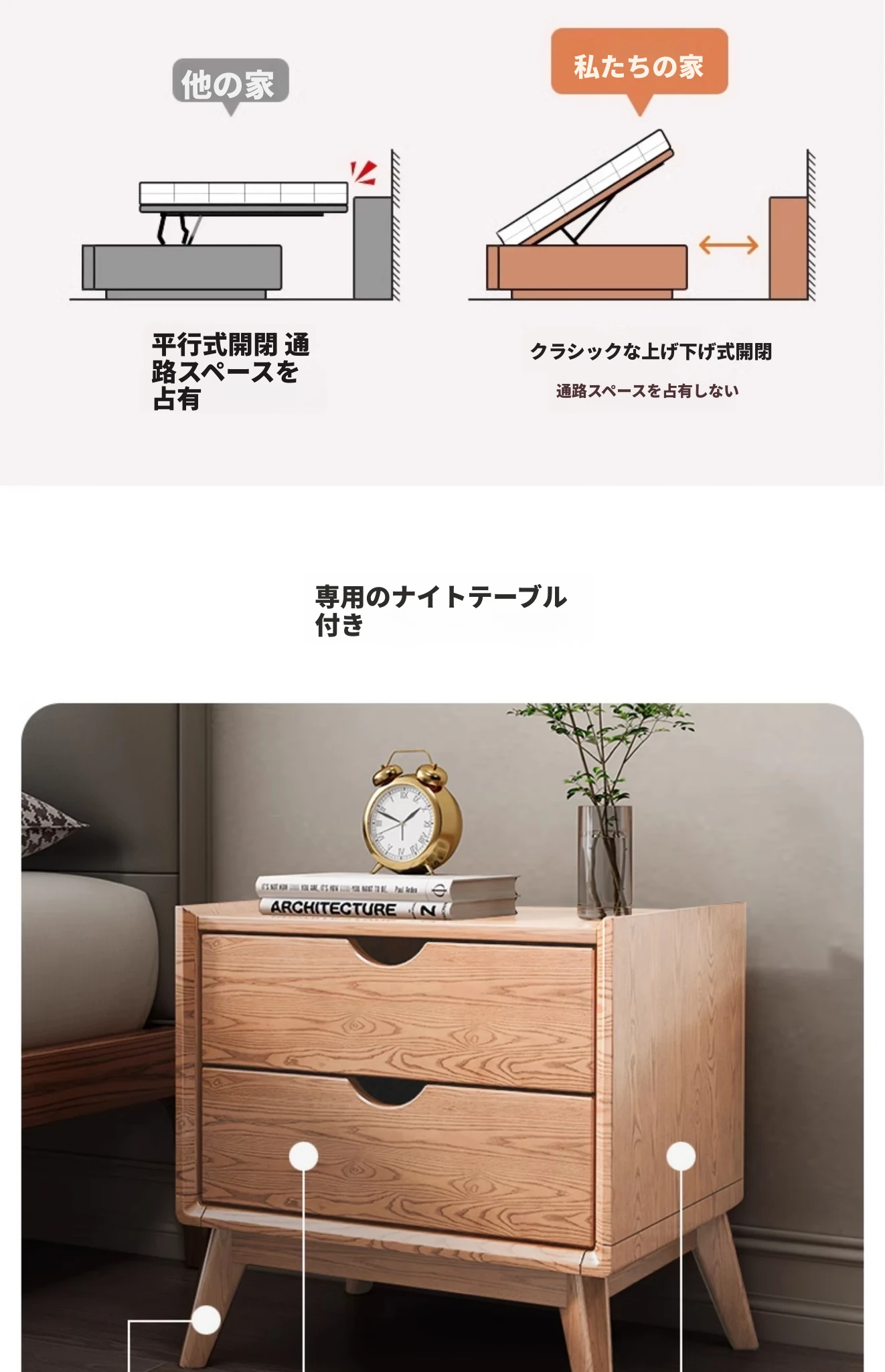レッドオークベッドフレーム【収納可】+スチールウッド排骨架付き+ナイトテーブル1個