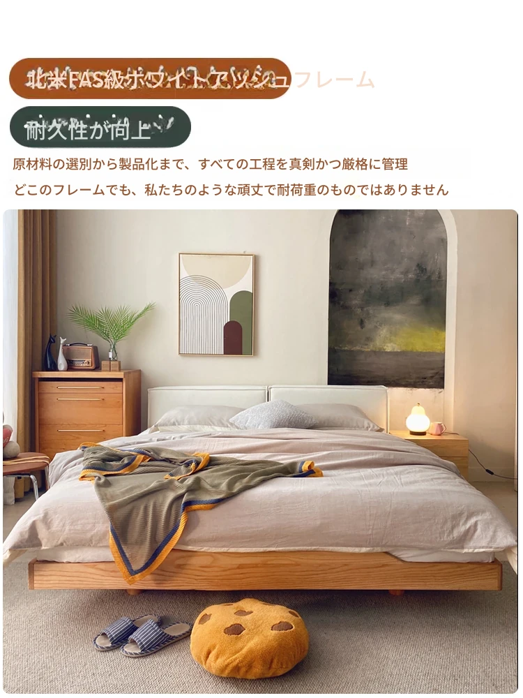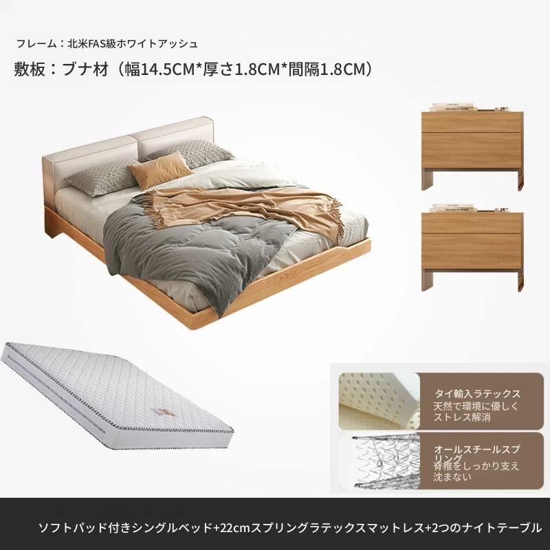アッシュ材ベッド ソフトパック付き(2cm厚ブナ材プランク)+22cmラテックススプリングマットレス+ナイトテーブル*2