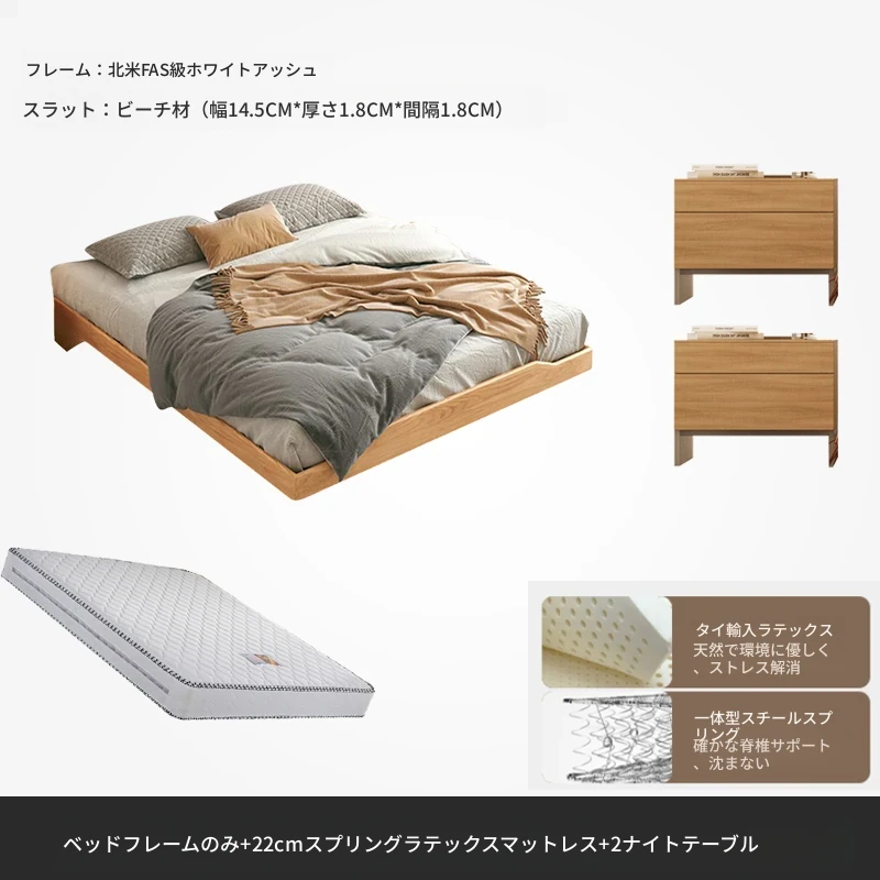アッシュ材ベッド ソフトパックなし(2cm厚ブナ材プランク)+22cmラテックススプリングマットレス+ナイトテーブル*2