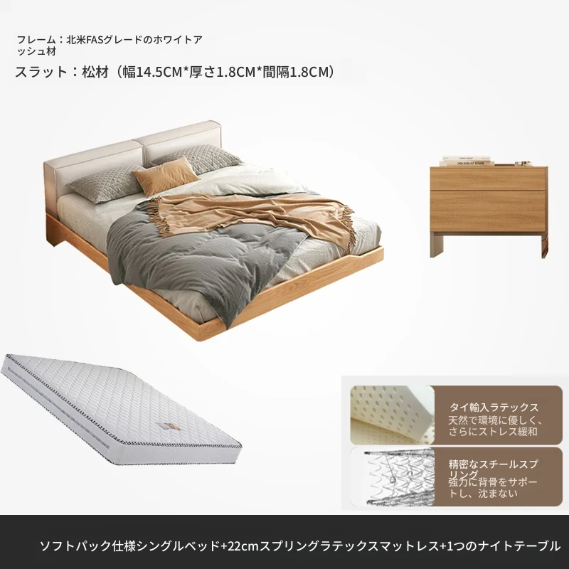 アッシュ材ベッド ソフトパック付き(2cm厚ブナ材プランク)+22cmラテックススプリングマットレス+ナイトテーブル*1