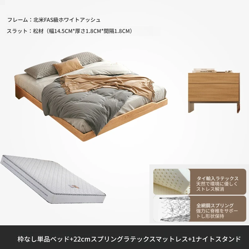 アッシュ材ベッド ソフトパックなし(2cm厚ブナ材プランク)+22cmラテックススプリングマットレス+ナイトテーブル*1