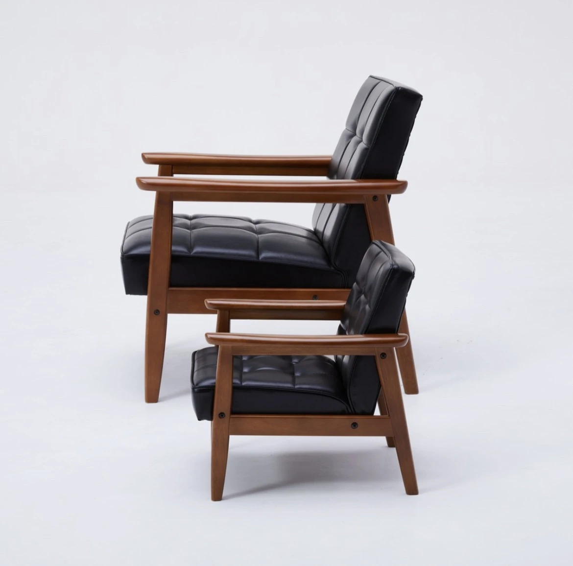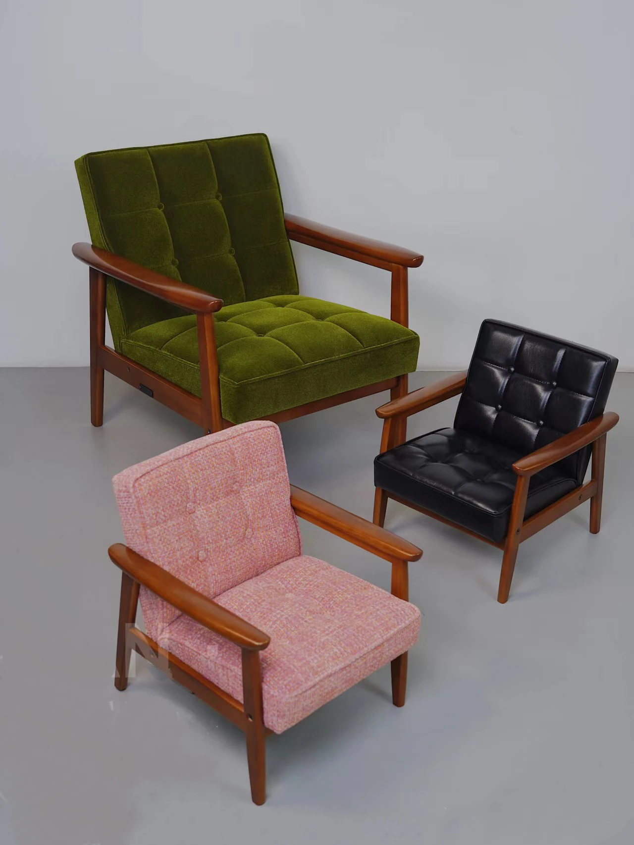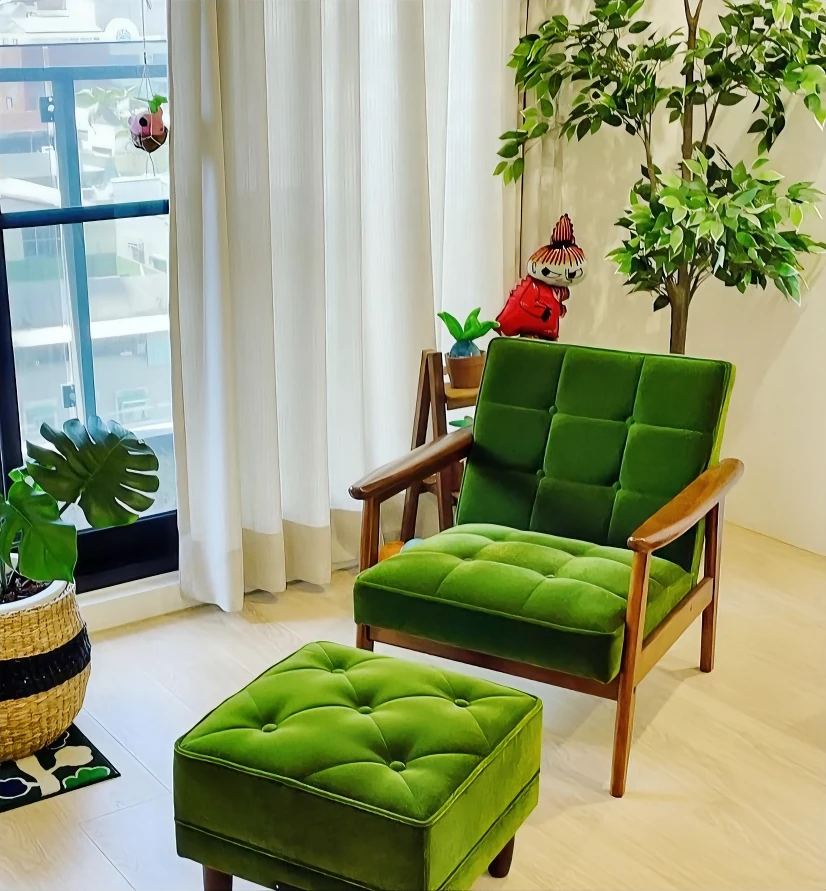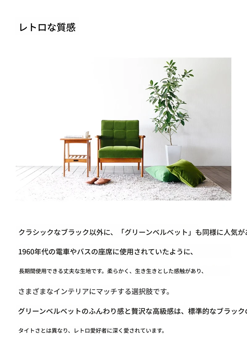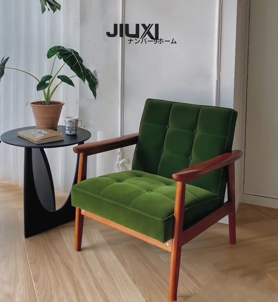 カリモク風リプロダクション日本製一人用アームチェア、木製フレームとグリーンベルベット生地のリラックスソファチェア - 和の美しさを持つ心地よい休息空間をあなたに。