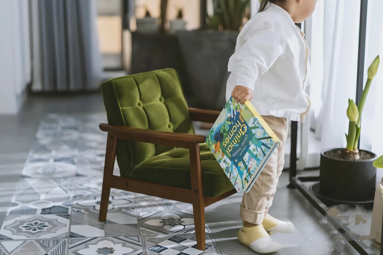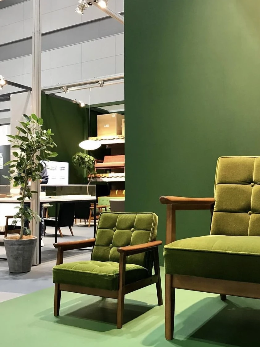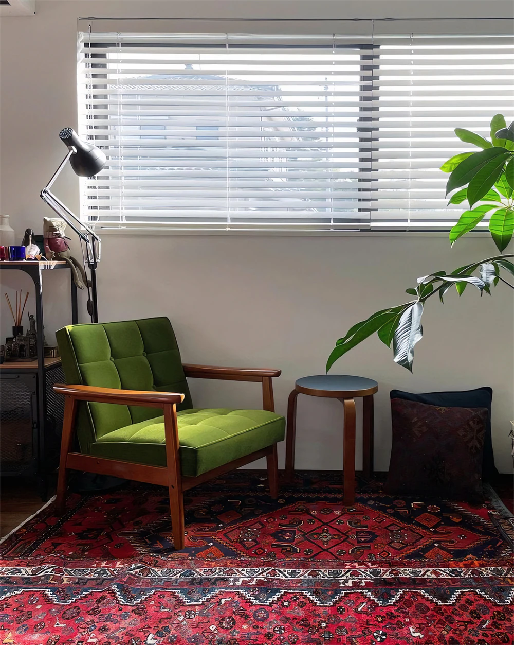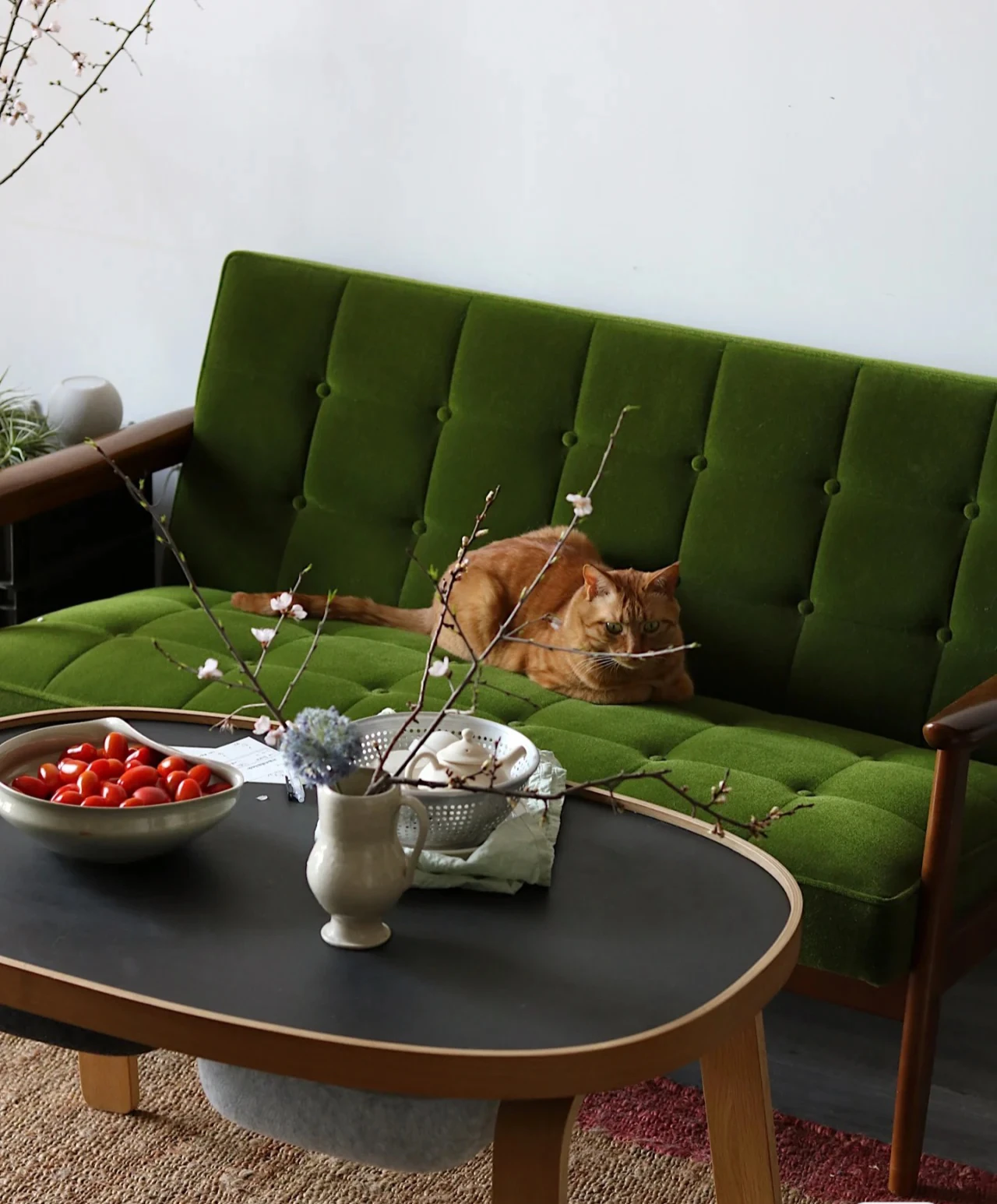 カリモク風リプロダクション日本製一人用アームチェア、木製フレームとグリーンベルベット生地のリラックスソファチェア - 和の美しさを持つ心地よい休息空間をあなたに。