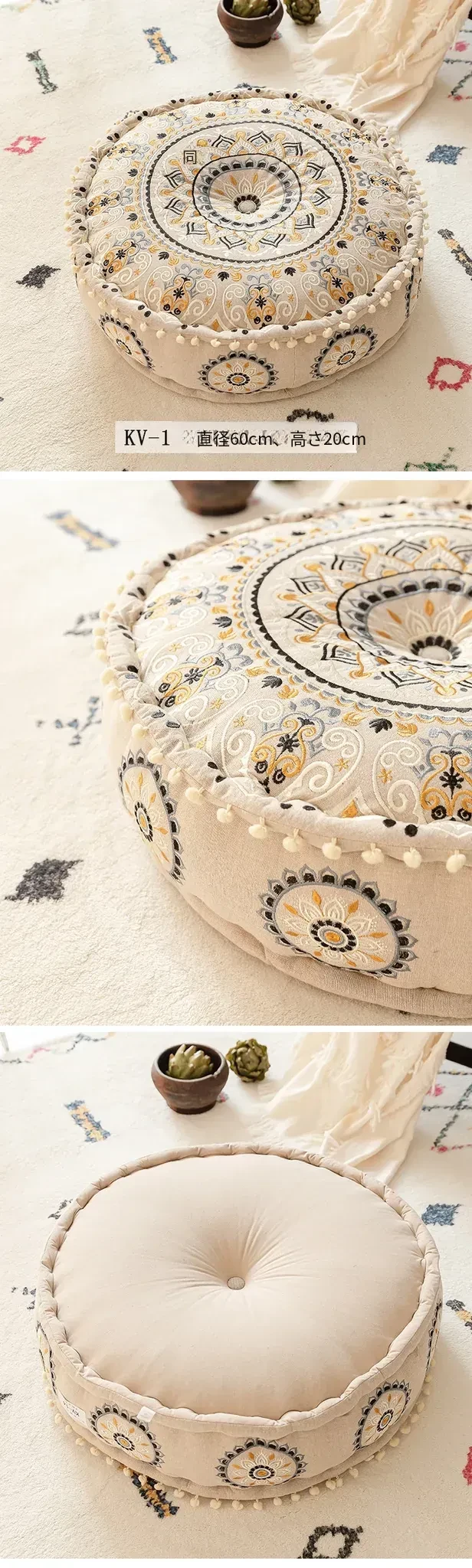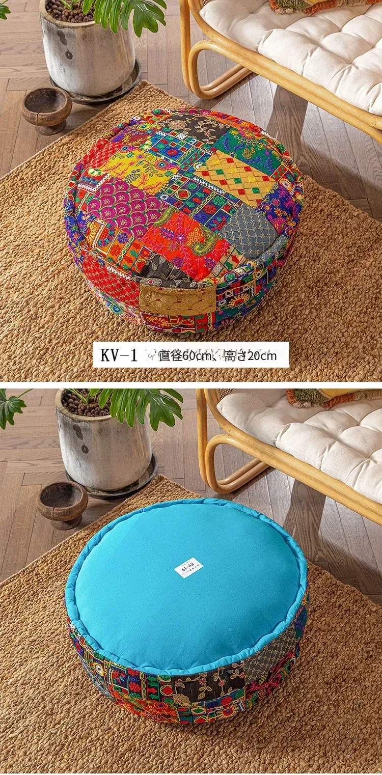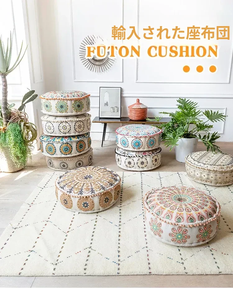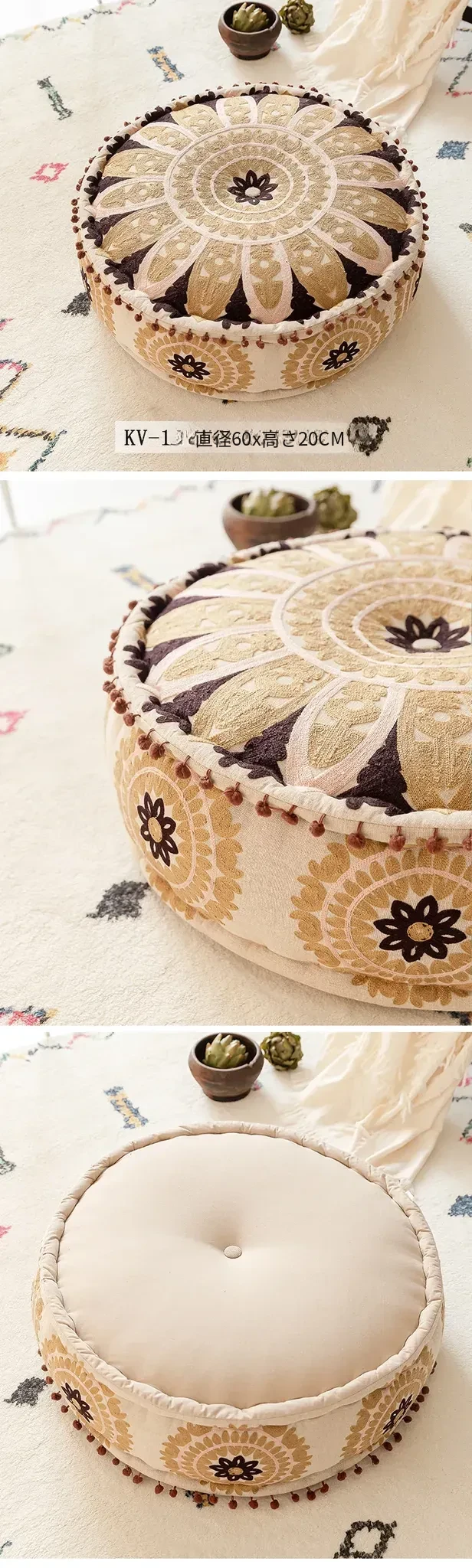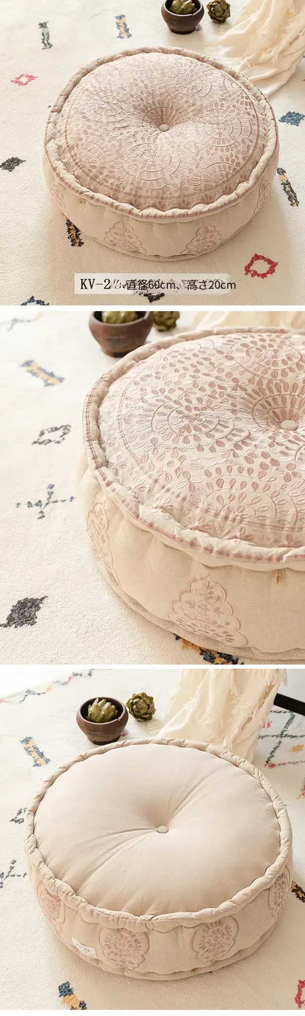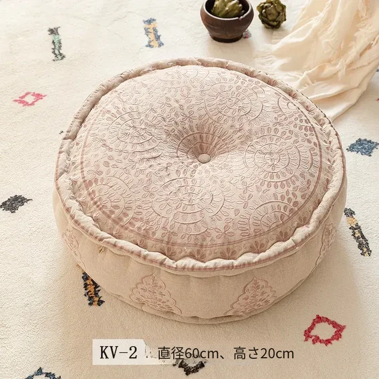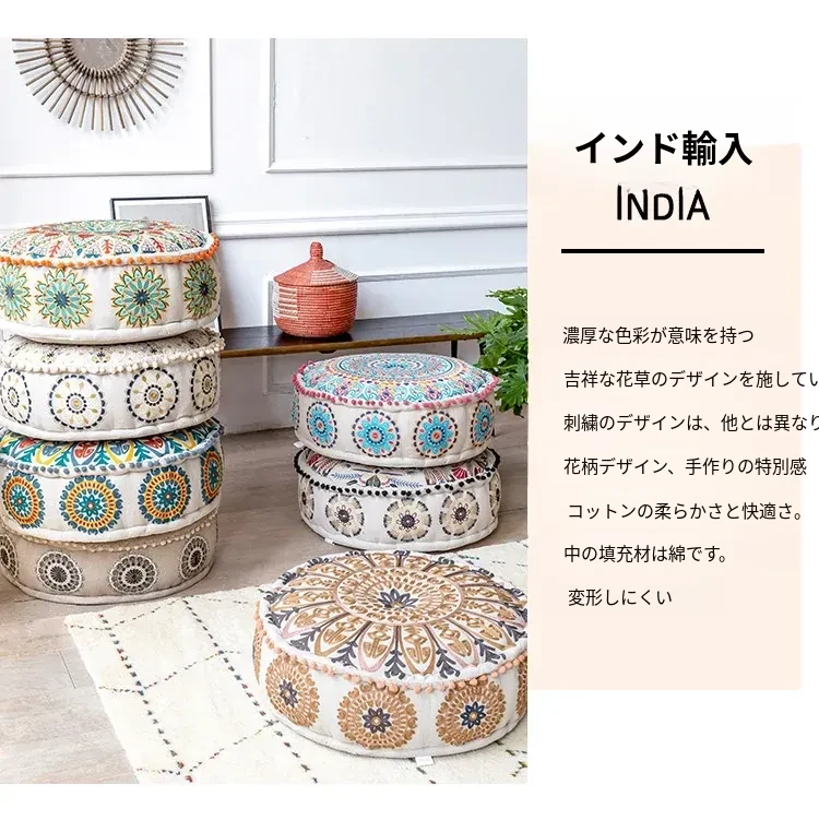 インド直輸入!厚手布製の大サイズ円形座布団 - 瞑想・座禅・ヨガに最適なタタミスタイルの座椅子。心地よい座り心地で、リラックスしたひとときをお届けします。