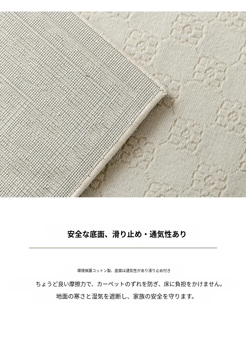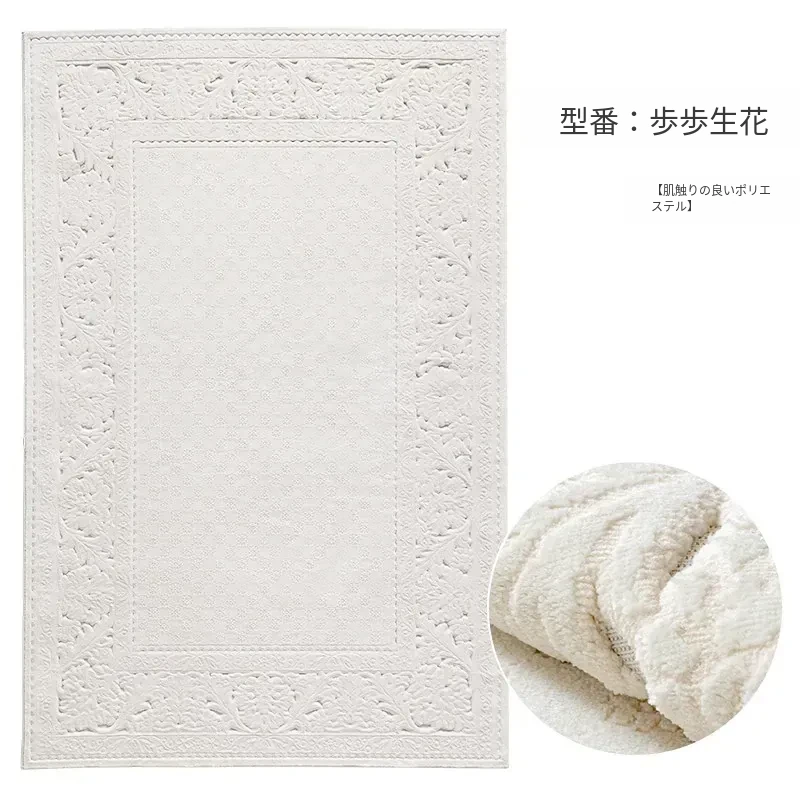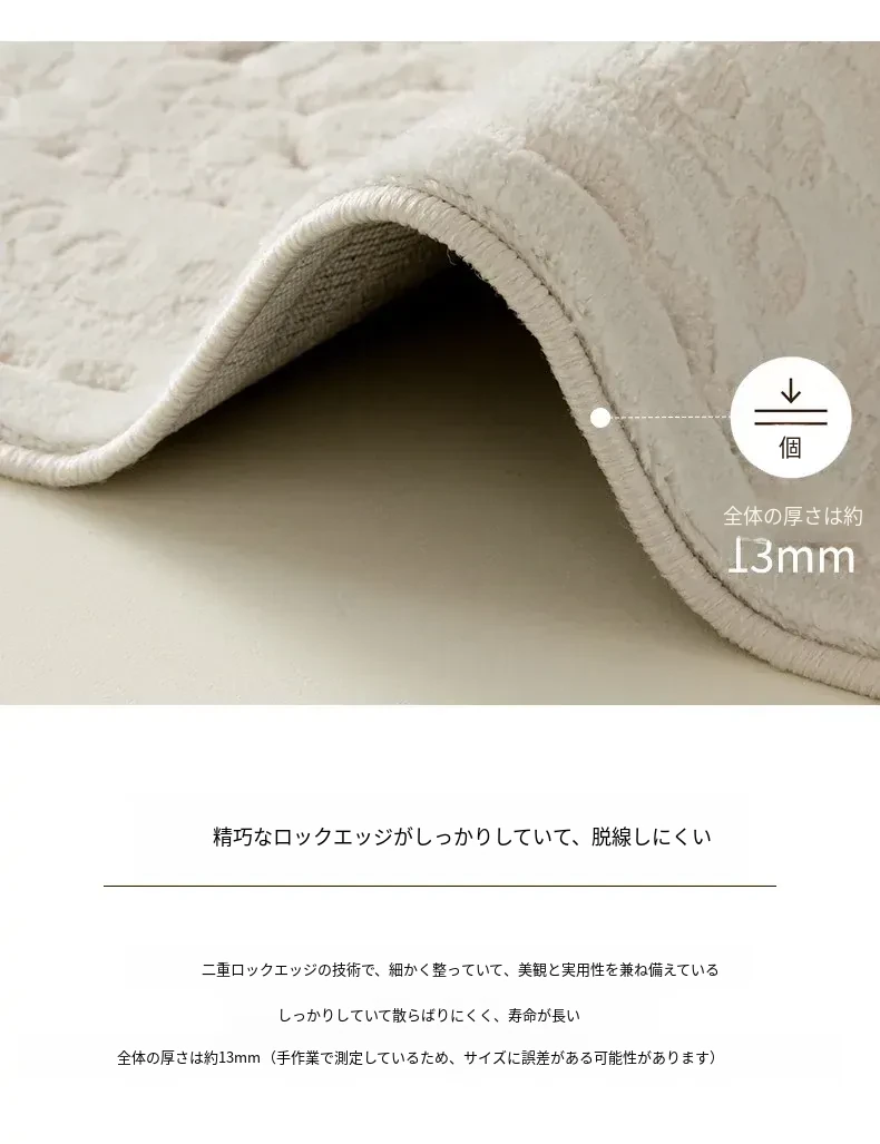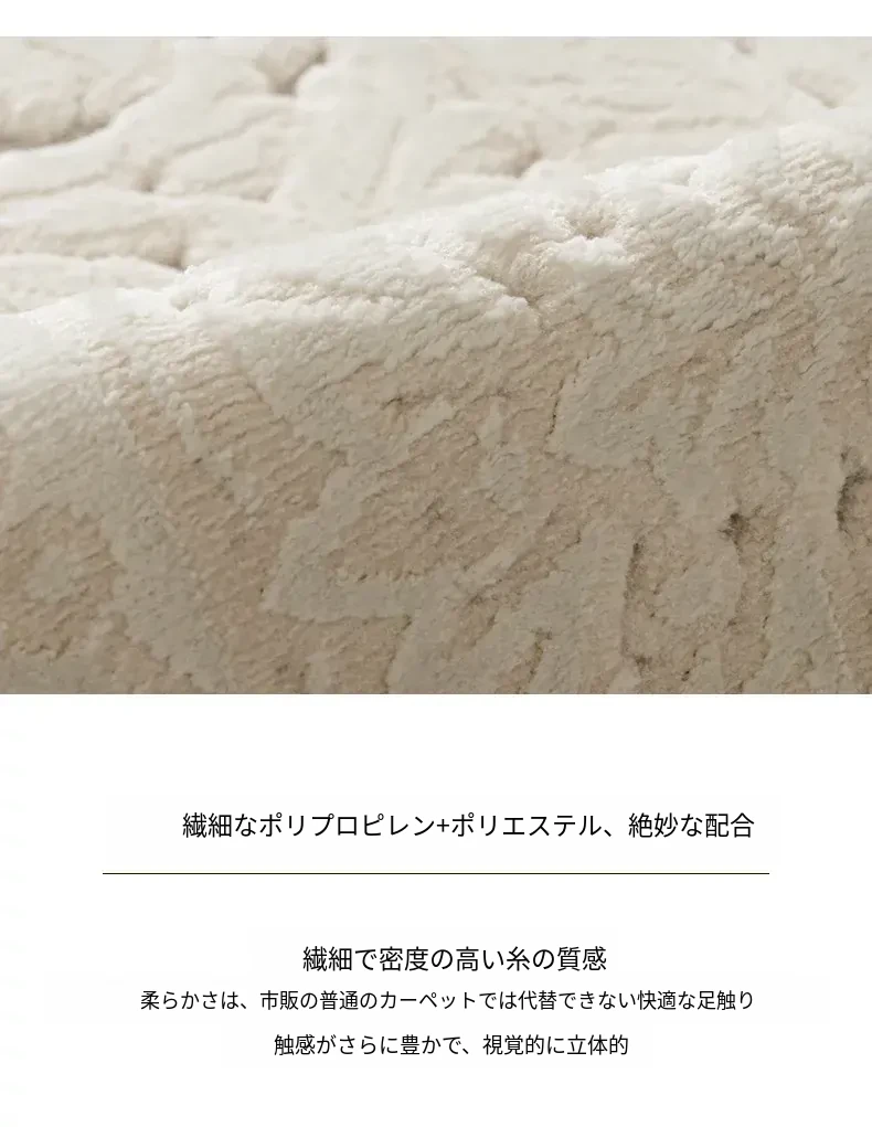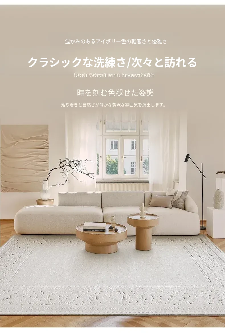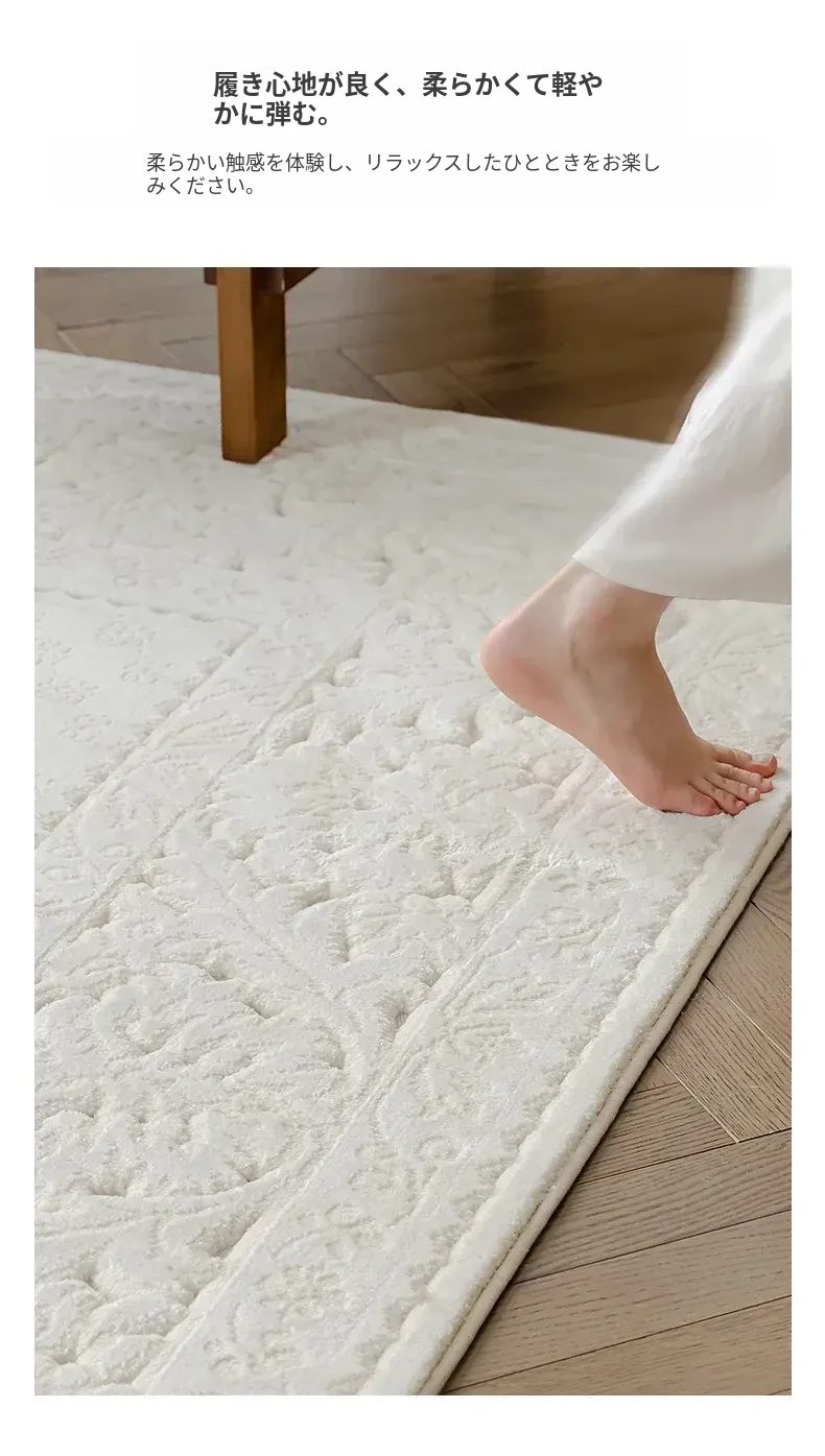 視覚と味覚を刺激するフレンチアンティークスタイルのクリーム色ラグ、厚手で高級感溢れ、接着剤不要。寝室やリビングに最適な防音効果で、心地よい空間を演出します。