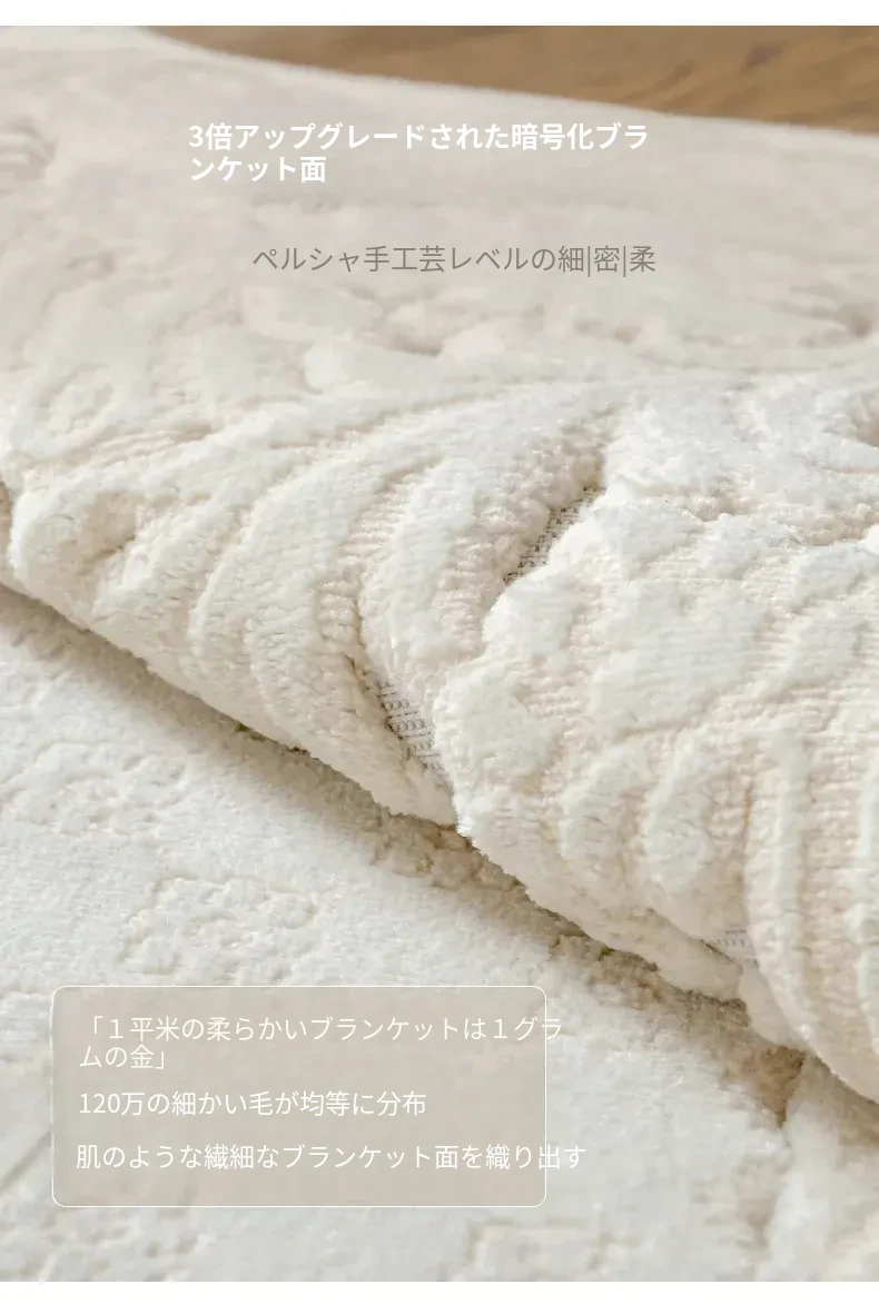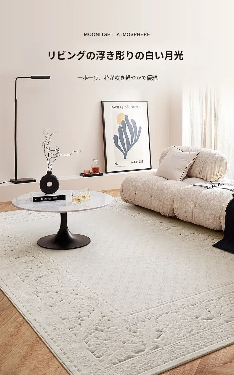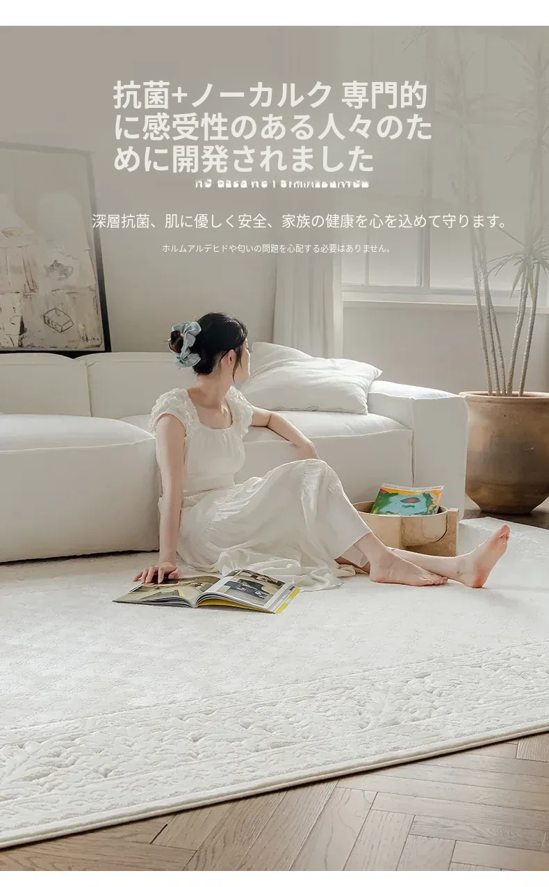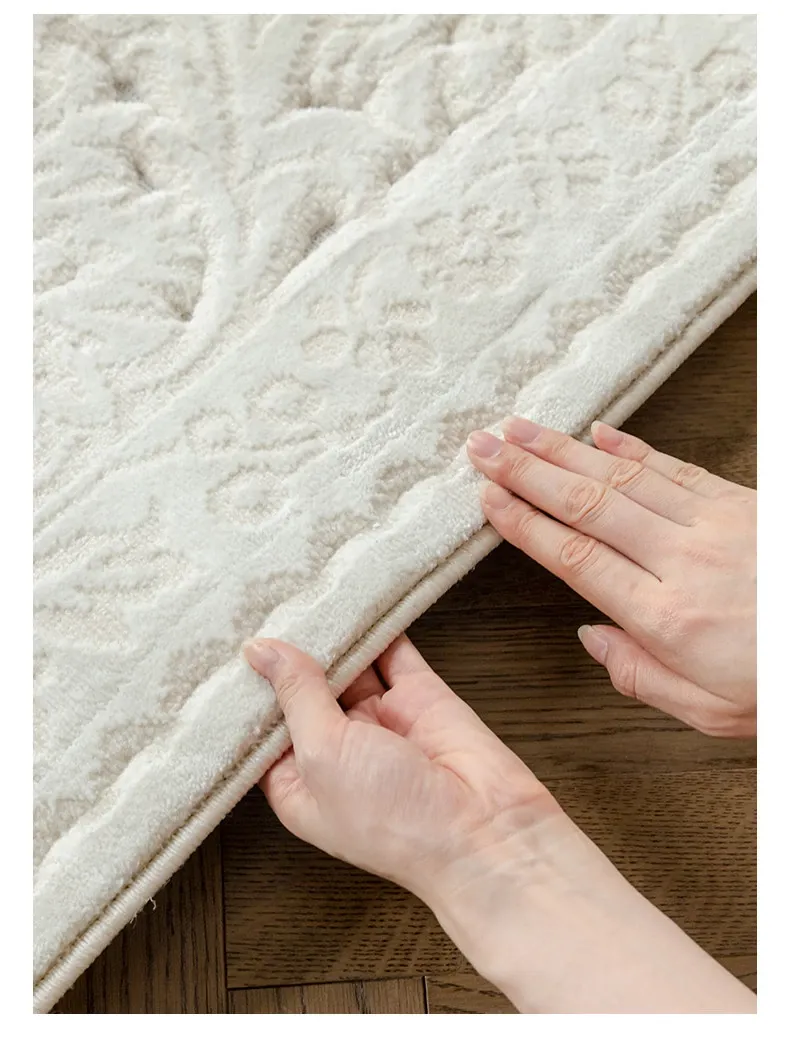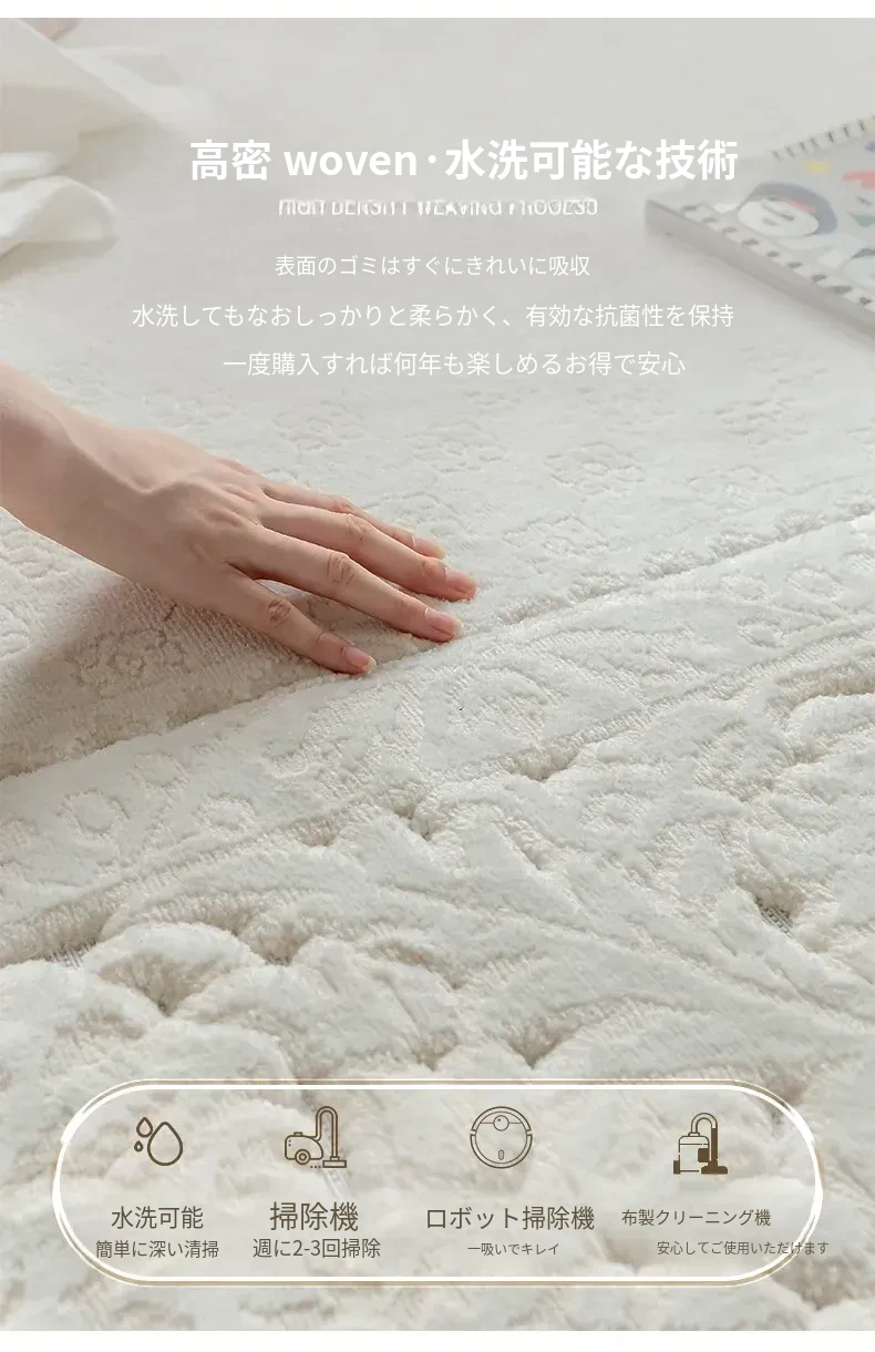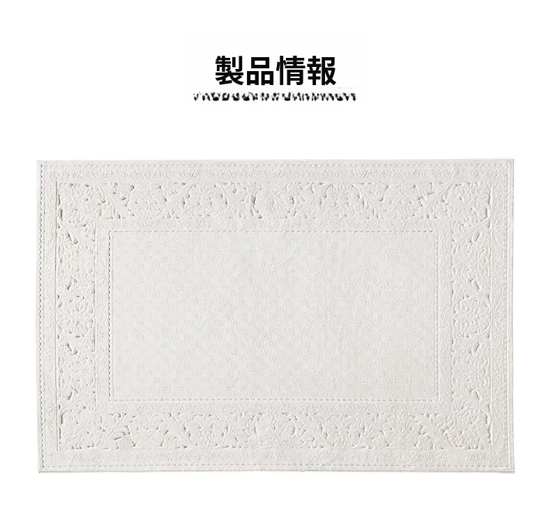 視覚と味覚を刺激するフレンチアンティークスタイルのクリーム色ラグ、厚手で高級感溢れ、接着剤不要。寝室やリビングに最適な防音効果で、心地よい空間を演出します。