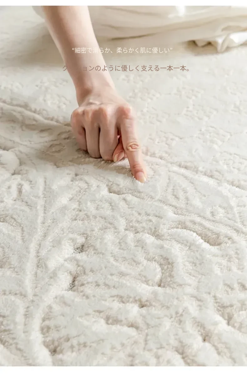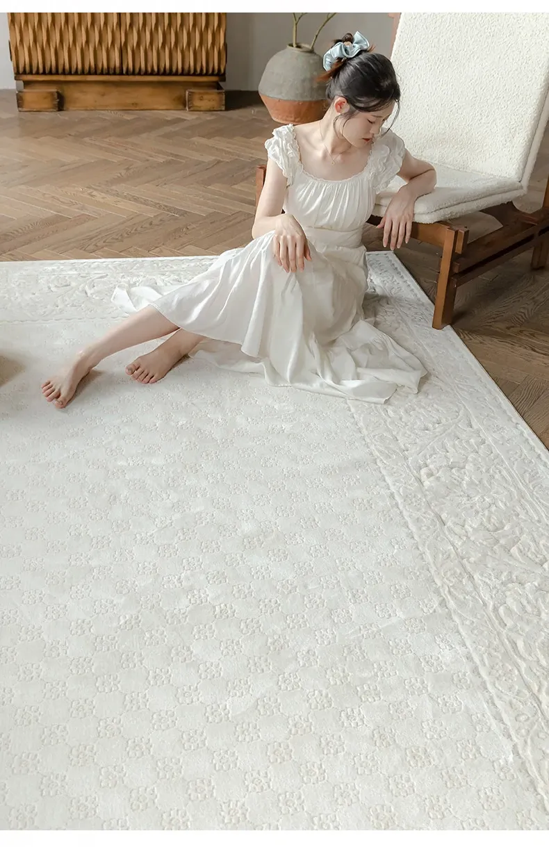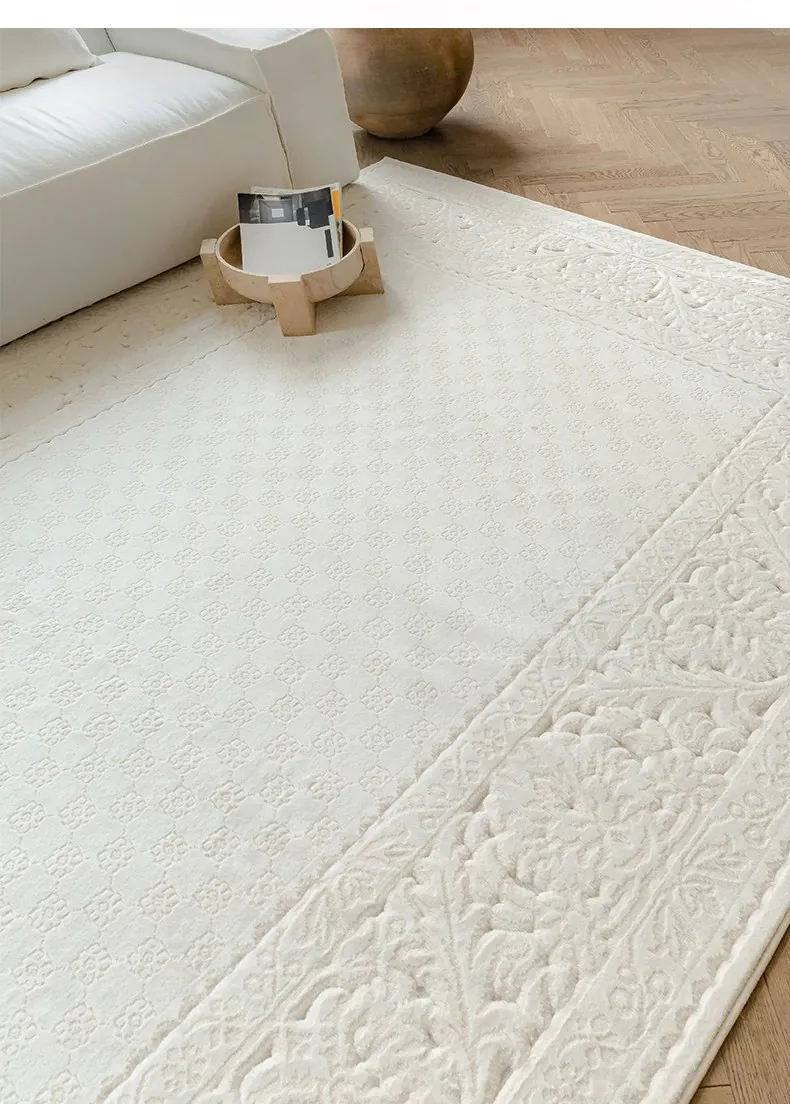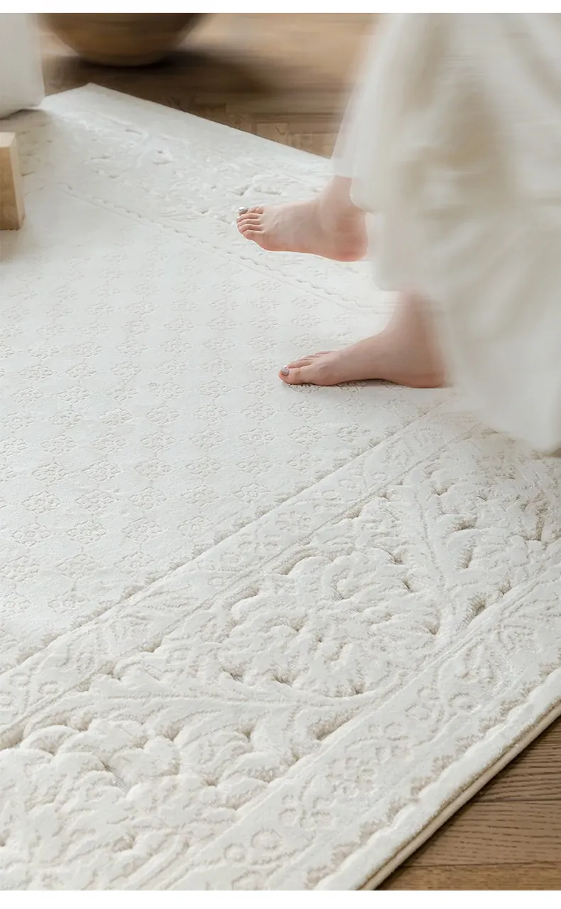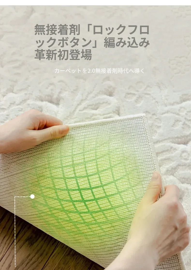 視覚と味覚を刺激するフレンチアンティークスタイルのクリーム色ラグ、厚手で高級感溢れ、接着剤不要。寝室やリビングに最適な防音効果で、心地よい空間を演出します。