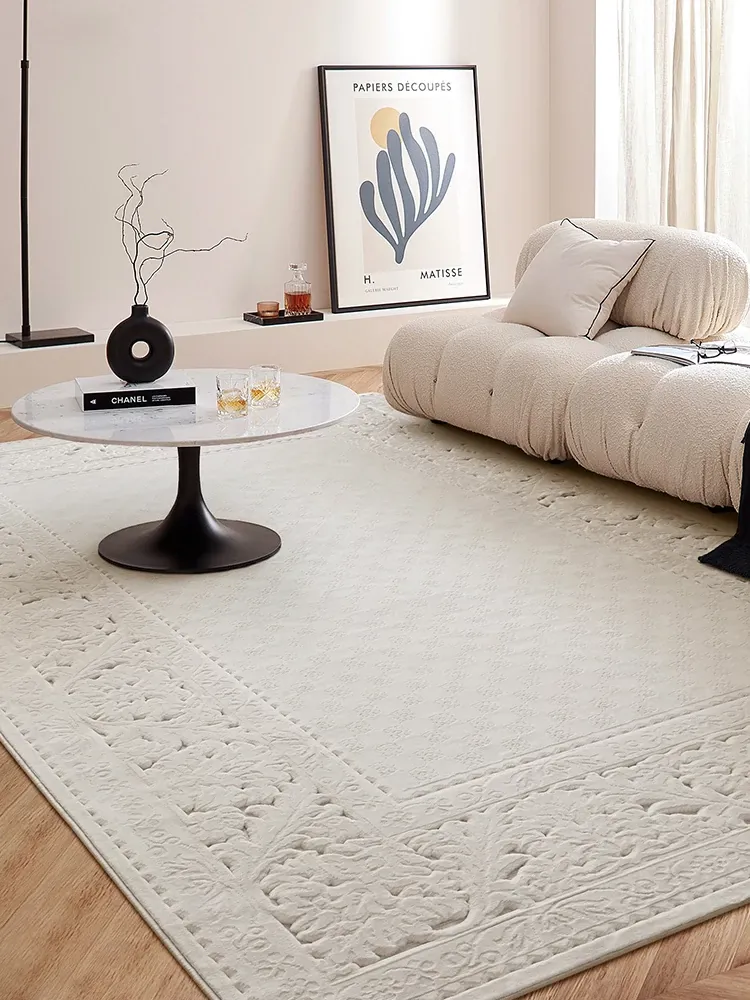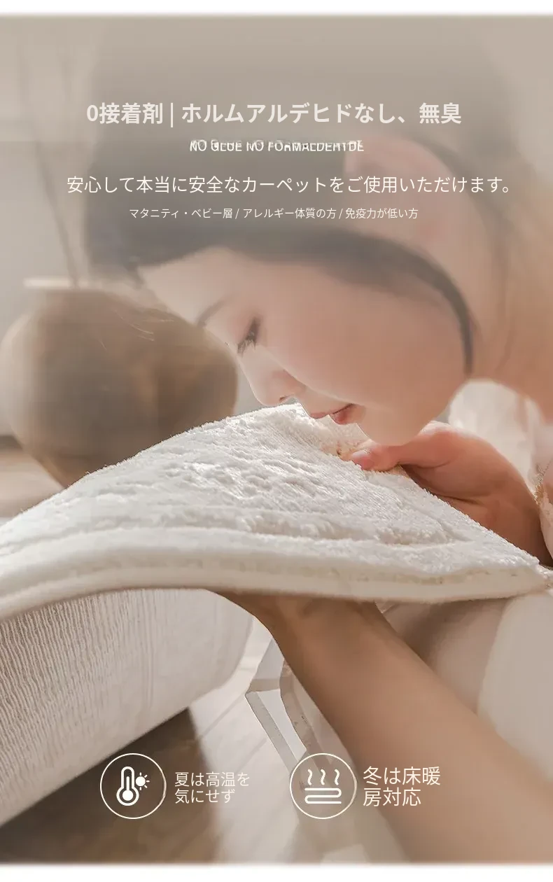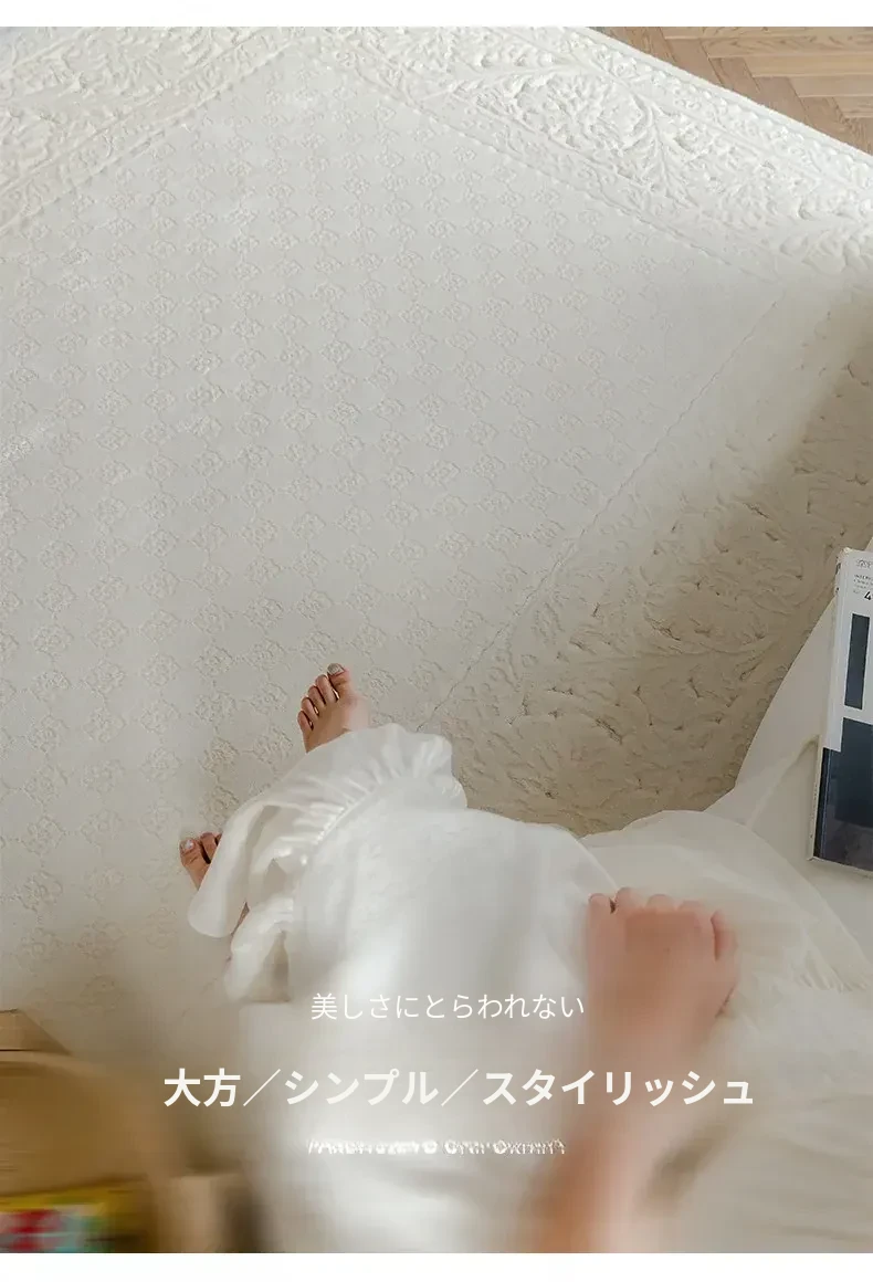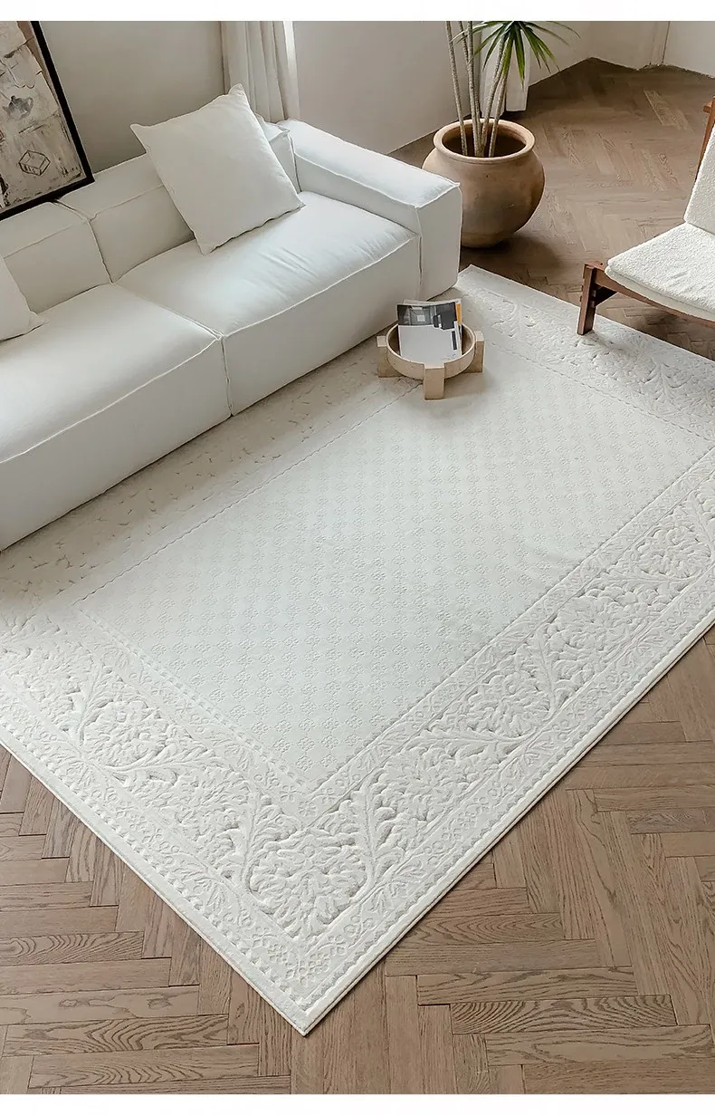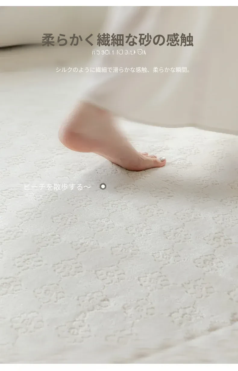 視覚と味覚を刺激するフレンチアンティークスタイルのクリーム色ラグ、厚手で高級感溢れ、接着剤不要。寝室やリビングに最適な防音効果で、心地よい空間を演出します。