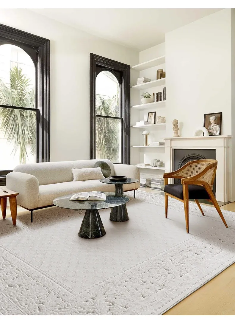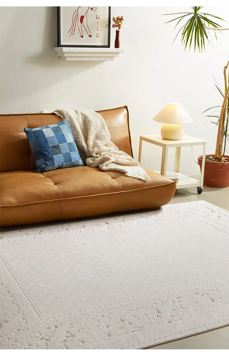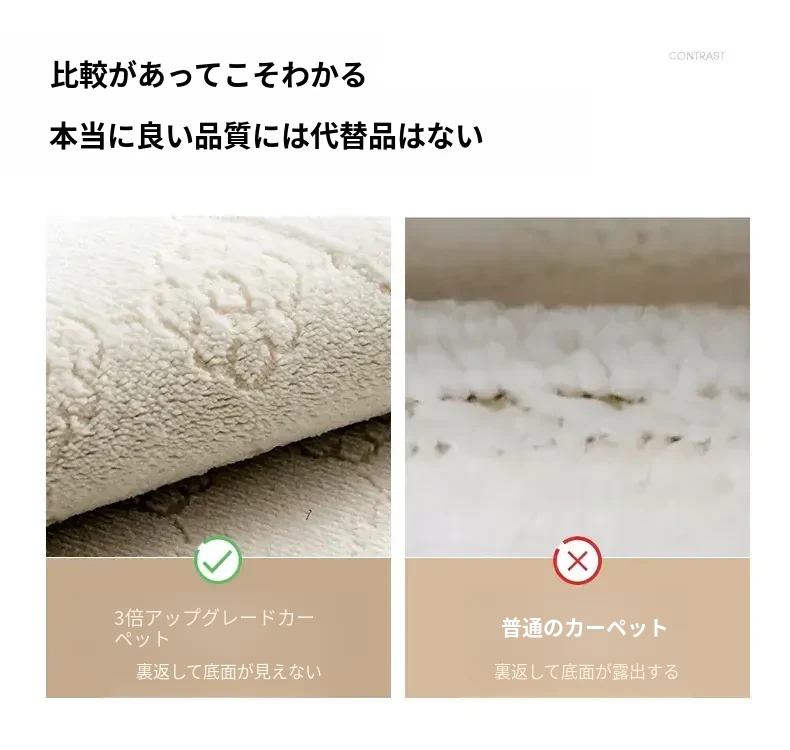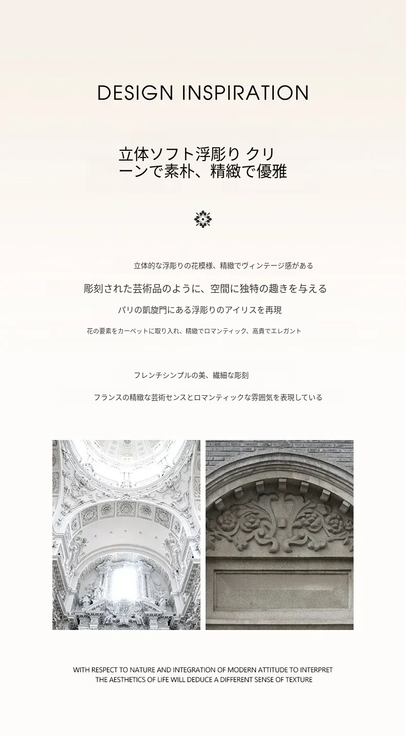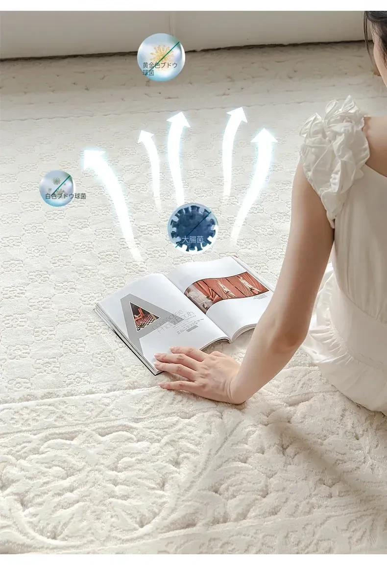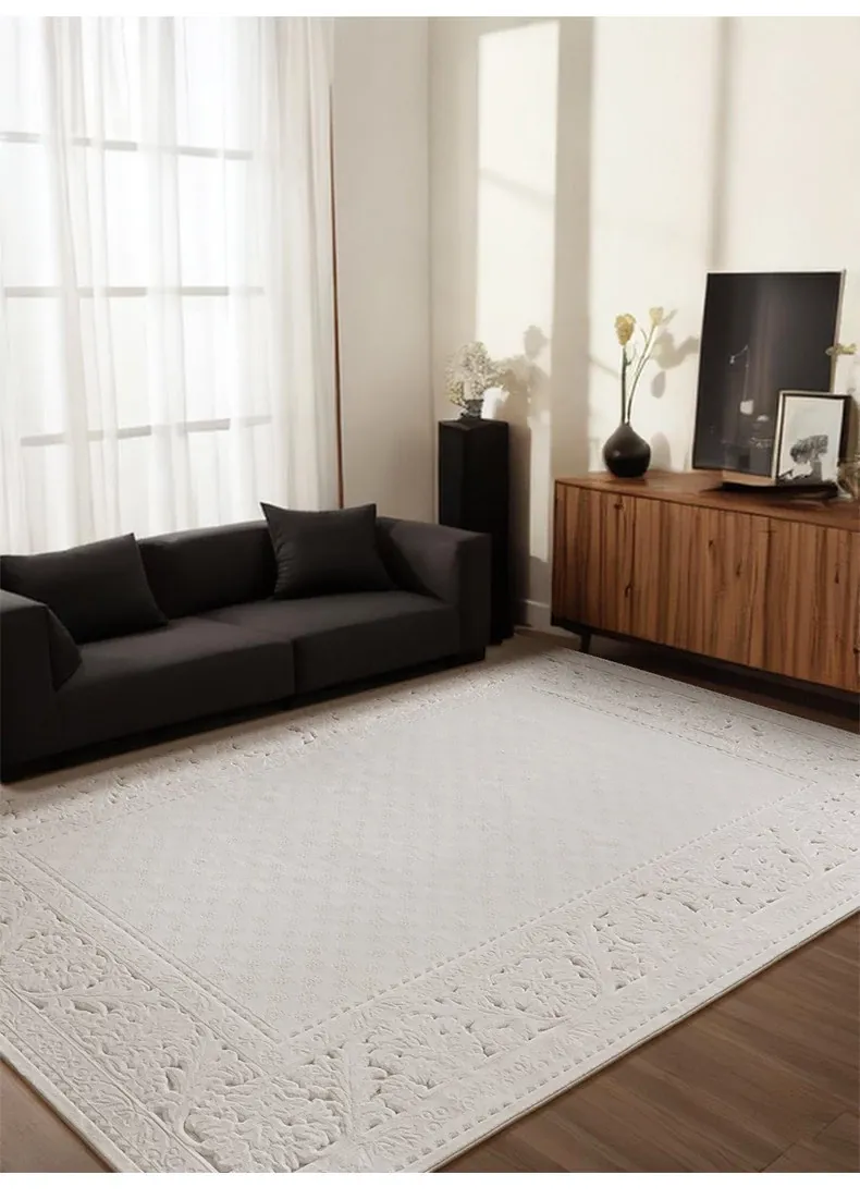 視覚と味覚を刺激するフレンチアンティークスタイルのクリーム色ラグ、厚手で高級感溢れ、接着剤不要。寝室やリビングに最適な防音効果で、心地よい空間を演出します。