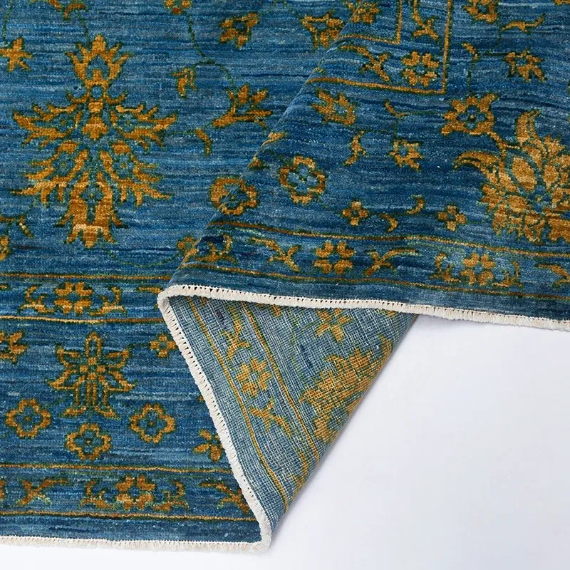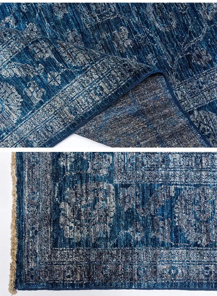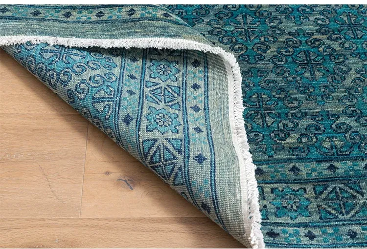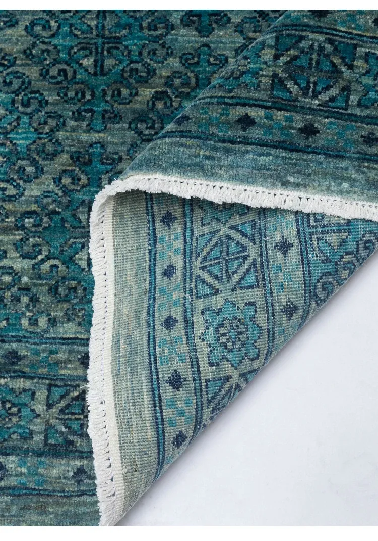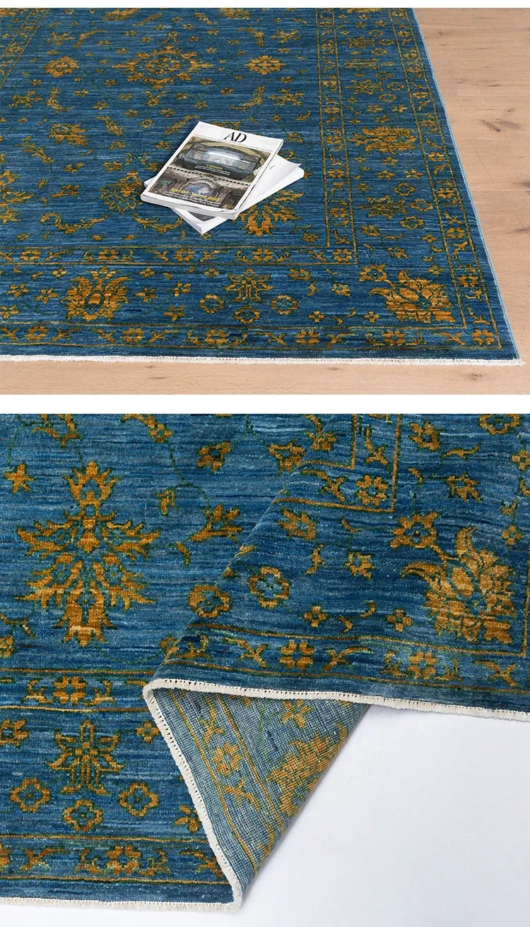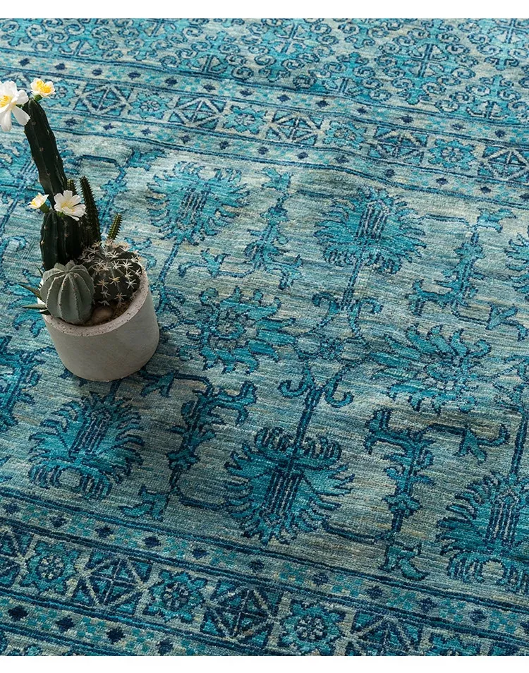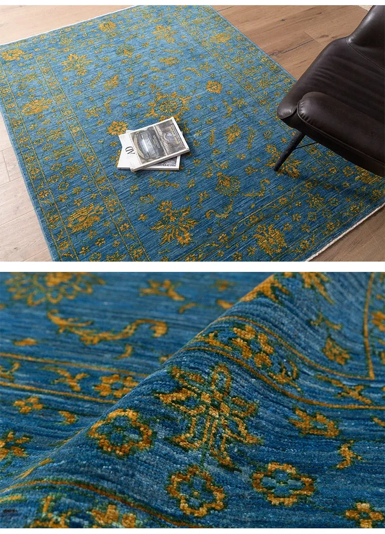 アフガニスタン直輸入の新古典スタイル、豪華なブルー系手織りウールラグ。高級感溢れるヴィンテージデザインで、あなたの空間を優雅に演出します。手作りの温もりを感じる特別な一枚をお楽しみください。