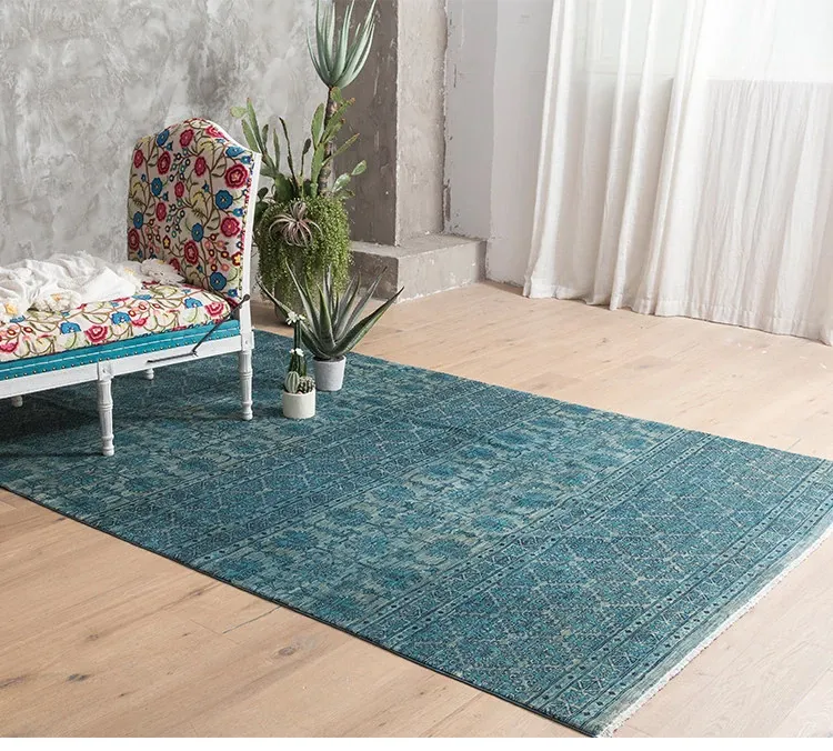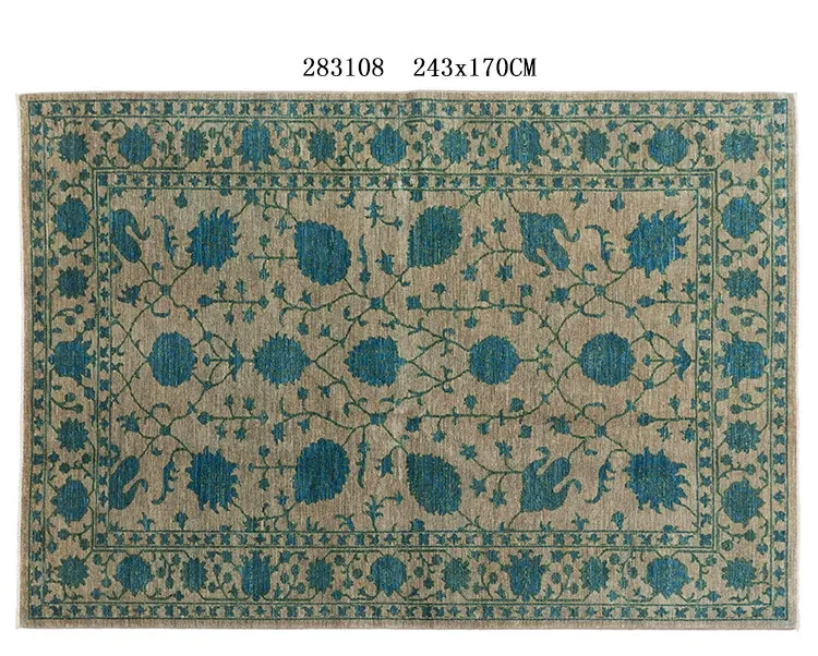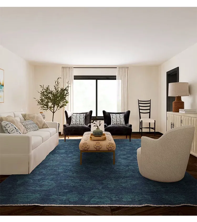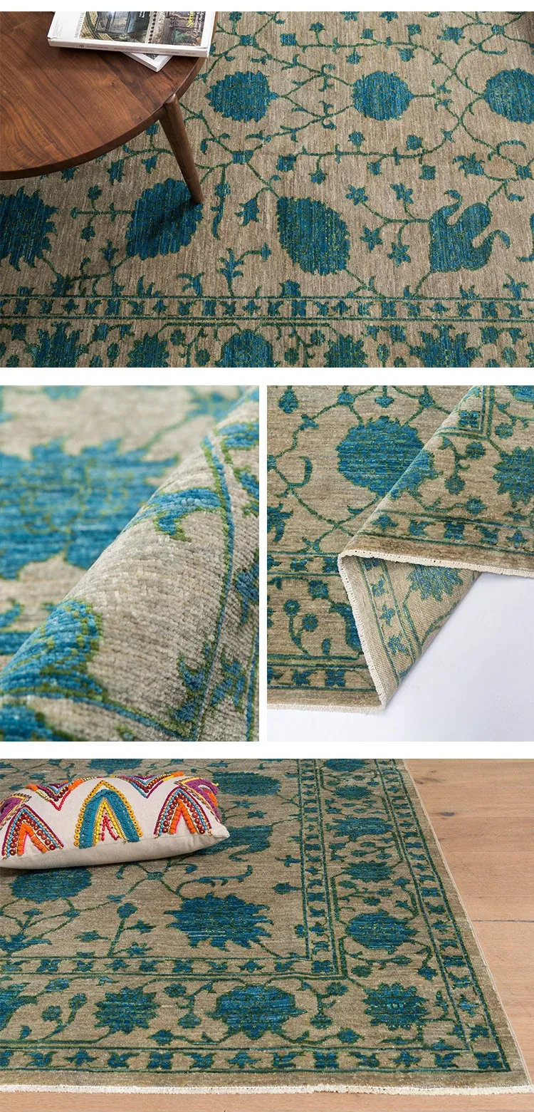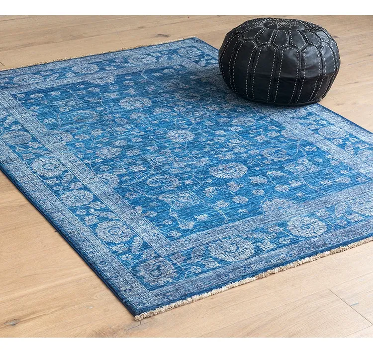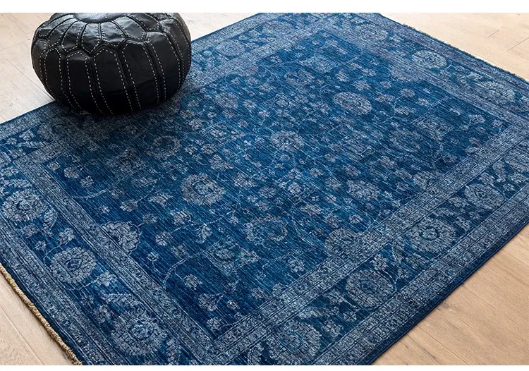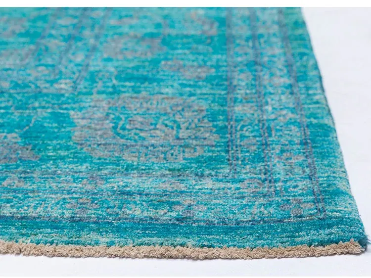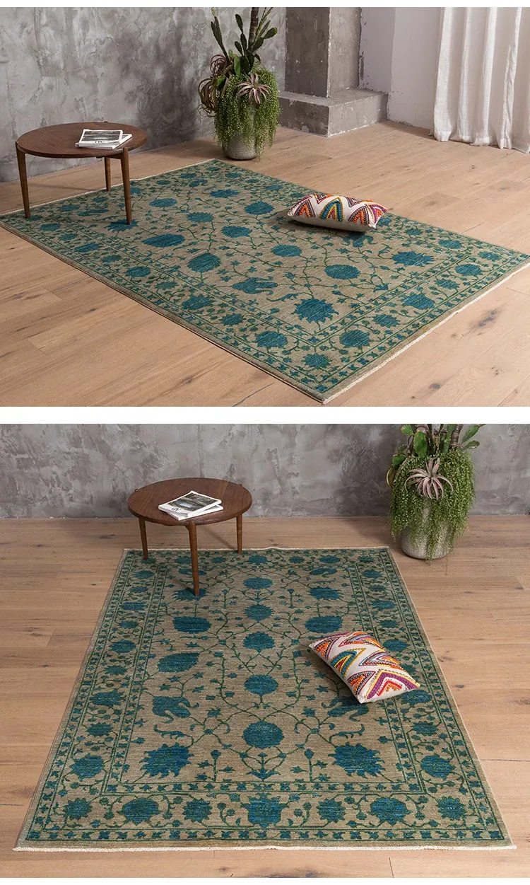 アフガニスタン直輸入の新古典スタイル、豪華なブルー系手織りウールラグ。高級感溢れるヴィンテージデザインで、あなたの空間を優雅に演出します。手作りの温もりを感じる特別な一枚をお楽しみください。