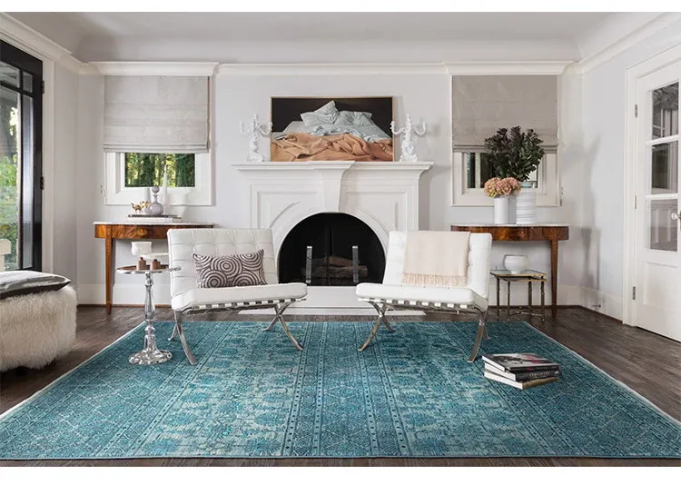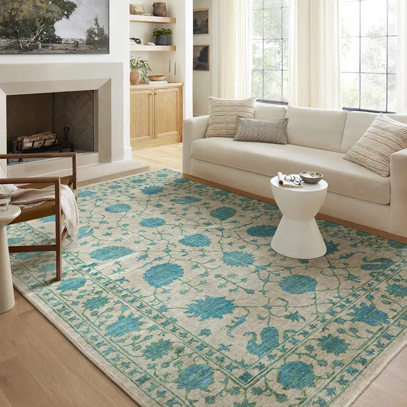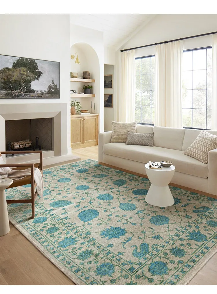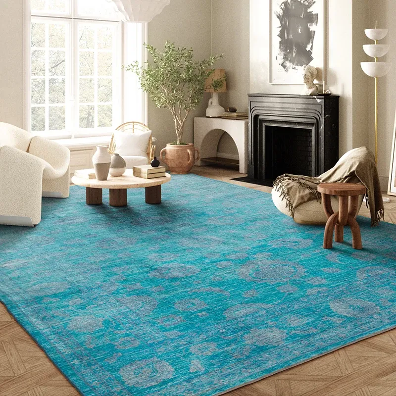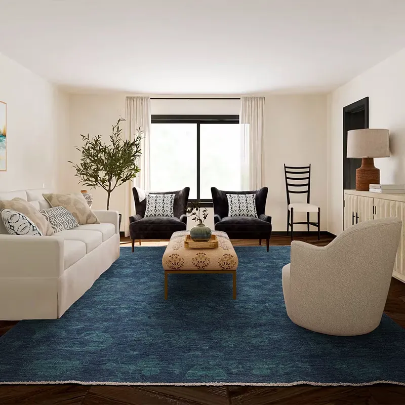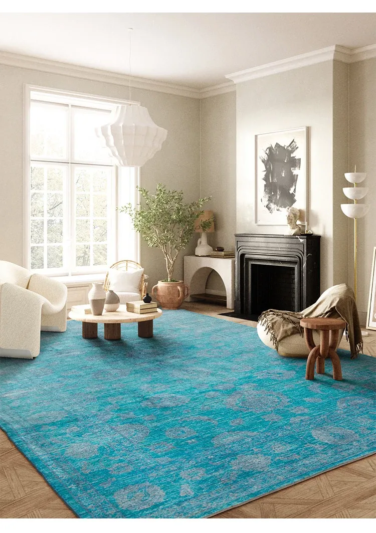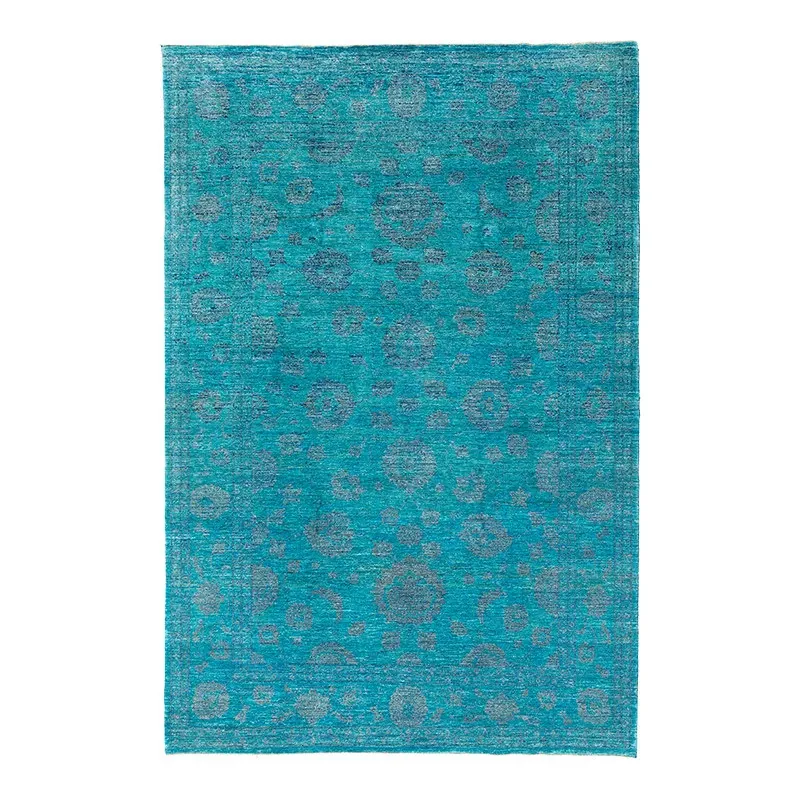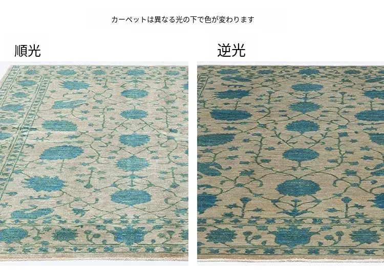 アフガニスタン直輸入の新古典スタイル、豪華なブルー系手織りウールラグ。高級感溢れるヴィンテージデザインで、あなたの空間を優雅に演出します。手作りの温もりを感じる特別な一枚をお楽しみください。