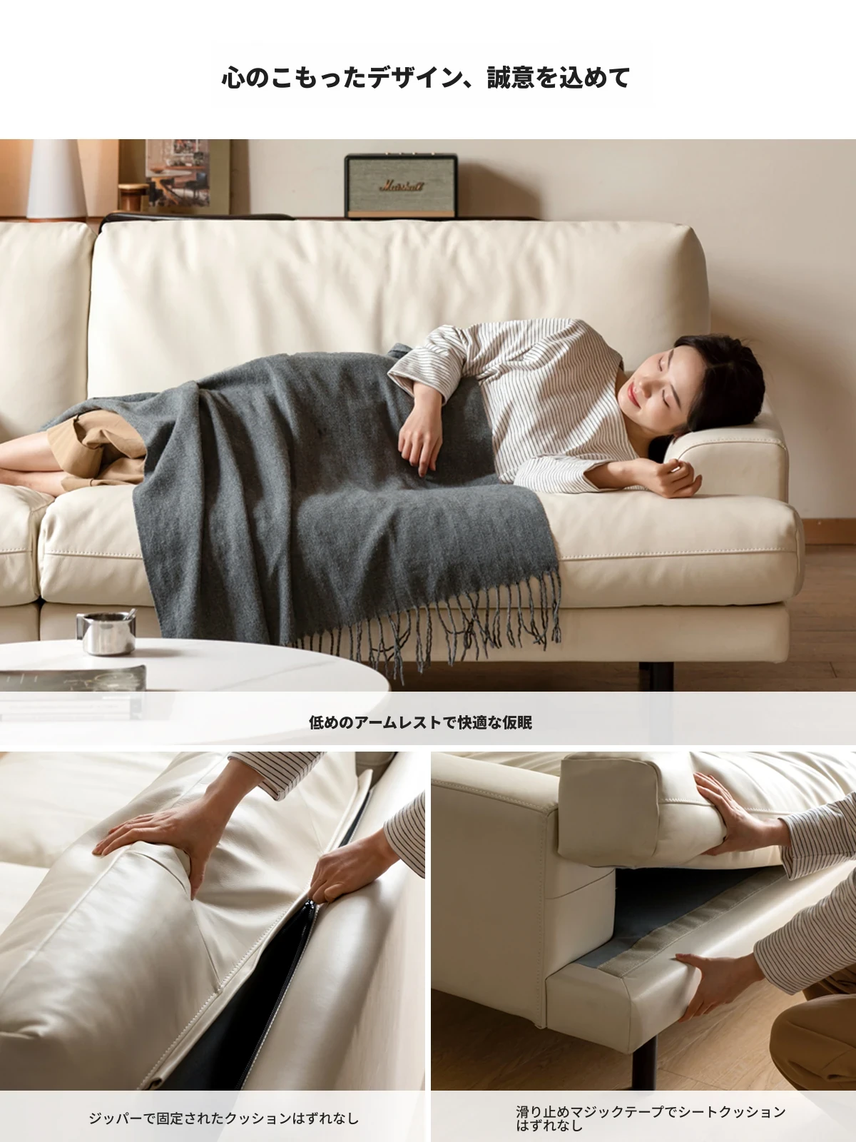 【心地よい極上体験】ヴィシャ本革ソファ - ナチュラルクリームカラー、頭層牛革使用、小型リビングにぴったりのエレガントな3人掛け白ソファ