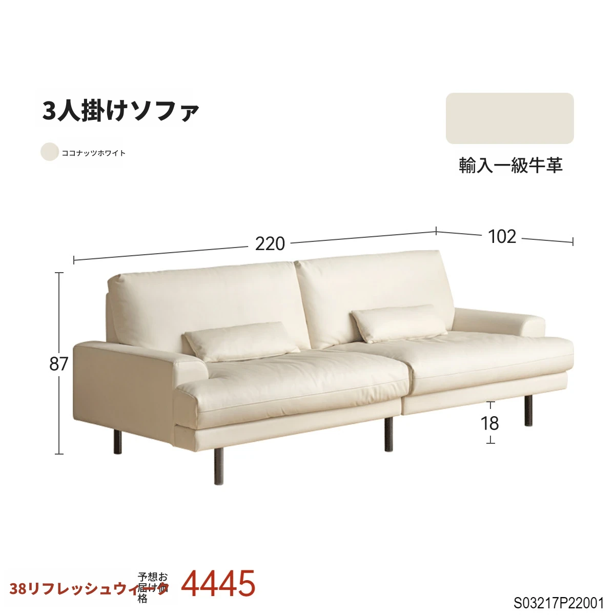2.2メートル3人掛けソファ【ココナッツミルクホワイト-本革】(2200*1020*870mm)