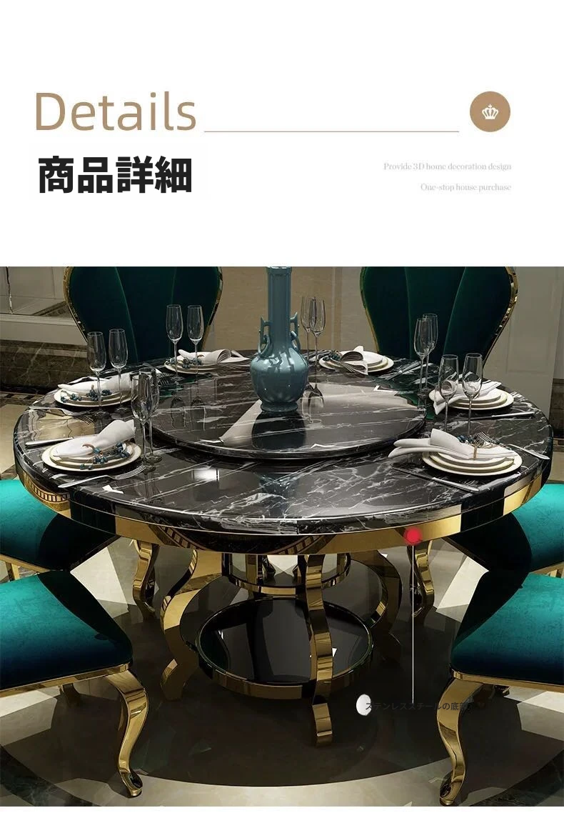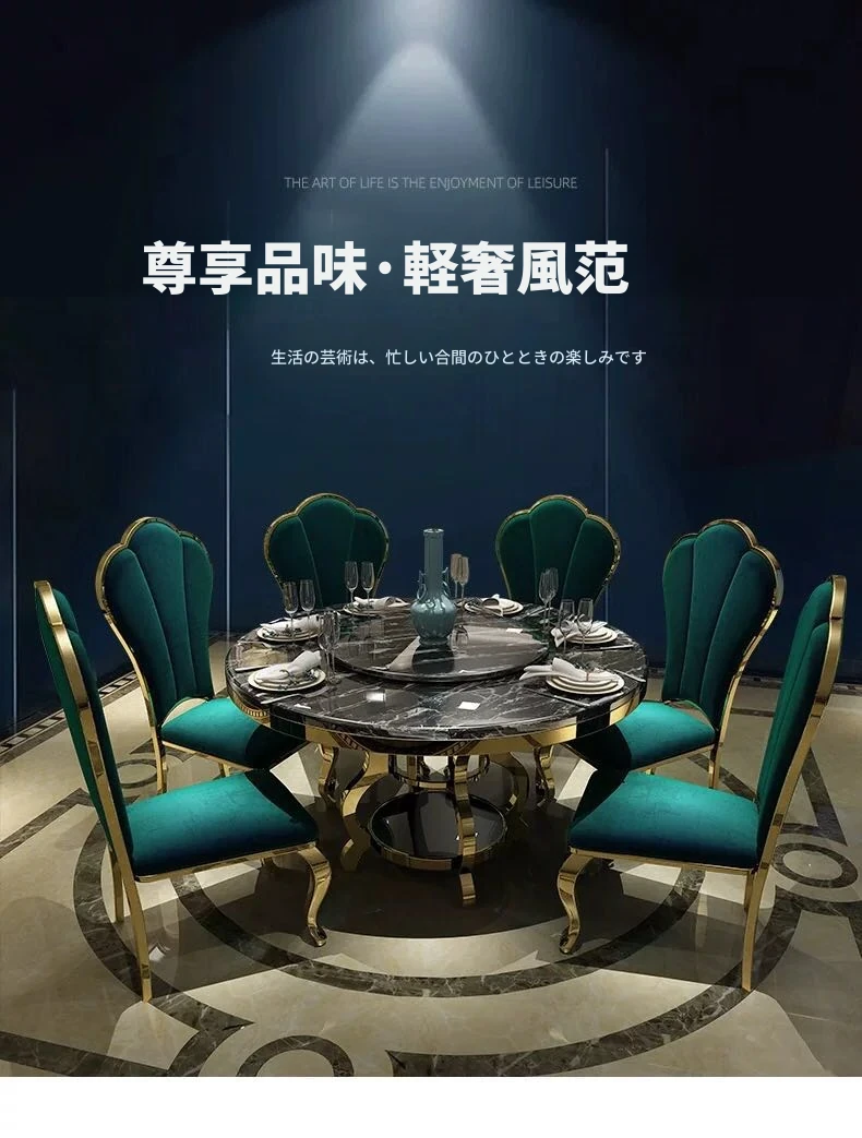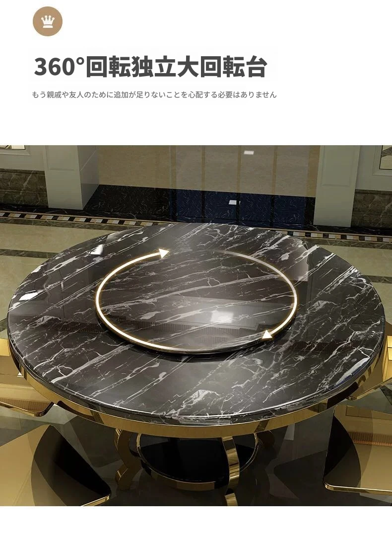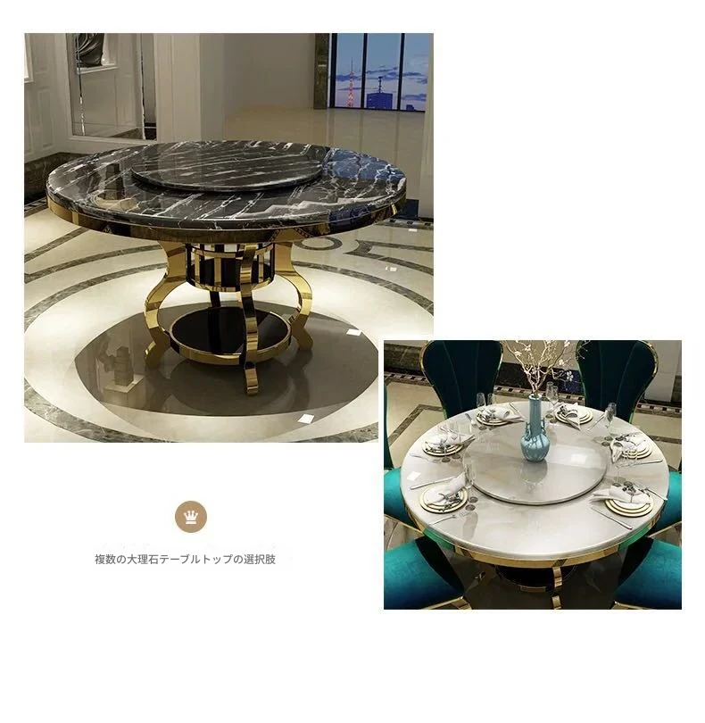 軽奢華な丸型ステンレス鋼製大理石ダイニングテーブル - シンプルでモダンなデザイン、回転盤付き、家庭用・ホテル用に最適な高級岩板製ラウンドテーブル!おしゃれな食卓で特別なひとときを演出します。
