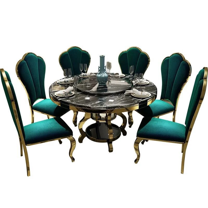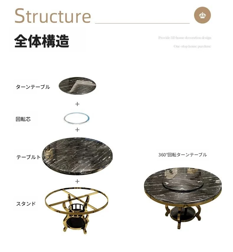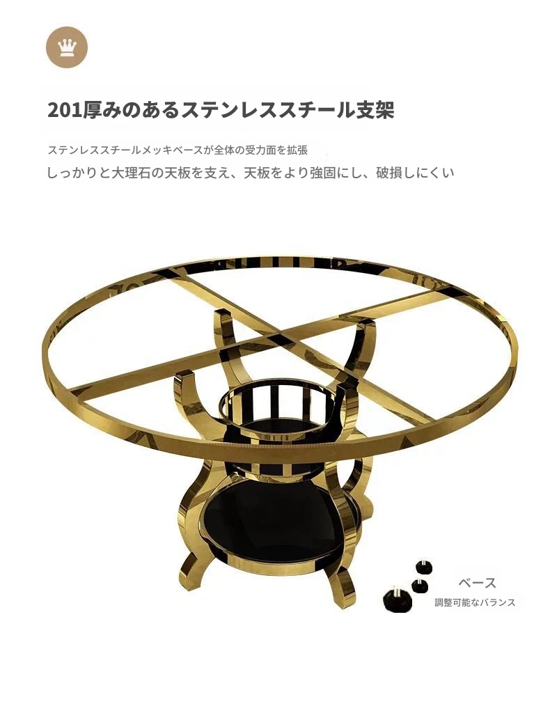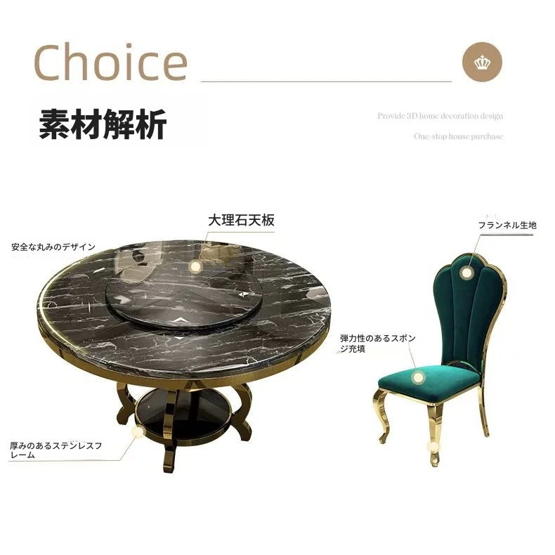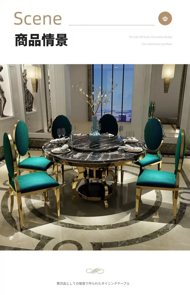 軽奢華な丸型ステンレス鋼製大理石ダイニングテーブル - シンプルでモダンなデザイン、回転盤付き、家庭用・ホテル用に最適な高級岩板製ラウンドテーブル!おしゃれな食卓で特別なひとときを演出します。