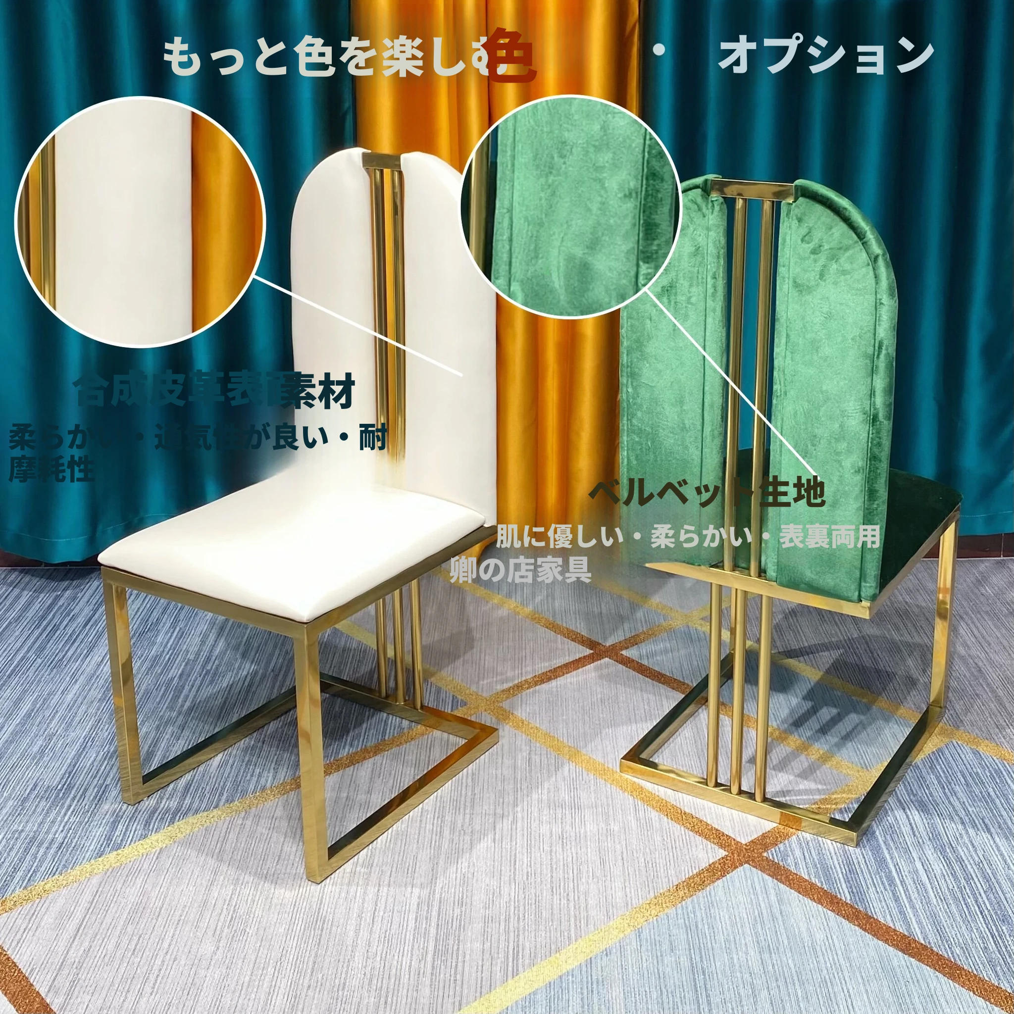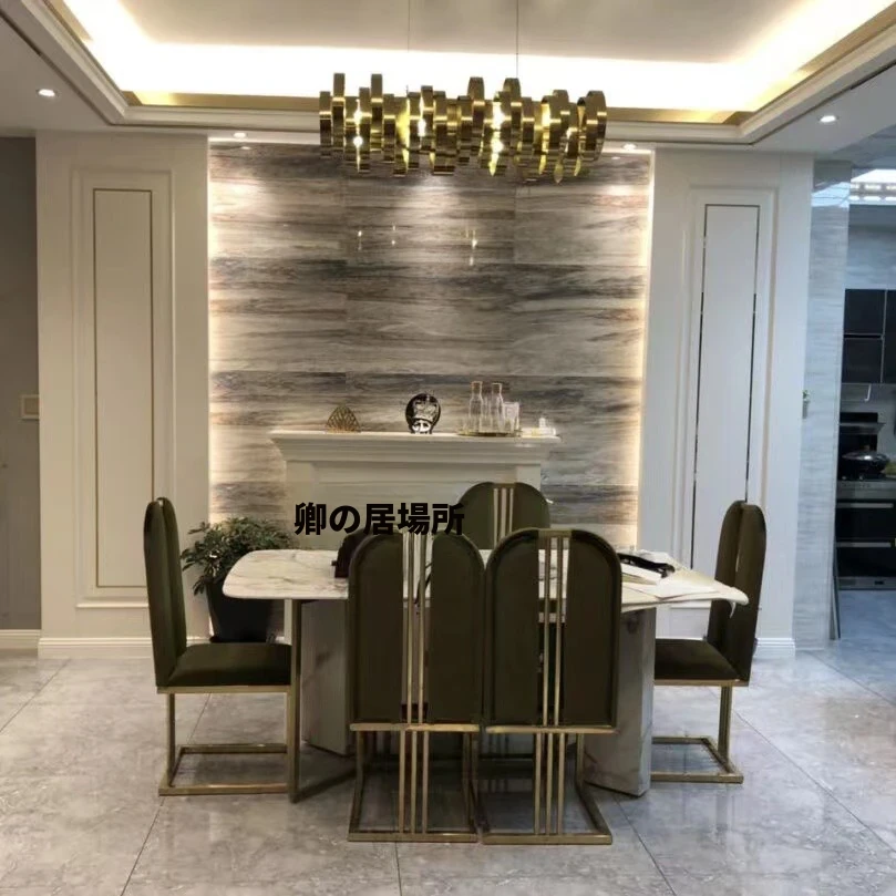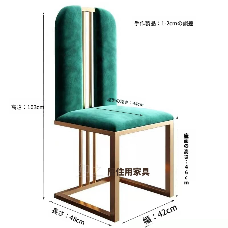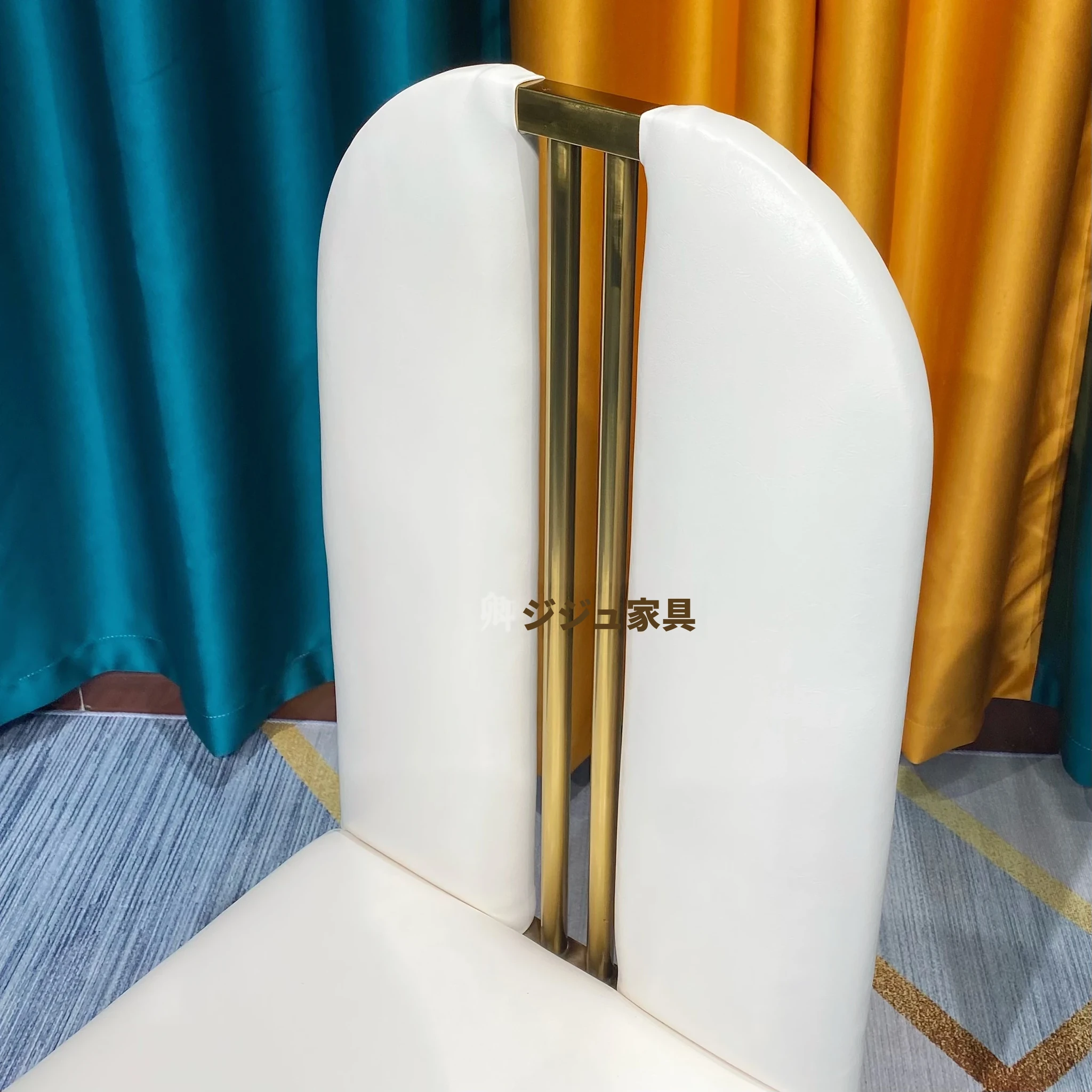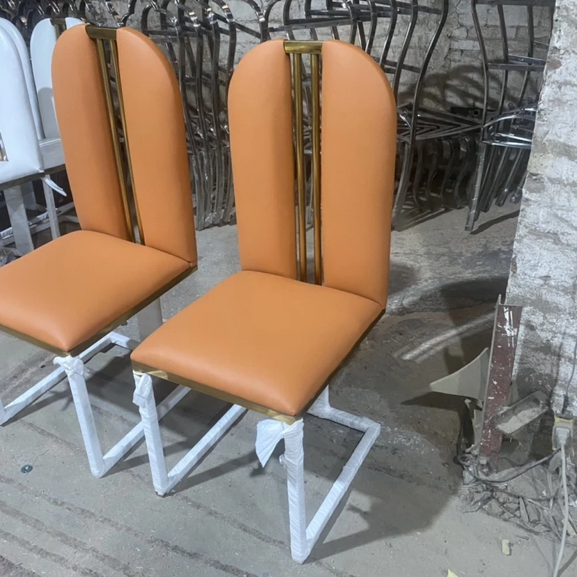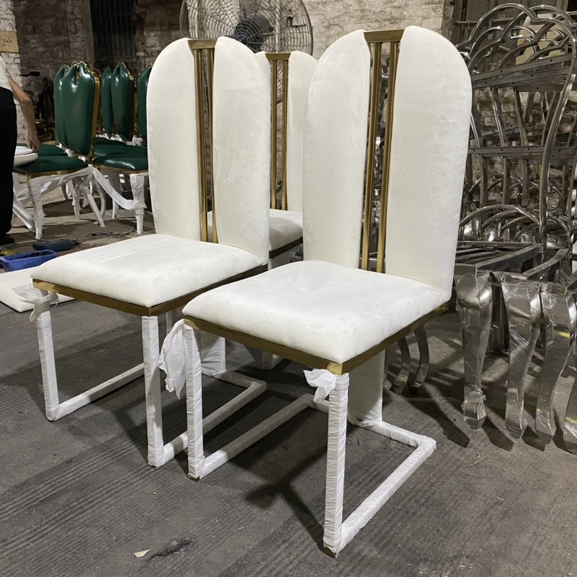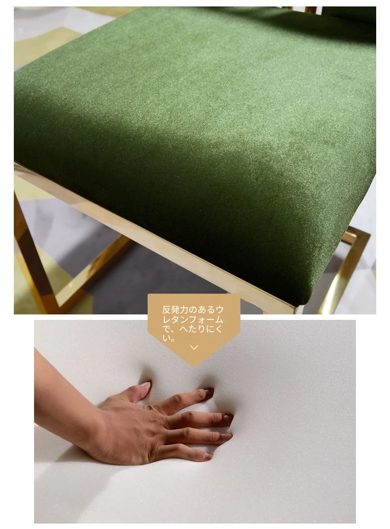 軽やかな高級感のあるステンレススチール製ゴールドファブリックダイニングチェア、スタイリッシュでクリエイティブなカフェ用、家庭用に最適な背もたれ付き超ファイバー皮製チェア