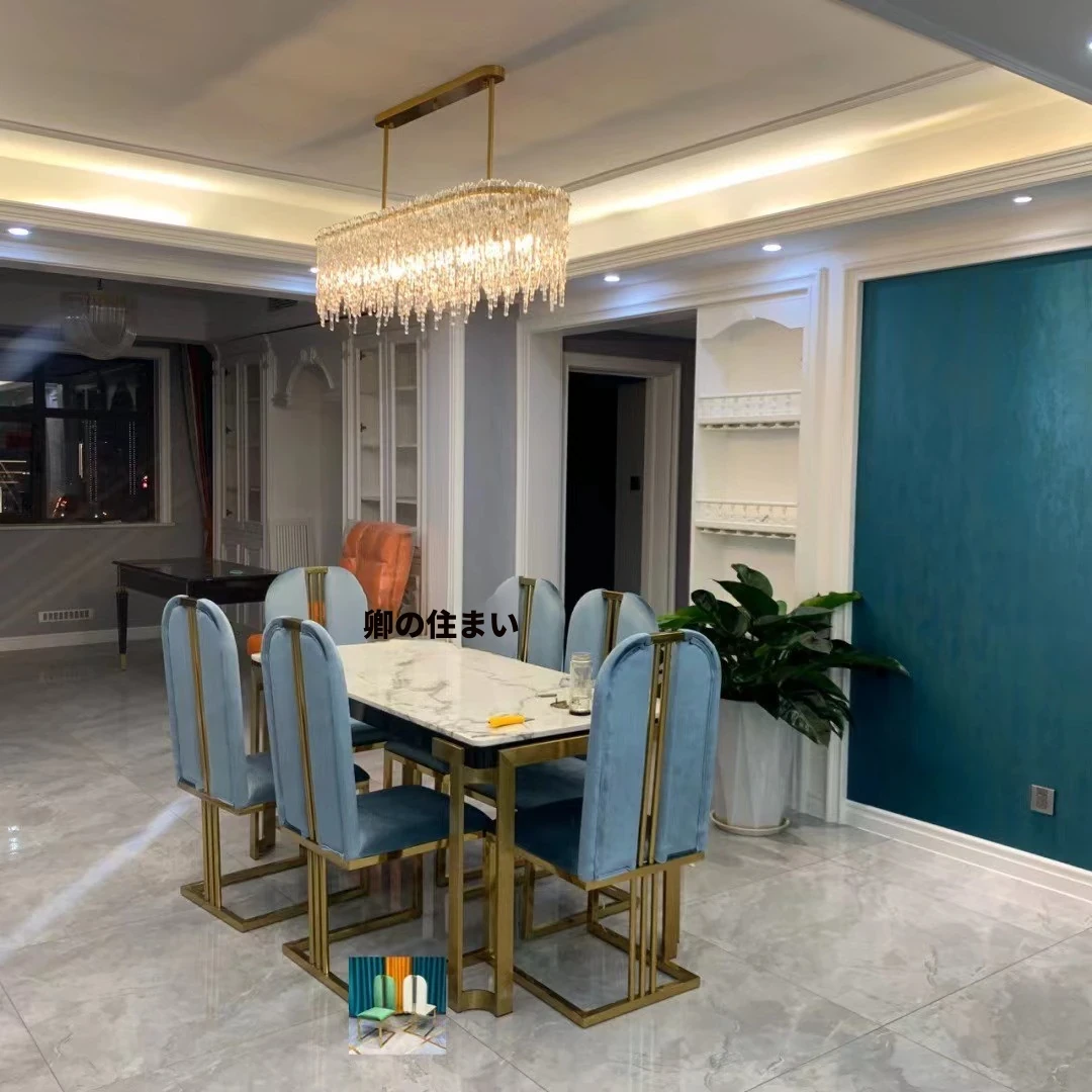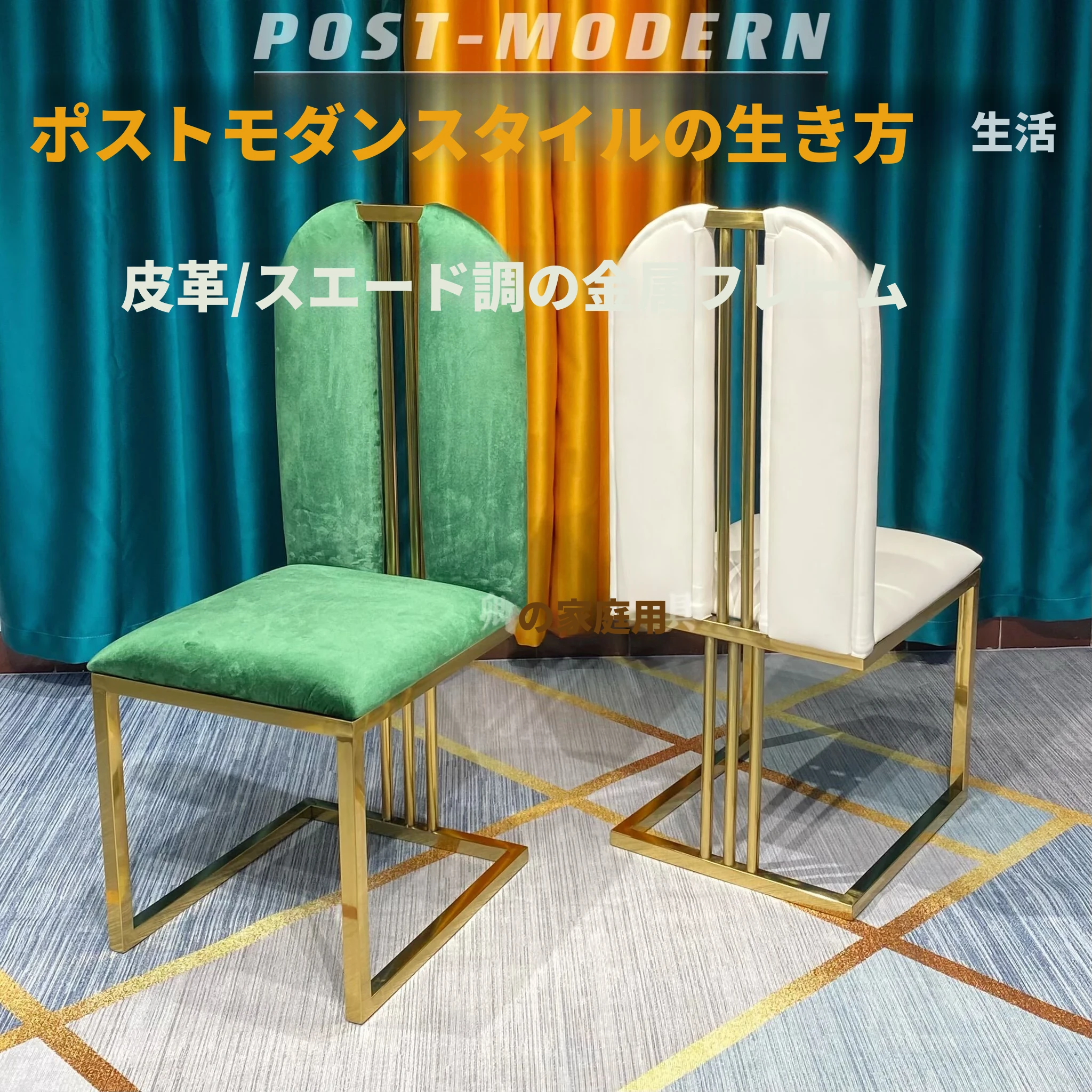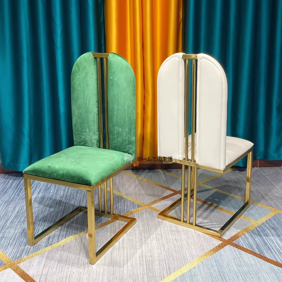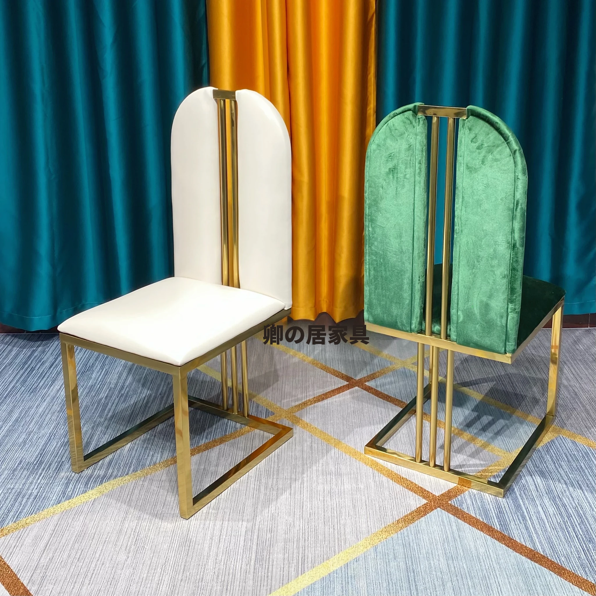 軽やかな高級感のあるステンレススチール製ゴールドファブリックダイニングチェア、スタイリッシュでクリエイティブなカフェ用、家庭用に最適な背もたれ付き超ファイバー皮製チェア