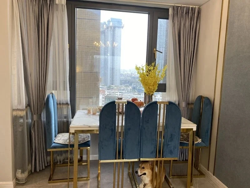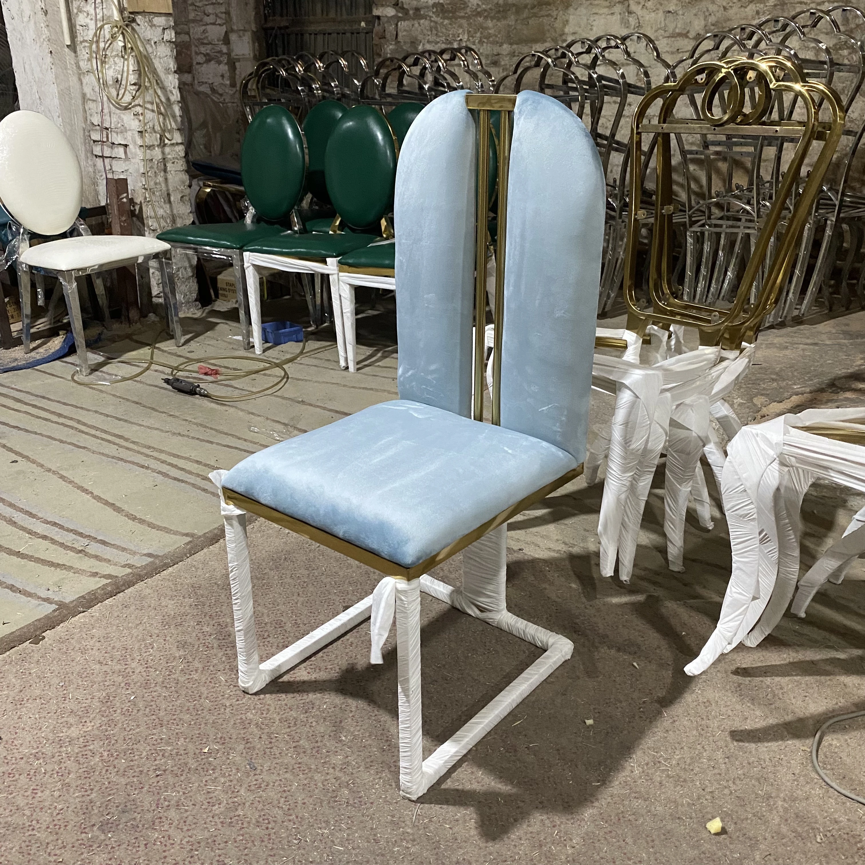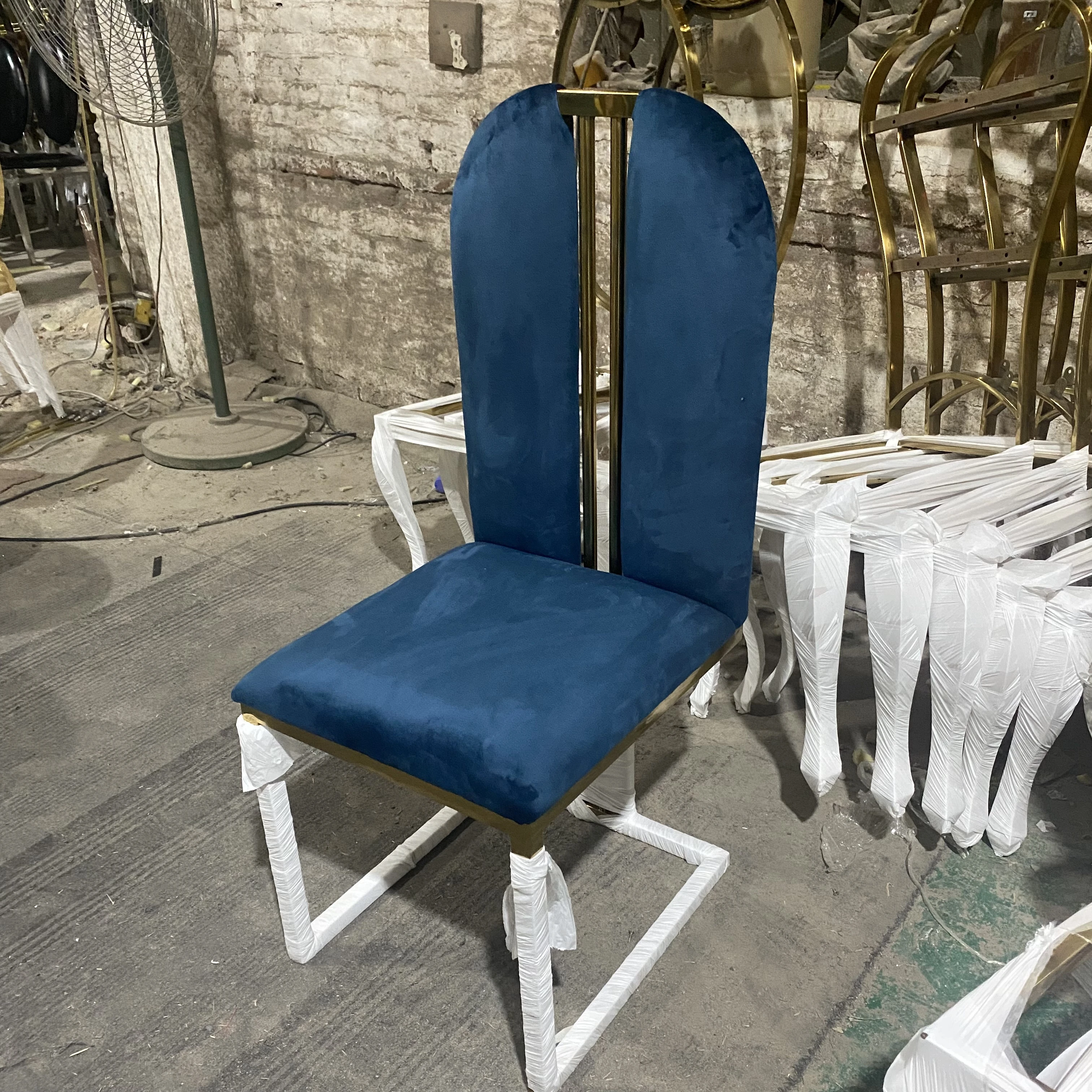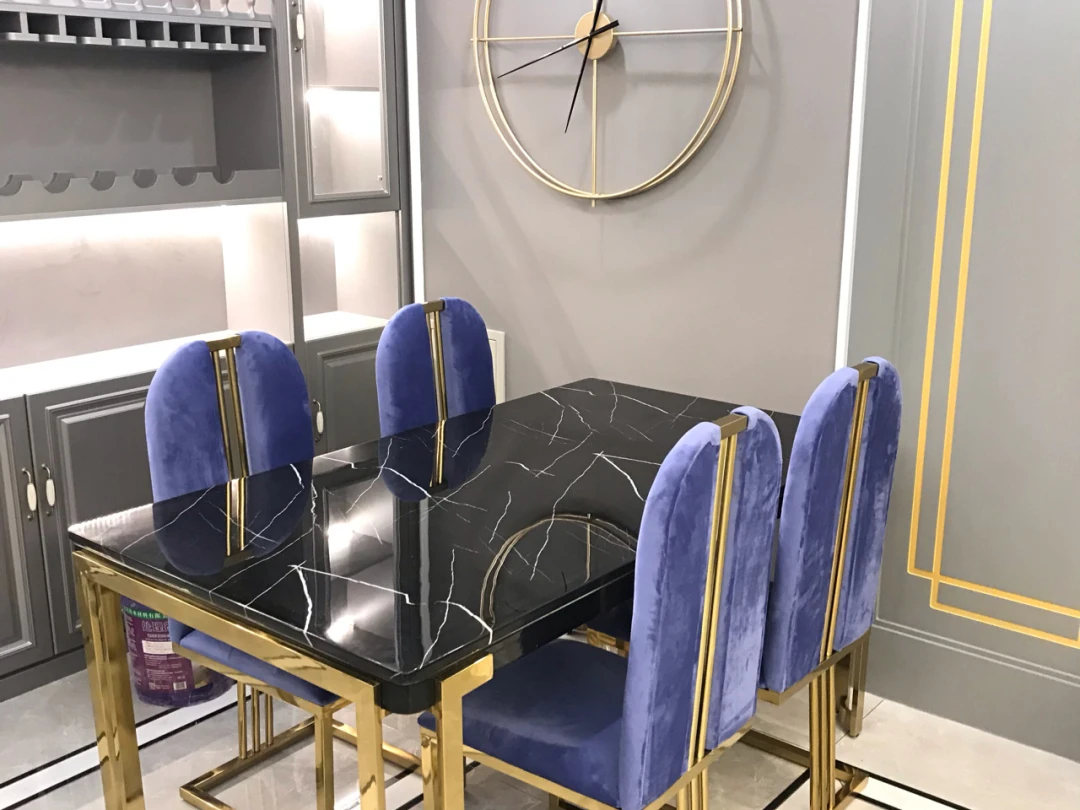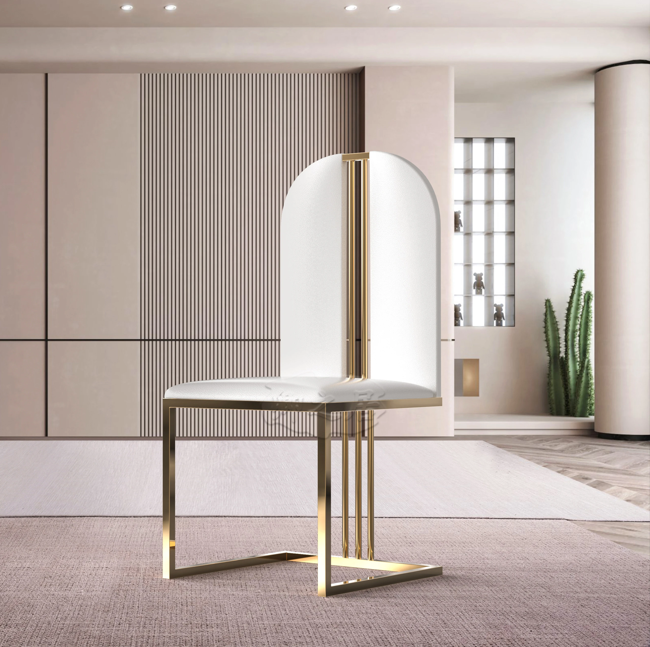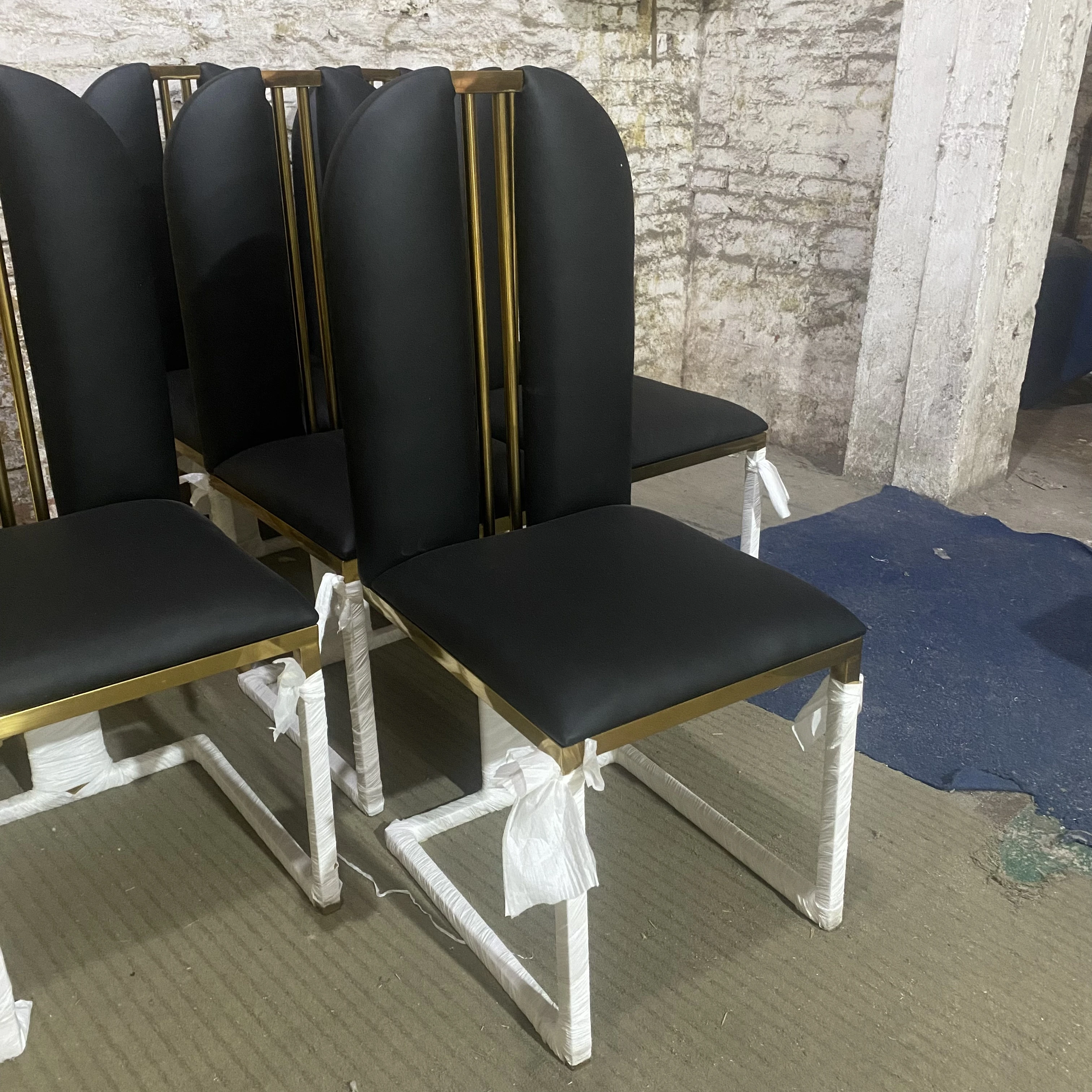 軽やかな高級感のあるステンレススチール製ゴールドファブリックダイニングチェア、スタイリッシュでクリエイティブなカフェ用、家庭用に最適な背もたれ付き超ファイバー皮製チェア