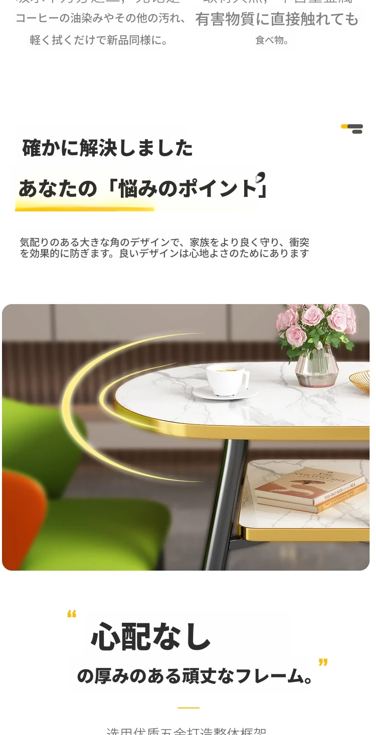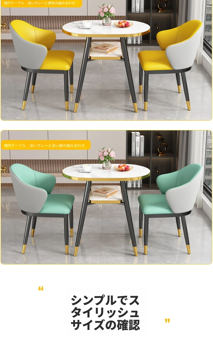 グレーイエロー 80x60 擬似大理石楕円テーブル + 2 レザー椅子