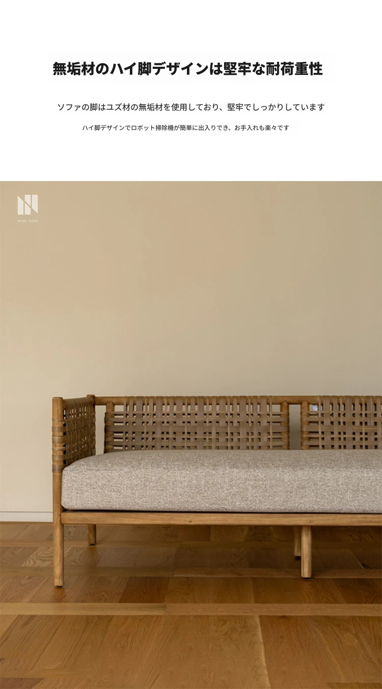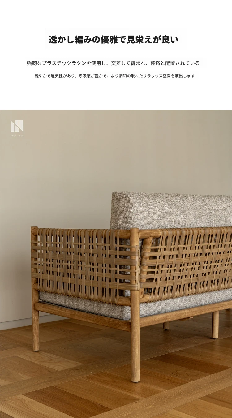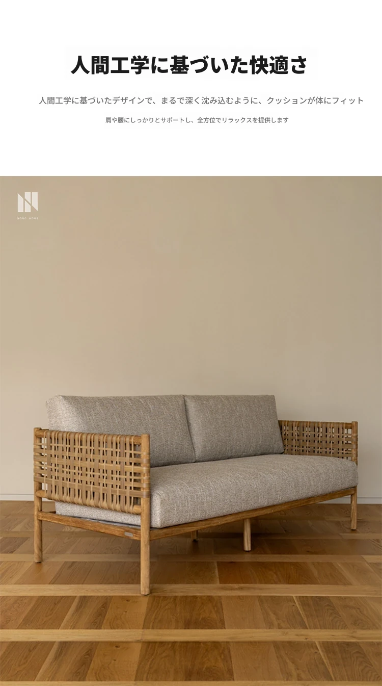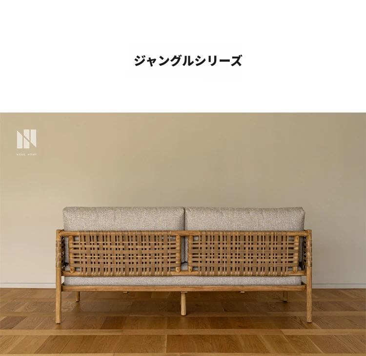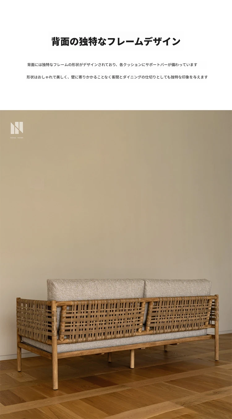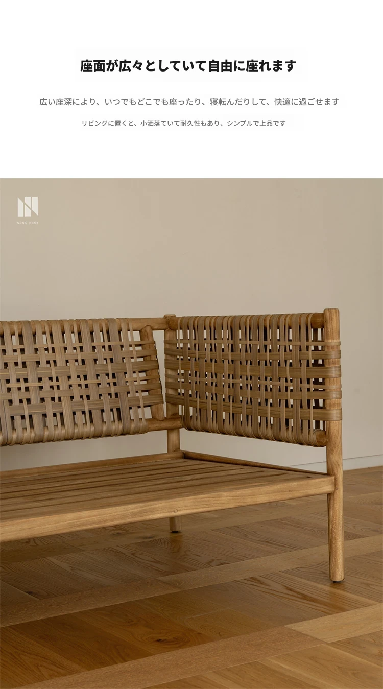 南洋ビンテージ風リビング用無垢材ソファ|和モダンな侘寂スタイルの籐編み3人掛けソファ|民宿やカフェにぴったりのスタイリッシュなカウンターソファ!